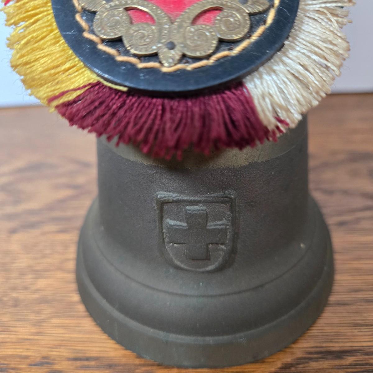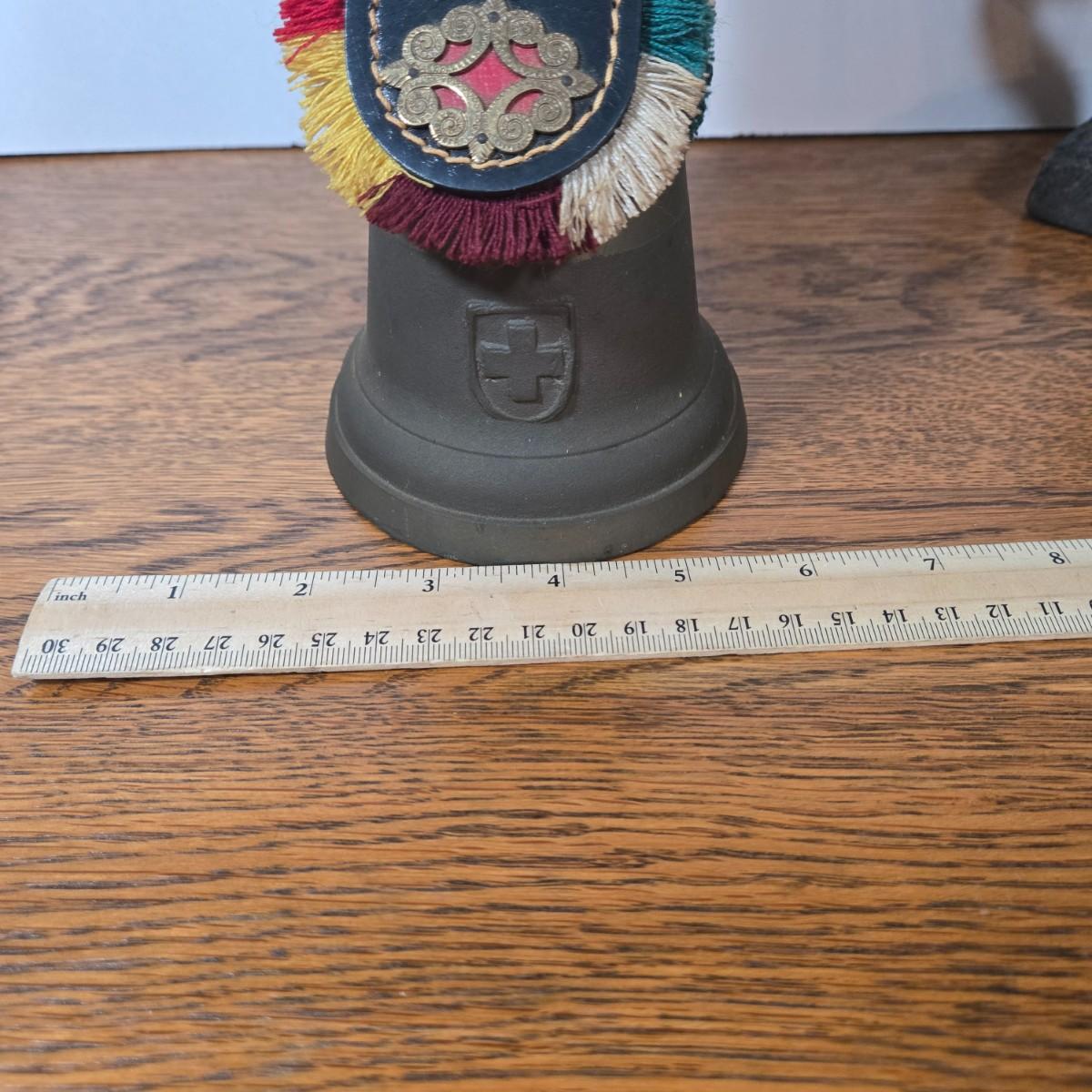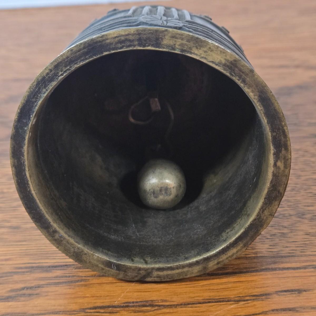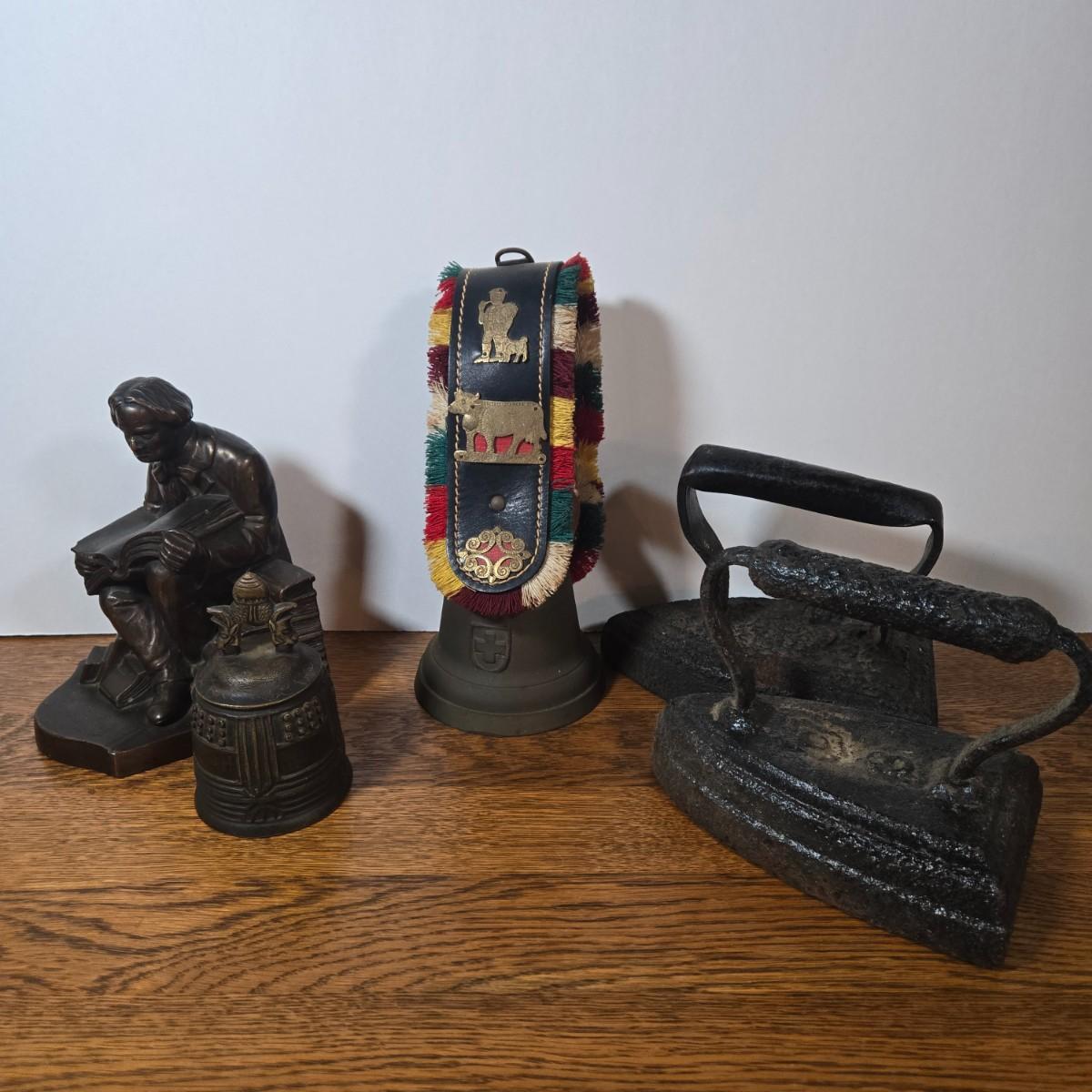 LOT 32D: Swiss Cowbell, Two Cast Iron Sad Irons, Vintage Elbert Hubbard Bookend, and Asian Temple Bell