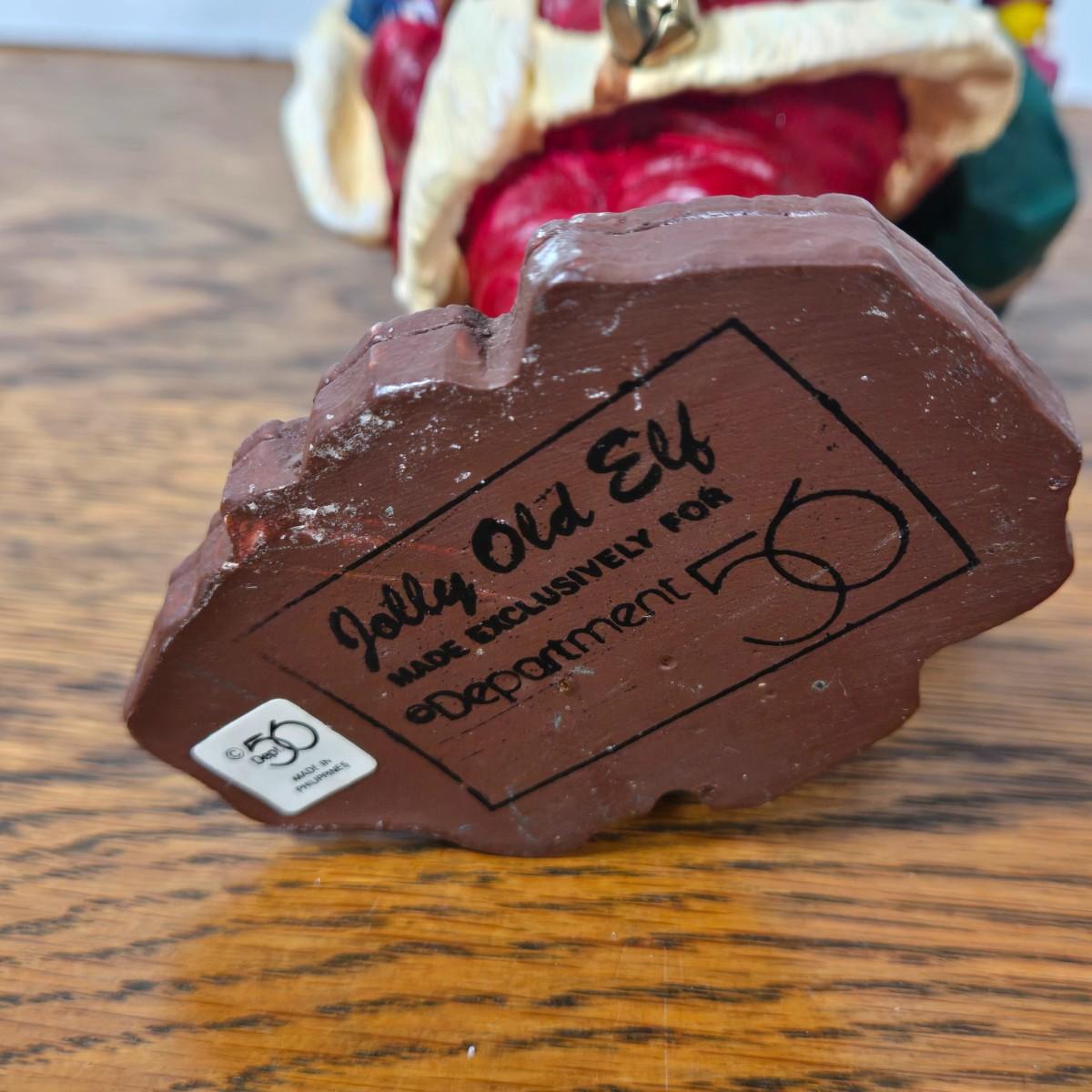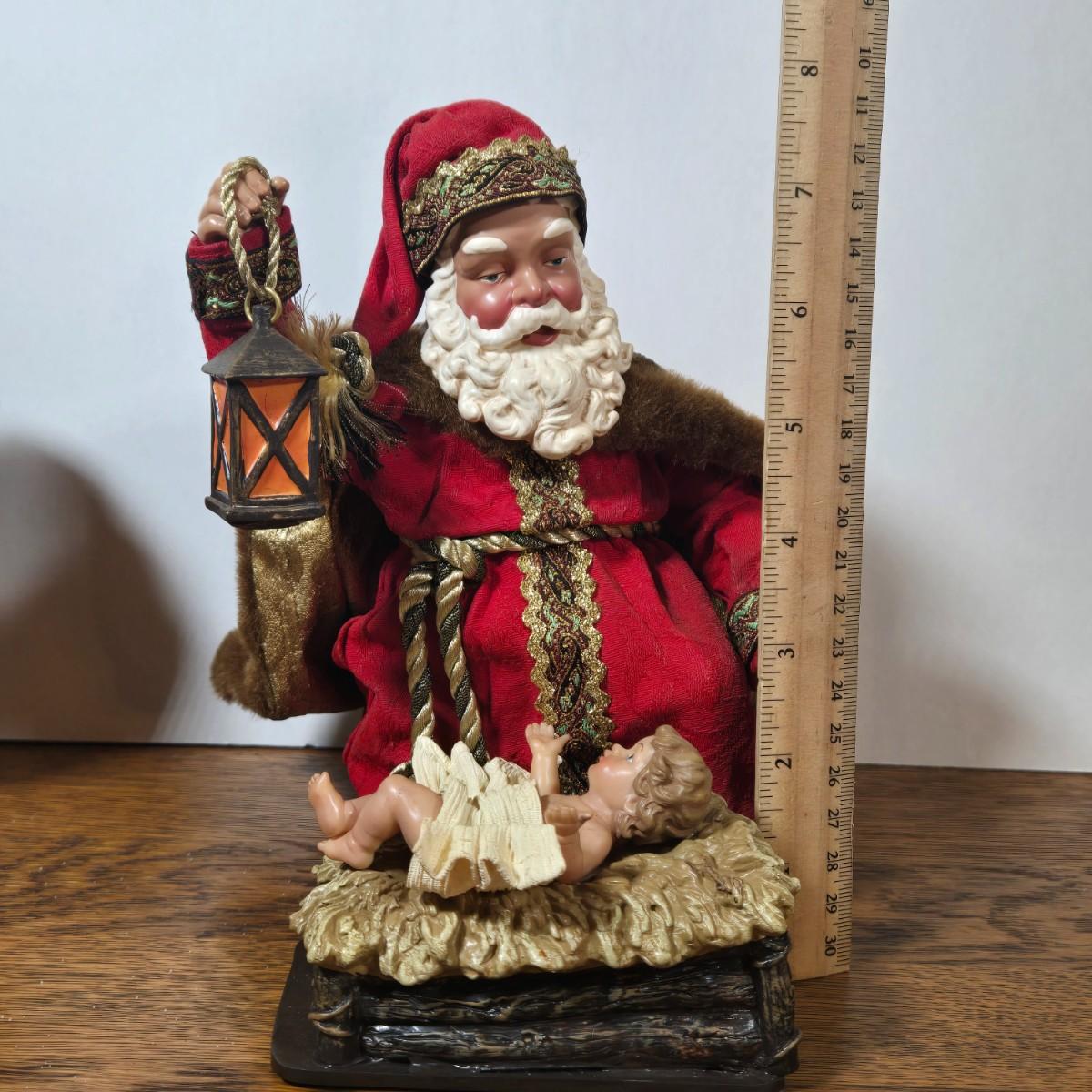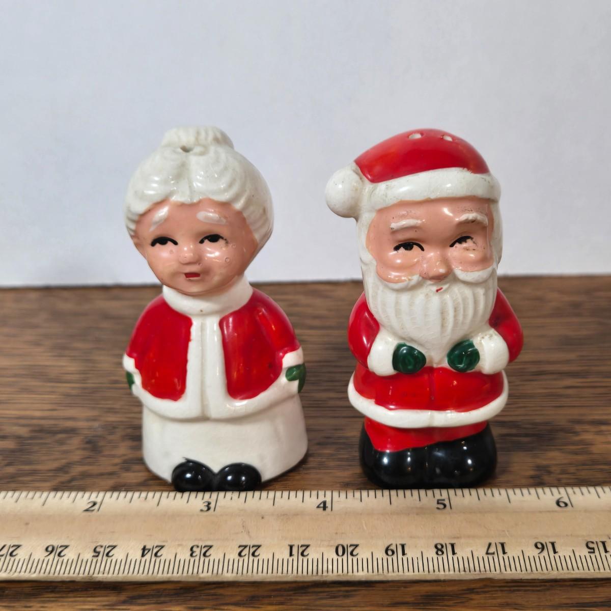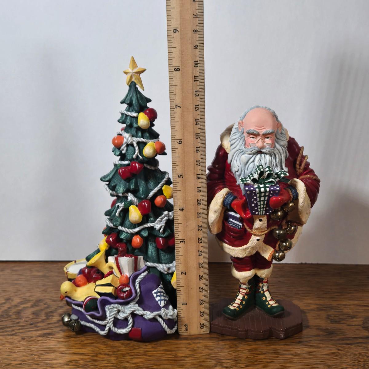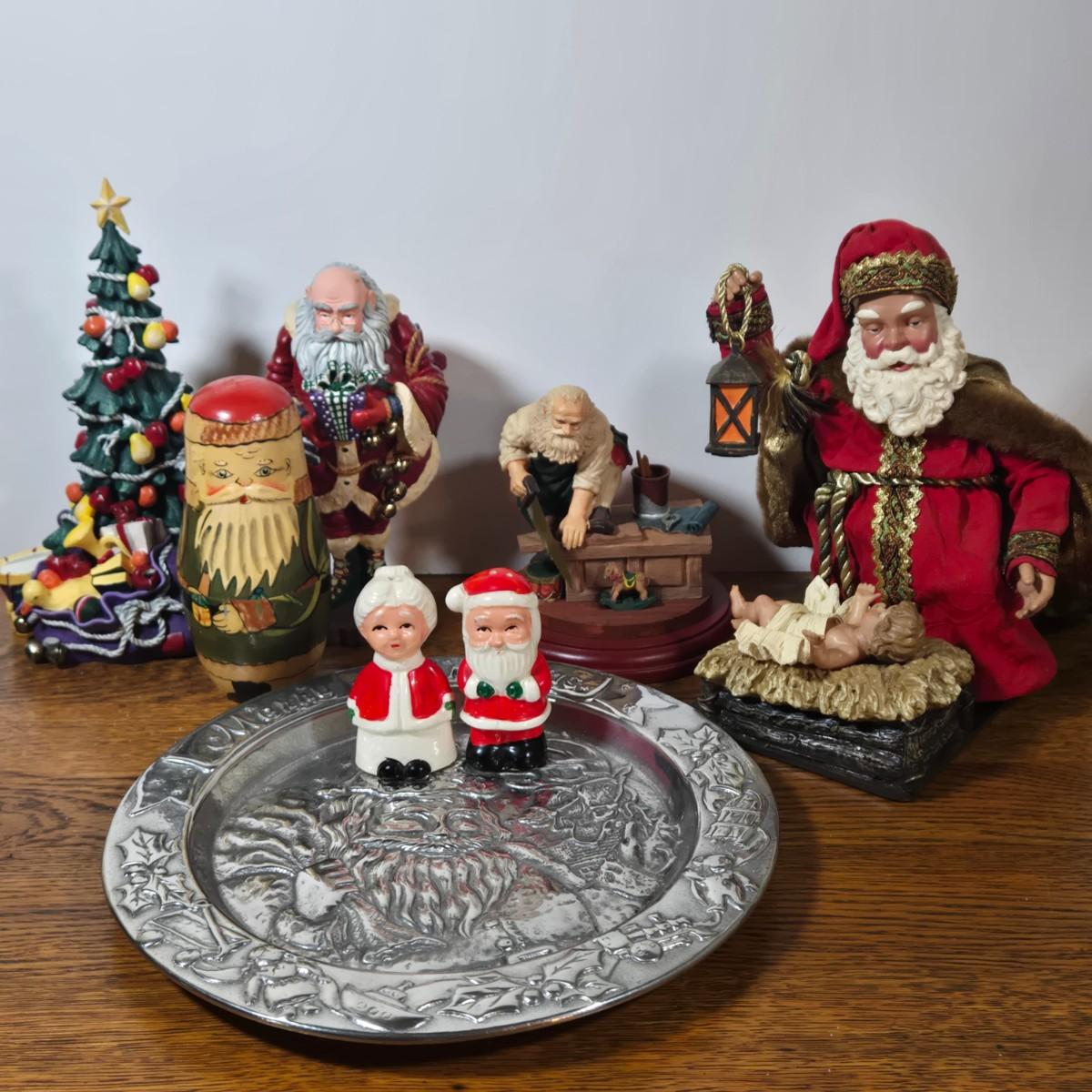 LOT 34L: Metal Christmas Plate, Santa with Baby Jesus, Dept. 56 Christmas Tree & Jolly Old Elf, Santa Workshop Figurine, Mr. & Mrs. Clause Salt & Pepper Shakers, and Vintage Santa Nesting Dolls