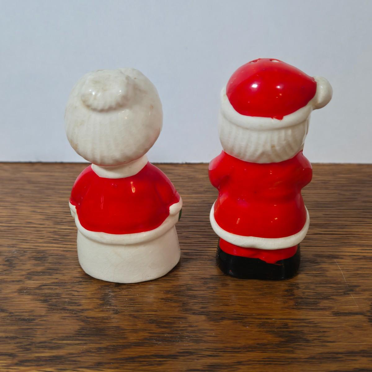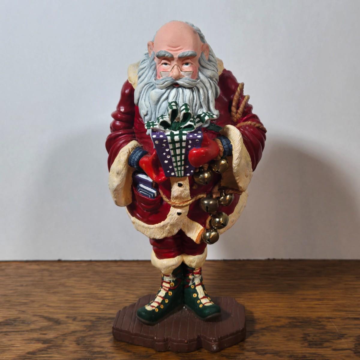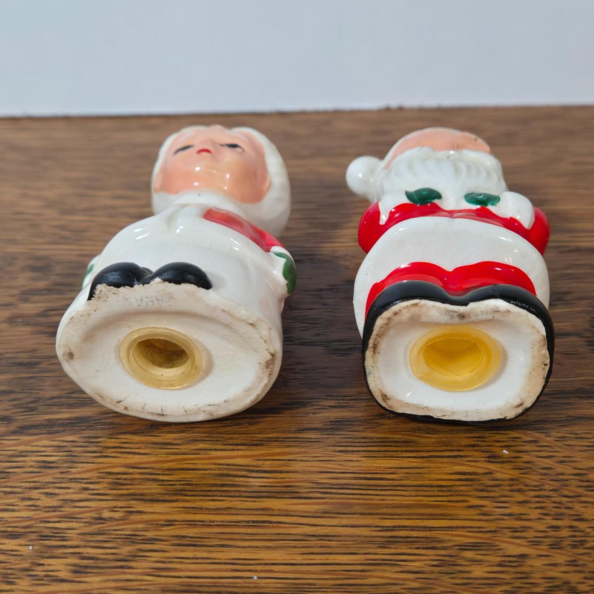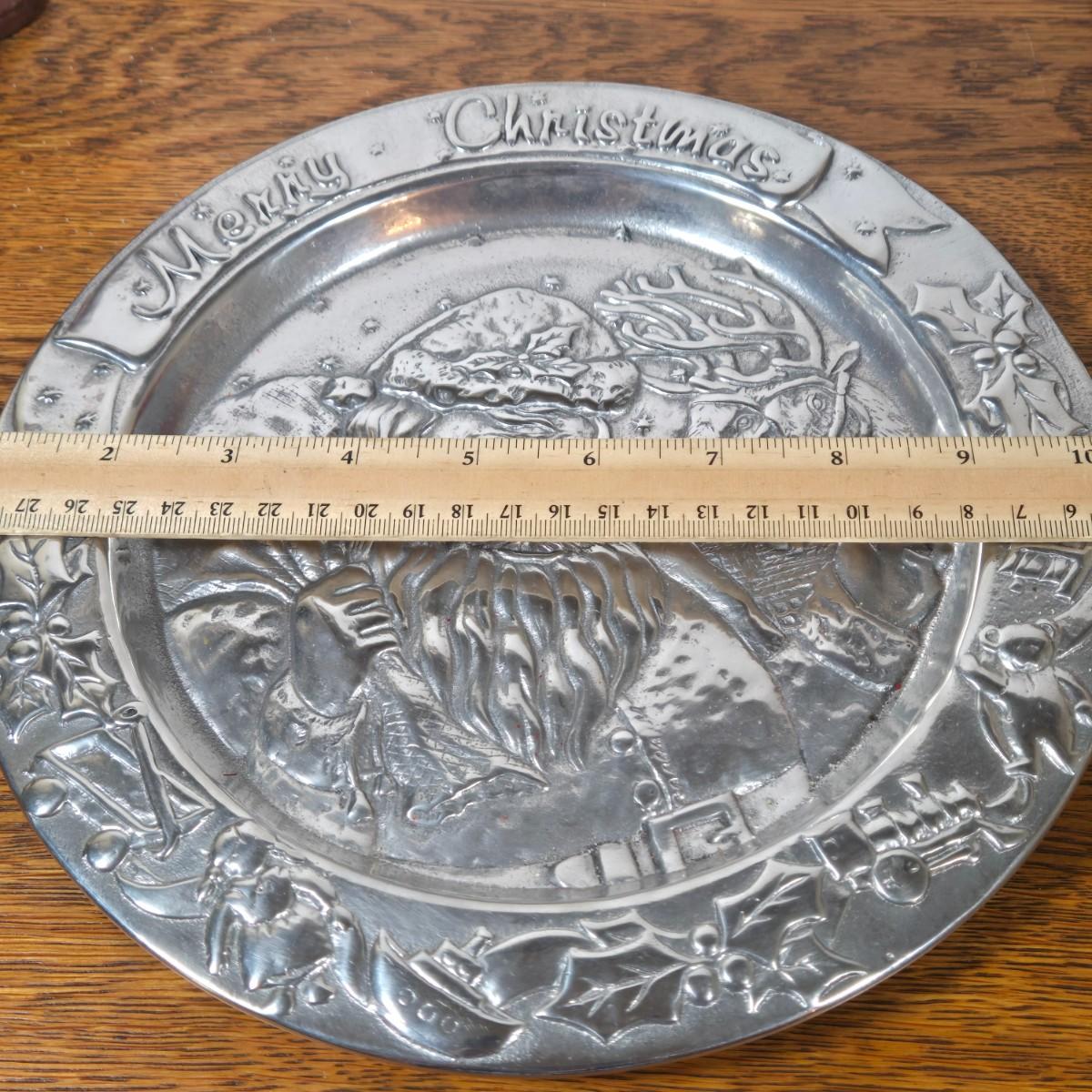 LOT 34L: Metal Christmas Plate, Santa with Baby Jesus, Dept. 56 Christmas Tree & Jolly Old Elf, Santa Workshop Figurine, Mr. & Mrs. Clause Salt & Pepper Shakers, and Vintage Santa Nesting Dolls