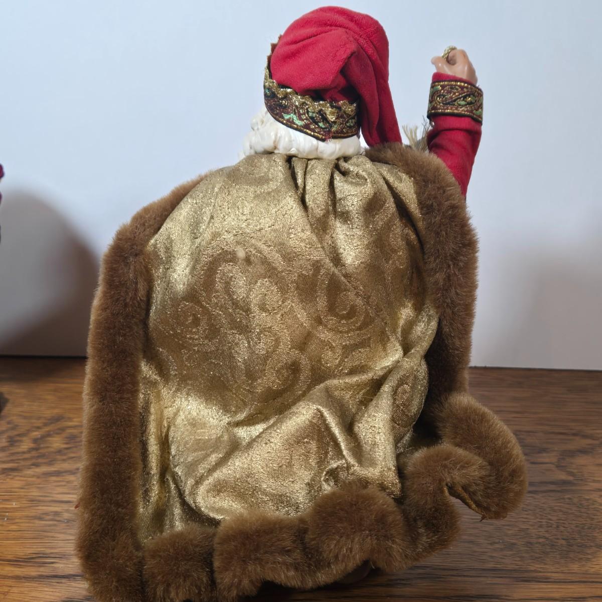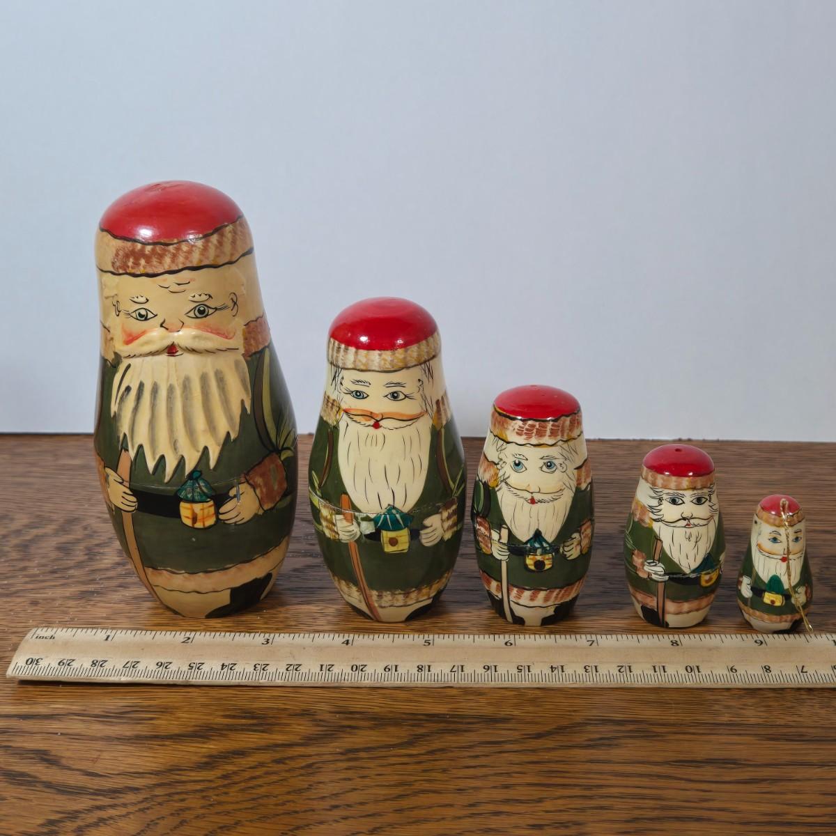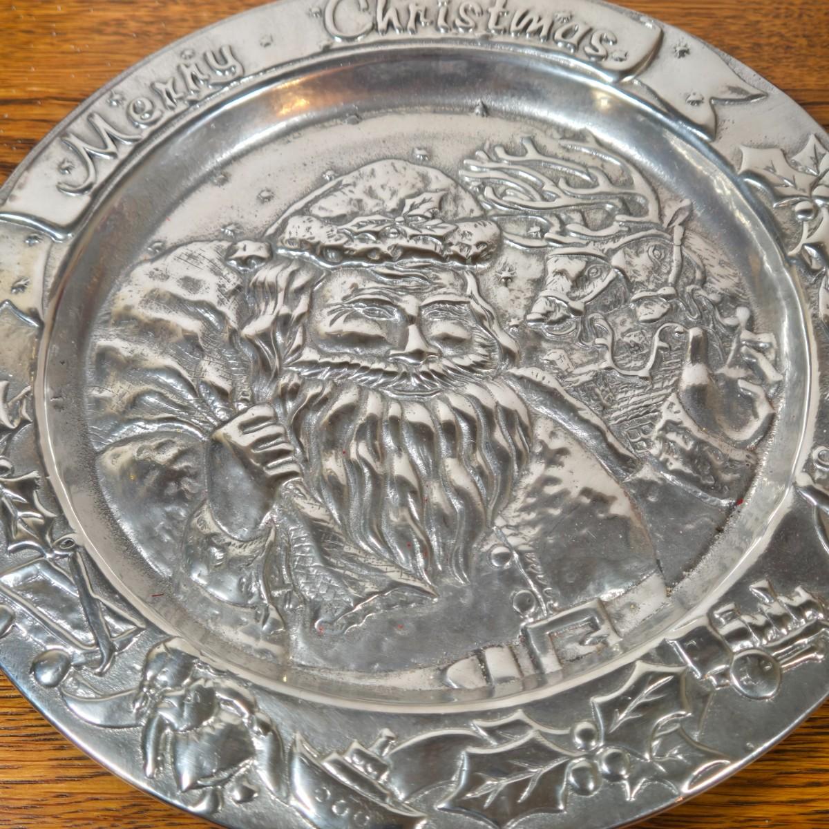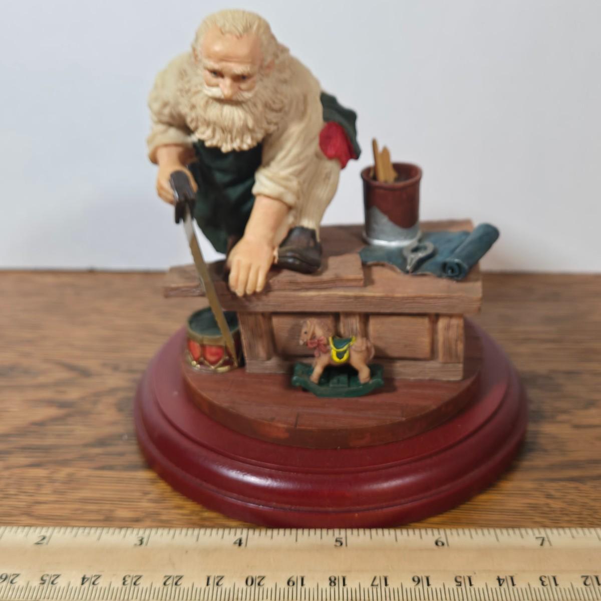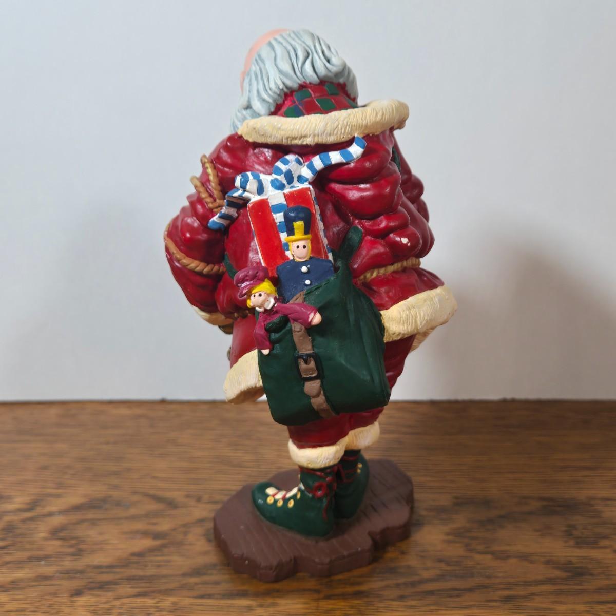 LOT 34L: Metal Christmas Plate, Santa with Baby Jesus, Dept. 56 Christmas Tree & Jolly Old Elf, Santa Workshop Figurine, Mr. & Mrs. Clause Salt & Pepper Shakers, and Vintage Santa Nesting Dolls