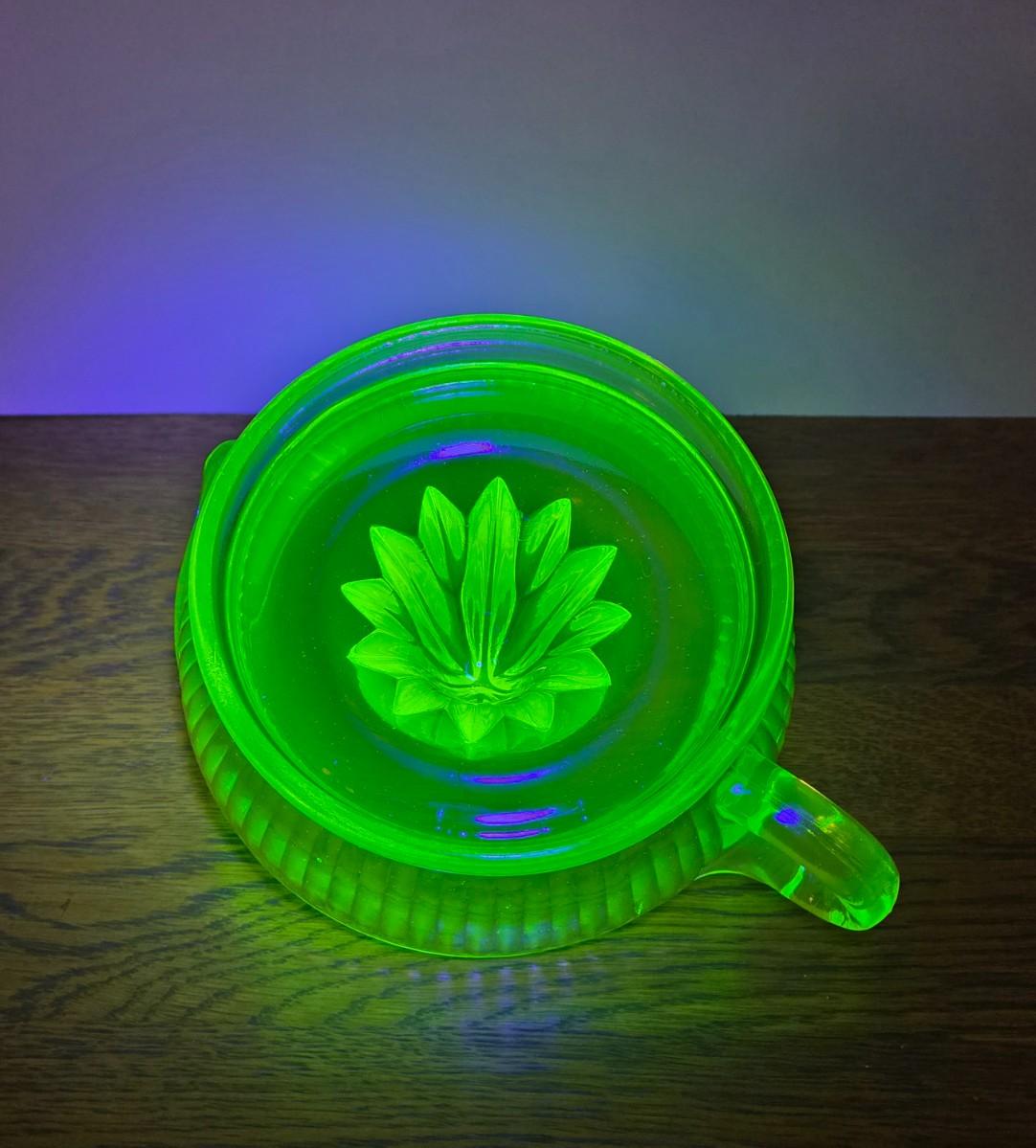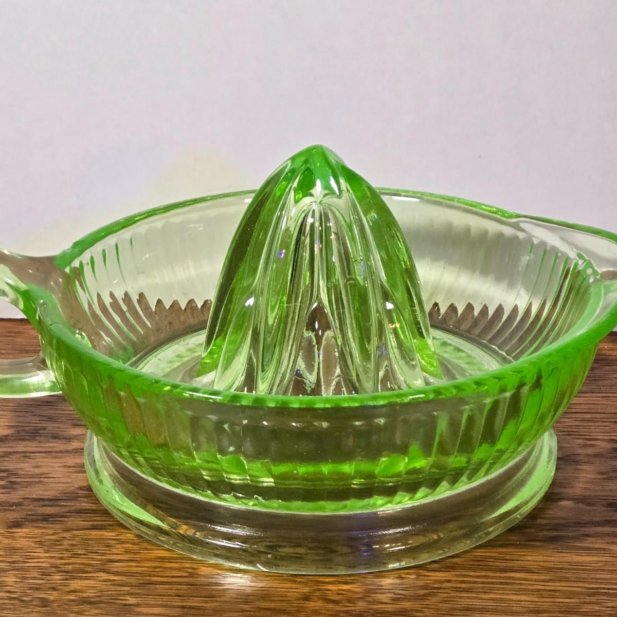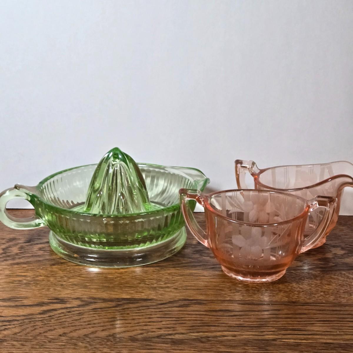 LOT 37L: Uranium Glass Citrus Juicer and Pink Depression Glass Creamer and Sugar Set