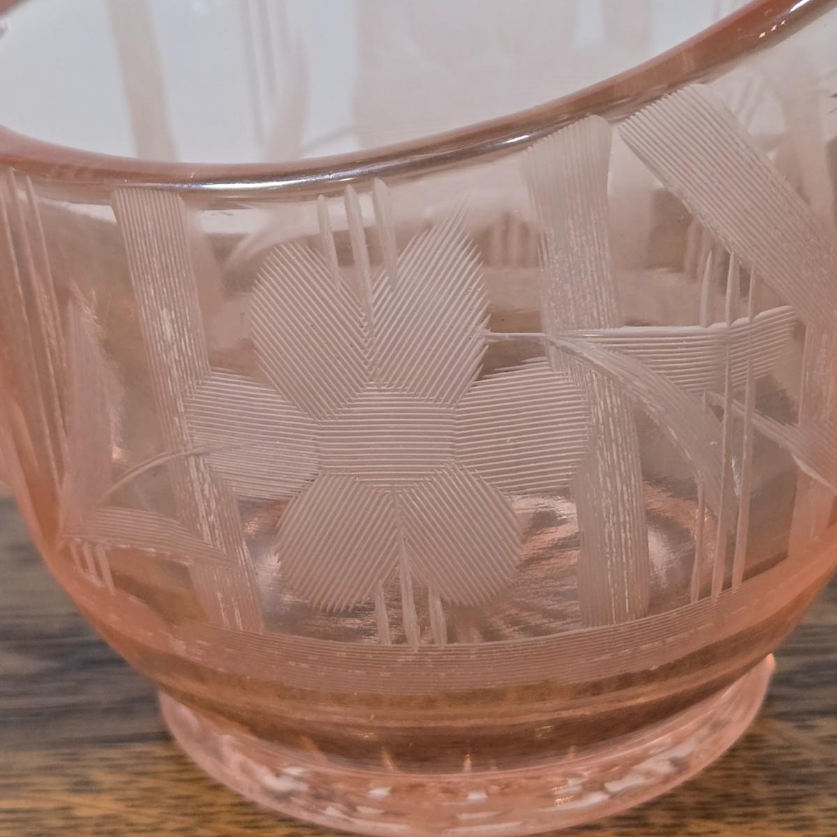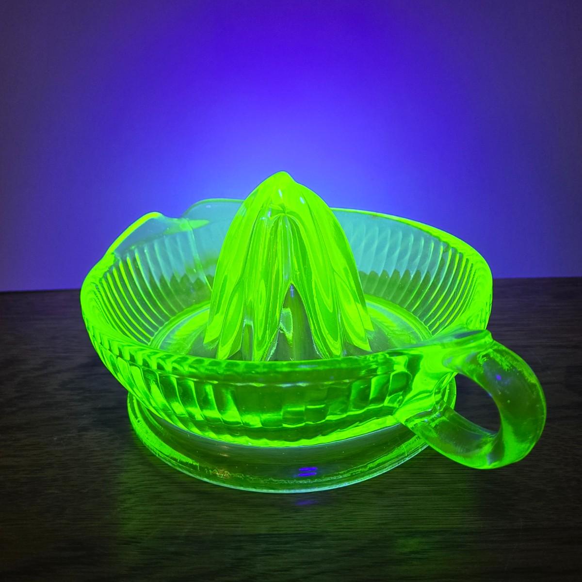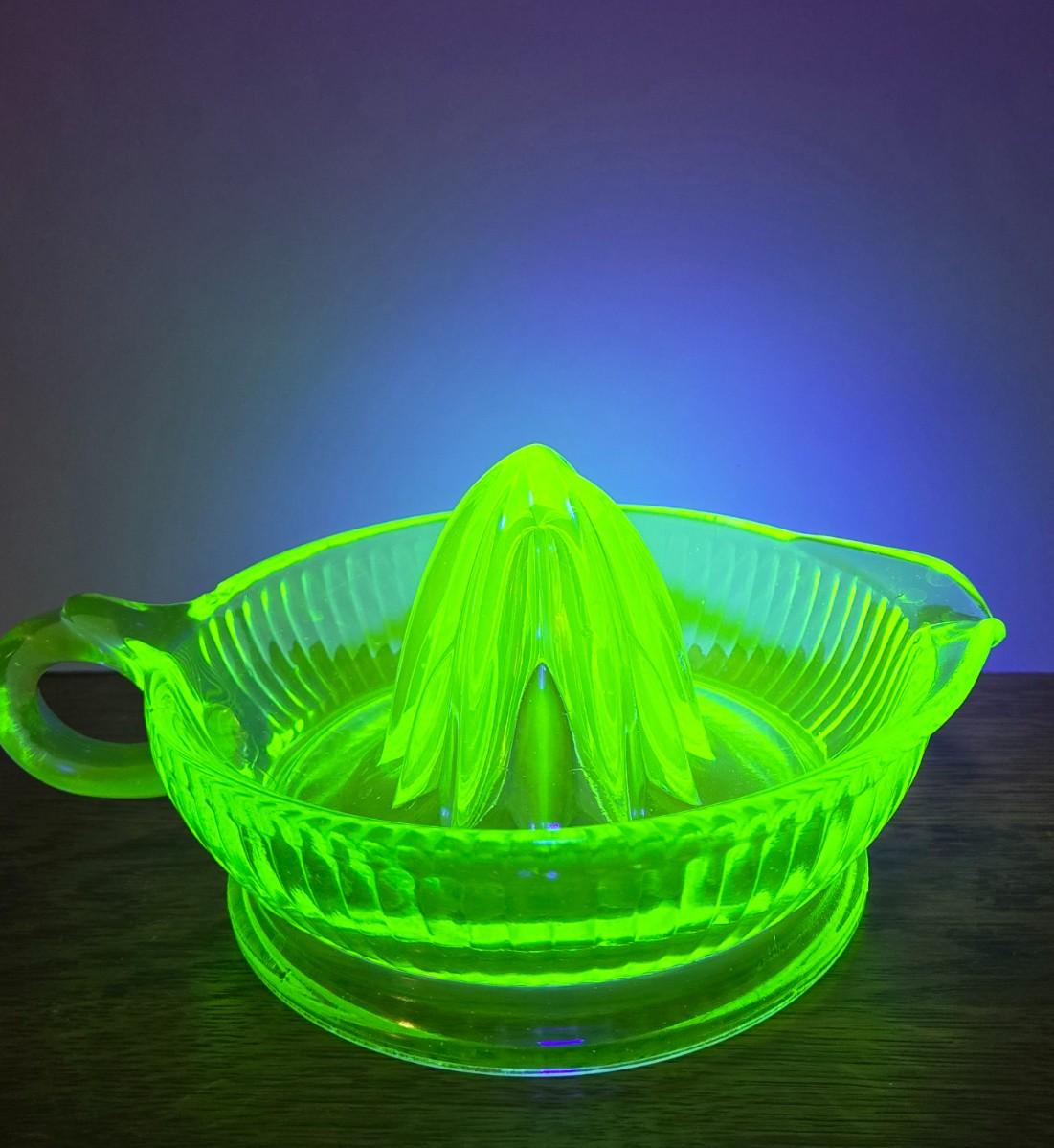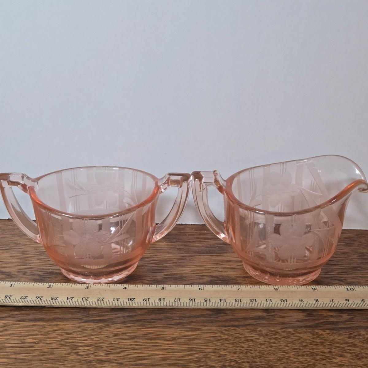 LOT 37L: Uranium Glass Citrus Juicer and Pink Depression Glass Creamer and Sugar Set
