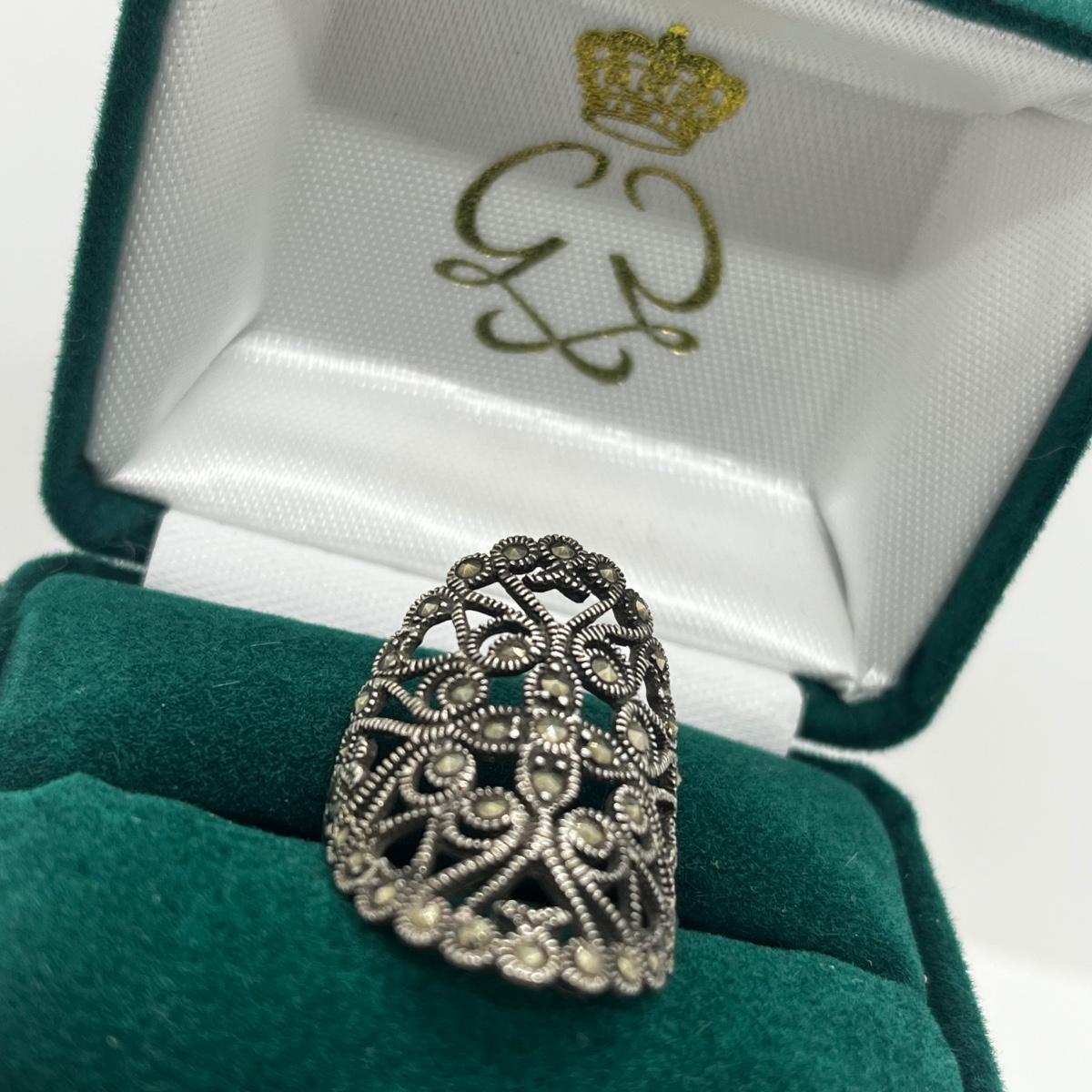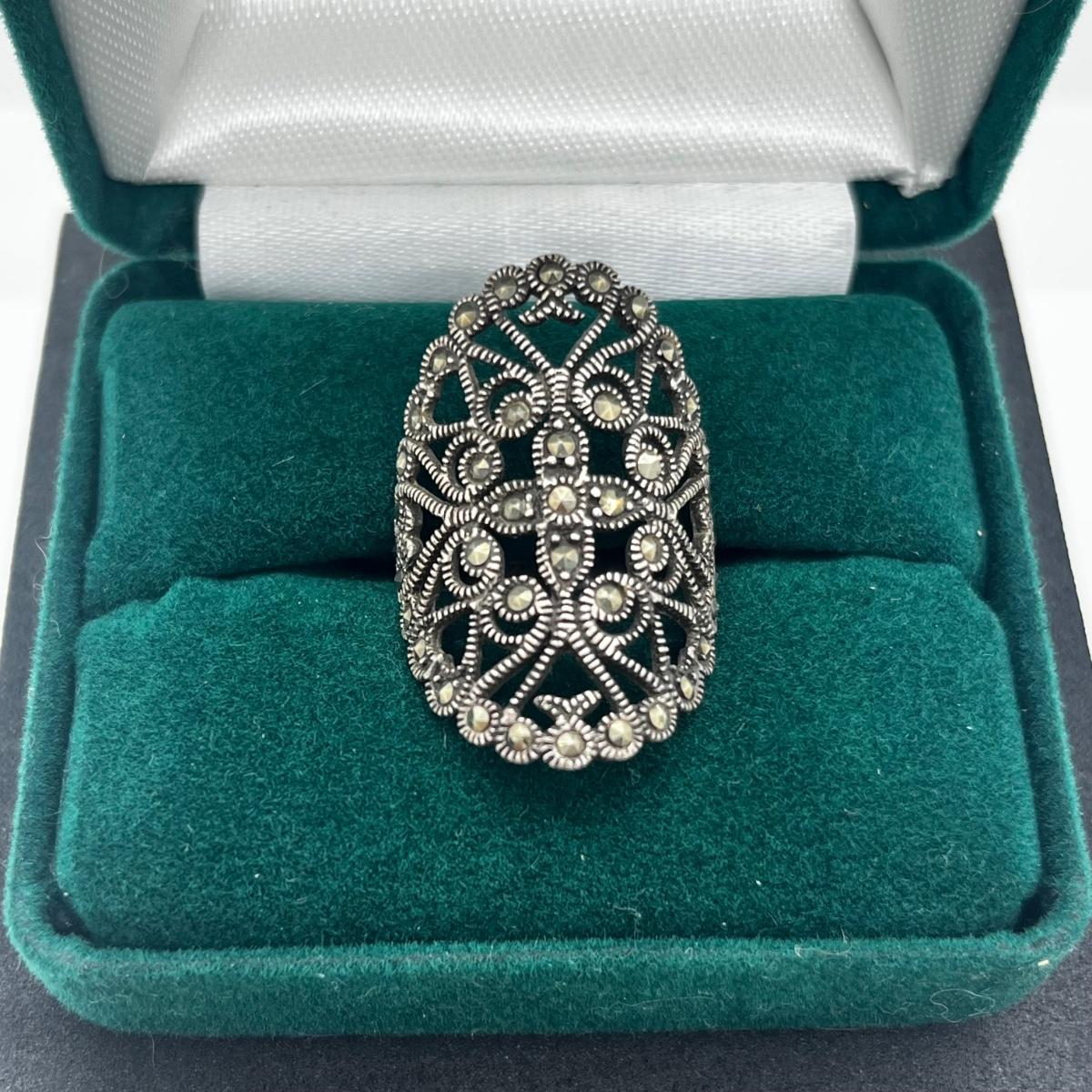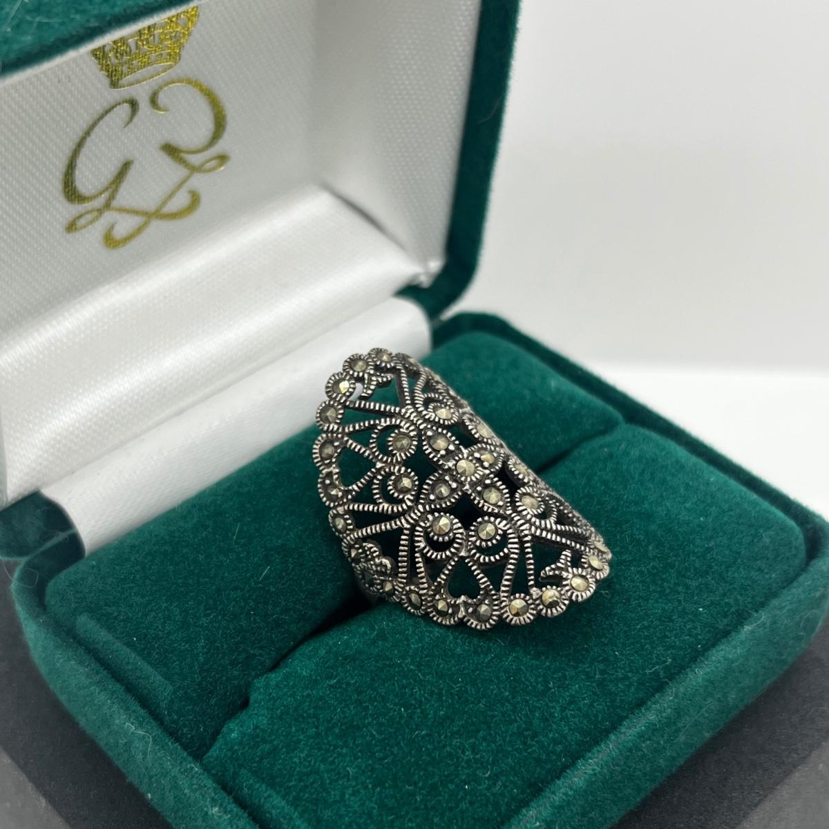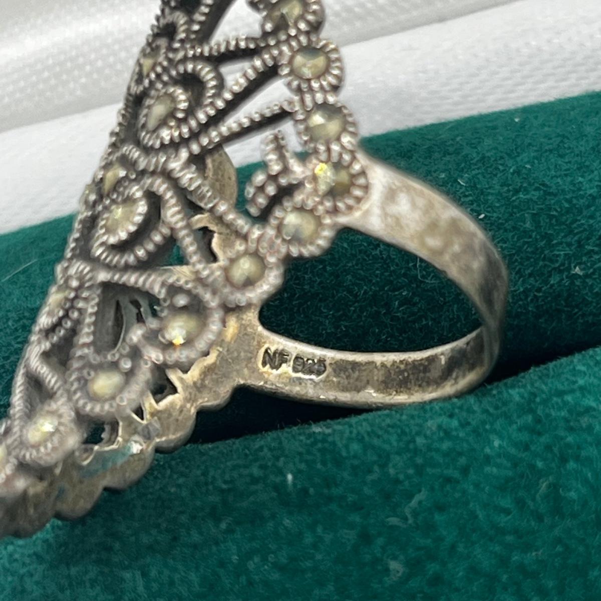 LOT 105J: NF 925 Vintage Sterling Silver Marcasite Filigree Ring - Size 8