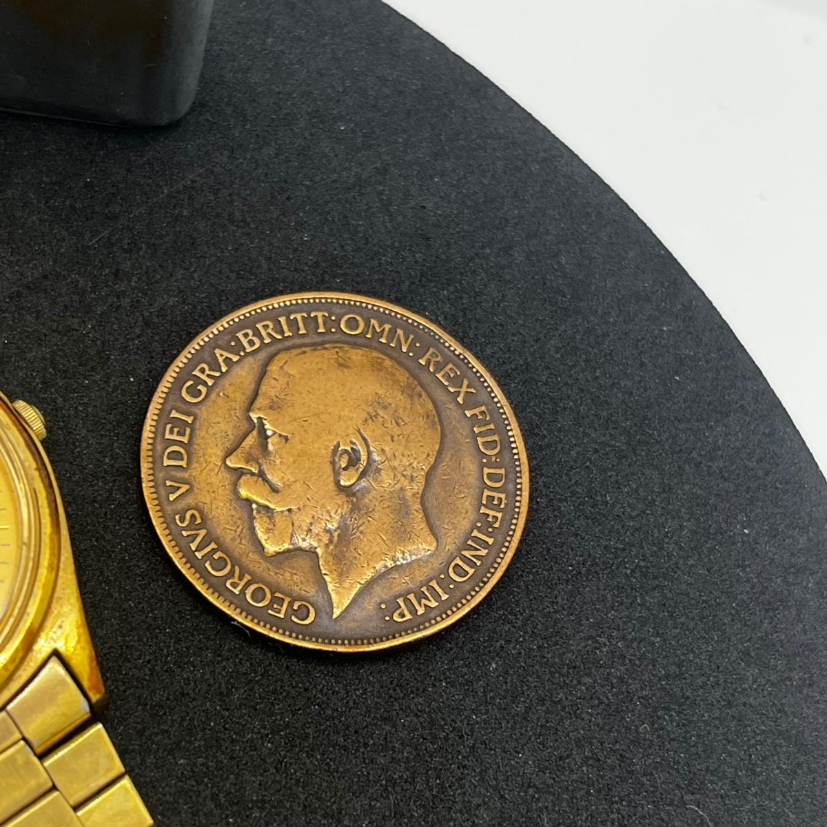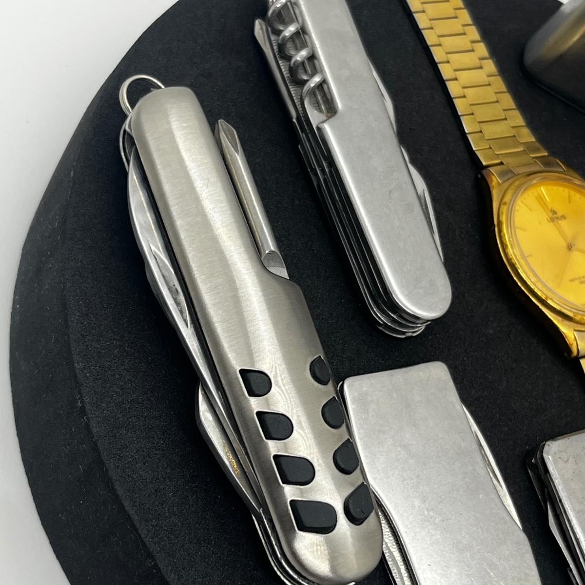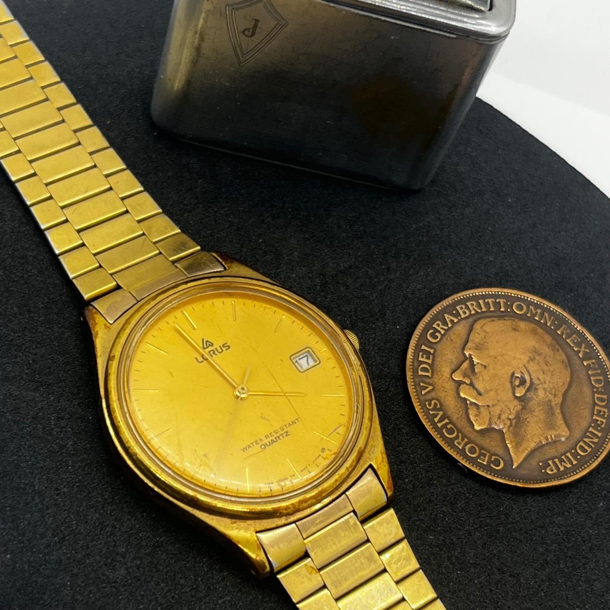 LOT: 106J: Junk Drawer Lot: Lorus Men's Watch (Not Working), Pocket Knives, Vintage Colibri Lighter and 1914 British Penny