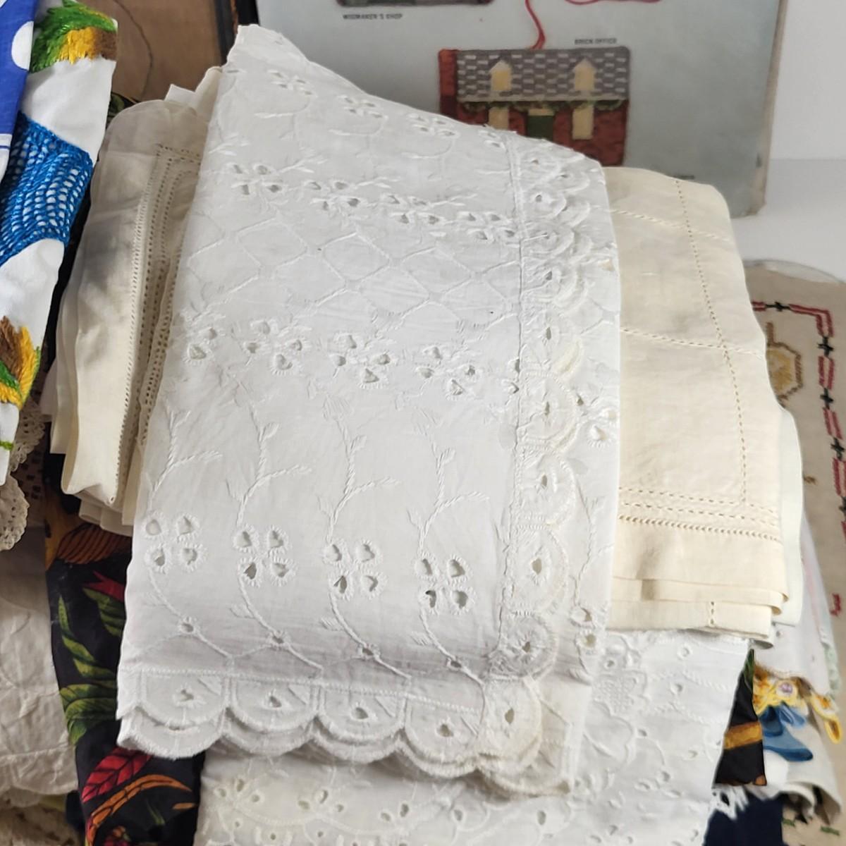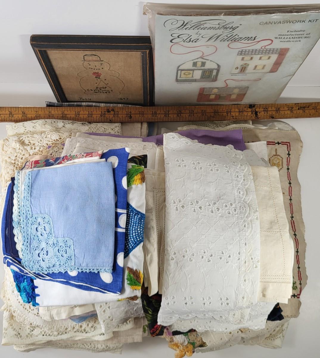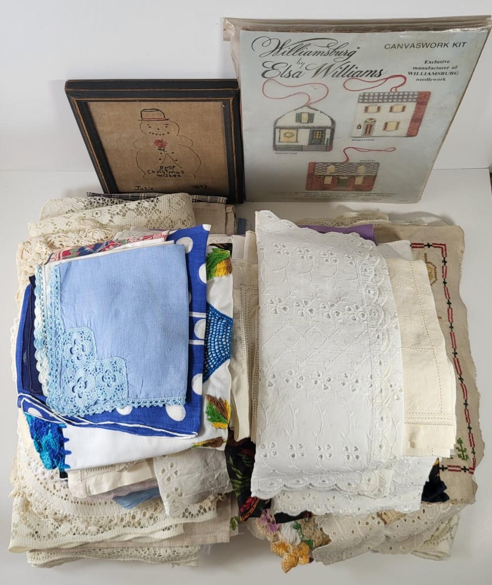 LOT 10G: Large Collection of Decorative Linen's with Art Kit and Vintage Snowman Framed Artwork