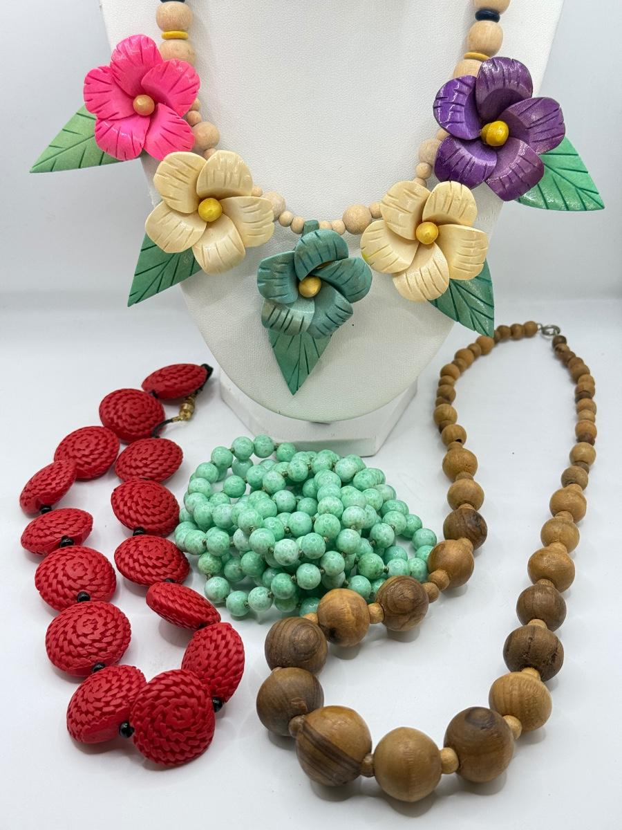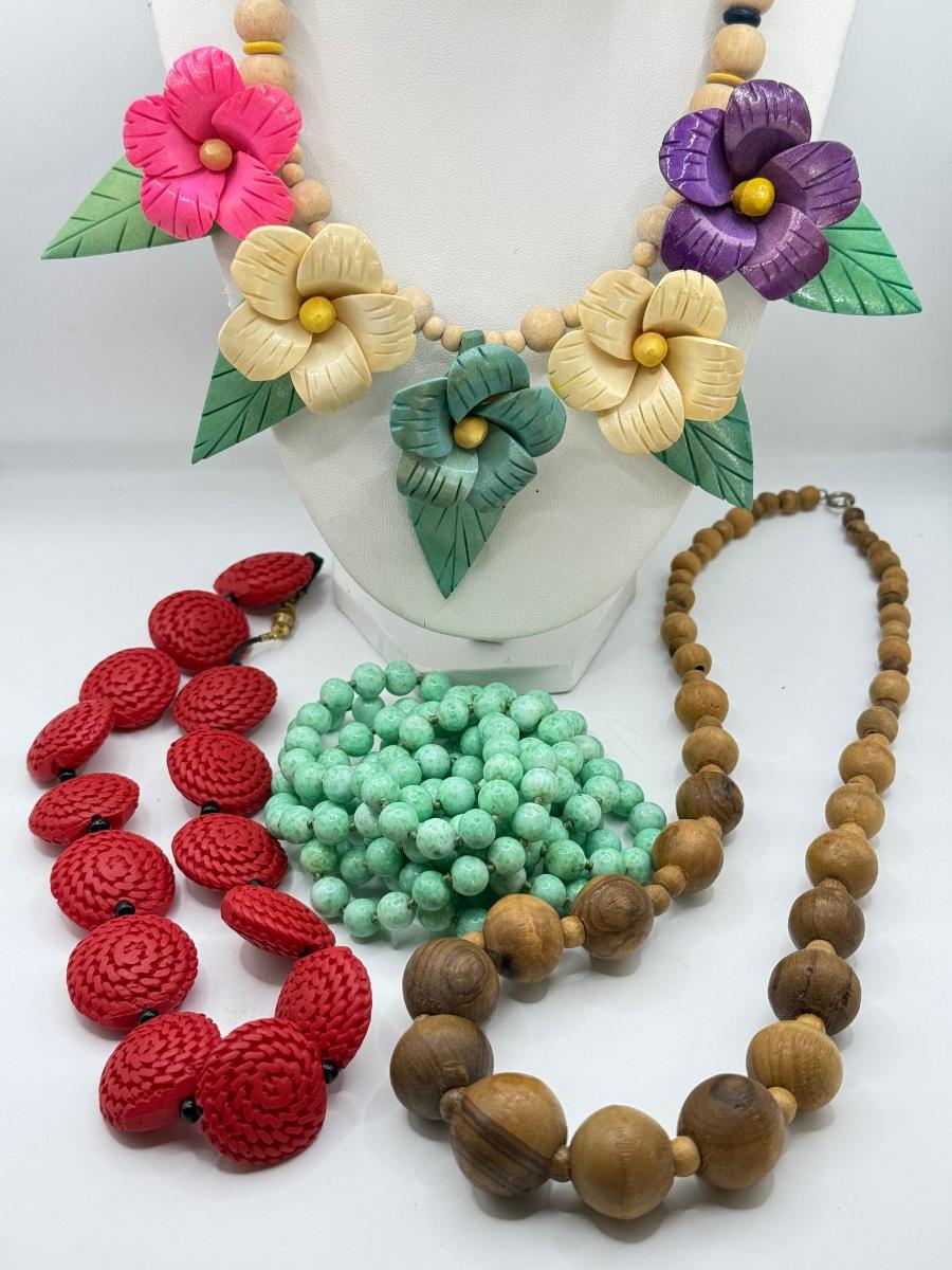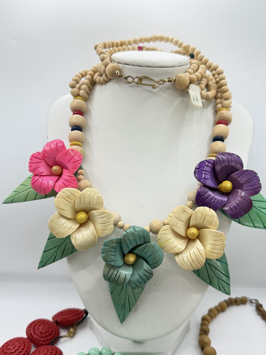 LOT 52J: Tropical Wooden Flower Necklace w/ Beaded Necklaces