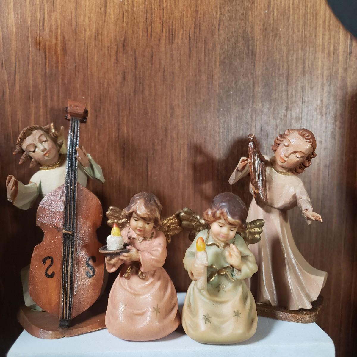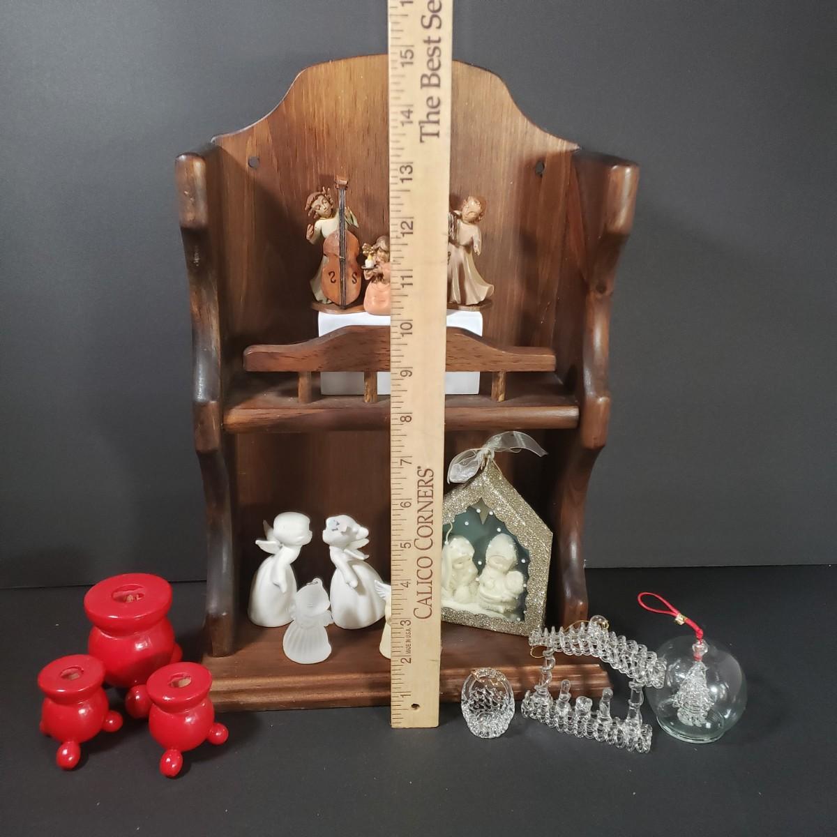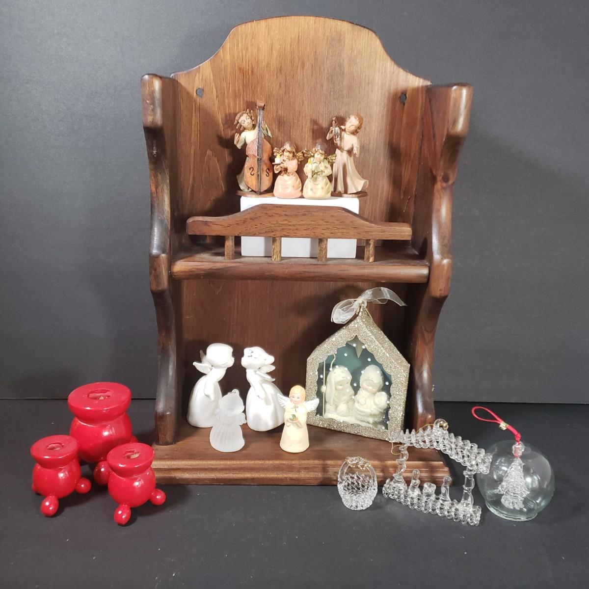 LOT 70D: Wooden Trinket Shelf with Dept 56 Nativity, Swedish Candle Holders, Angels & More