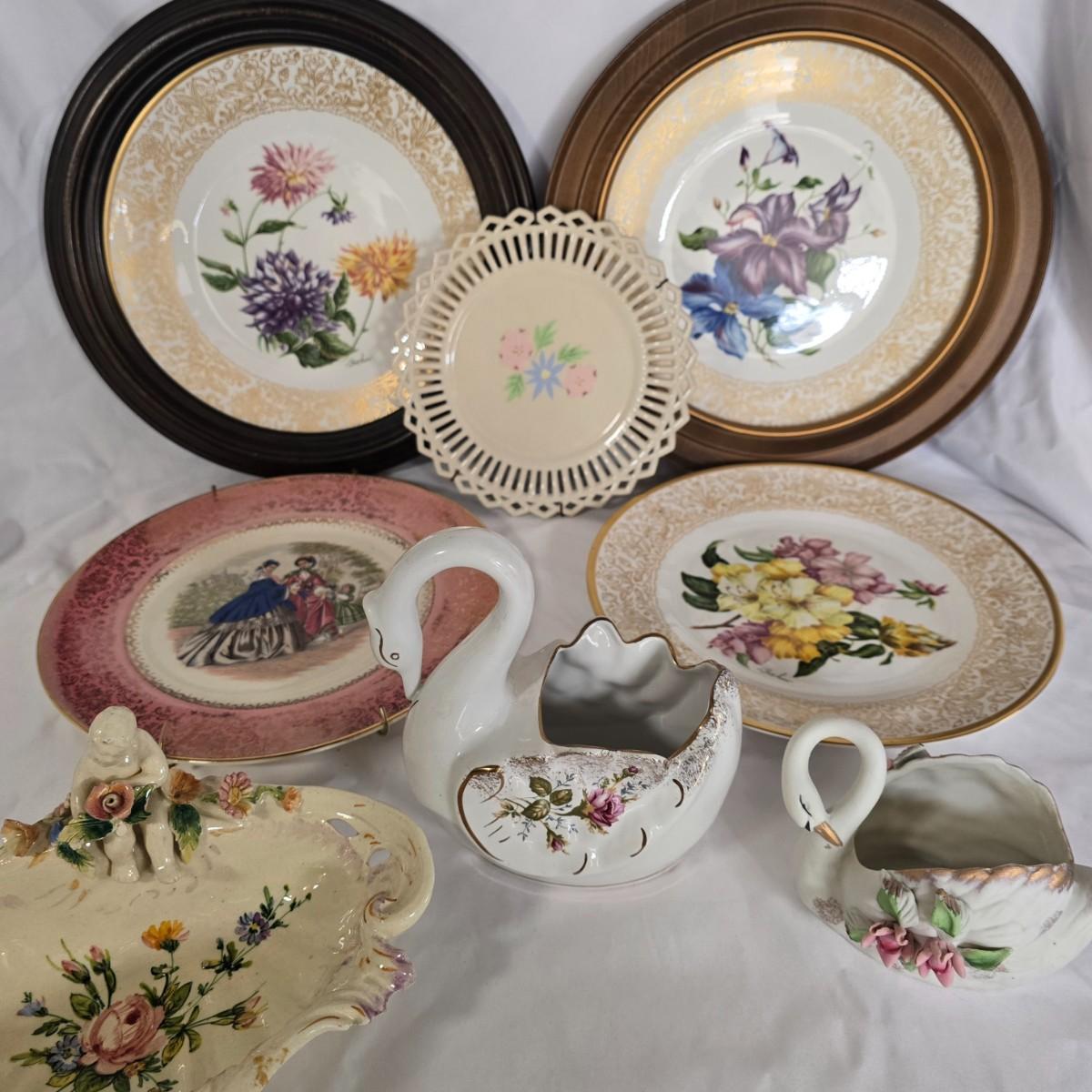 LOT 115G: Italian Ceramic Bowl, Porcelain Swans, and Collector Plates