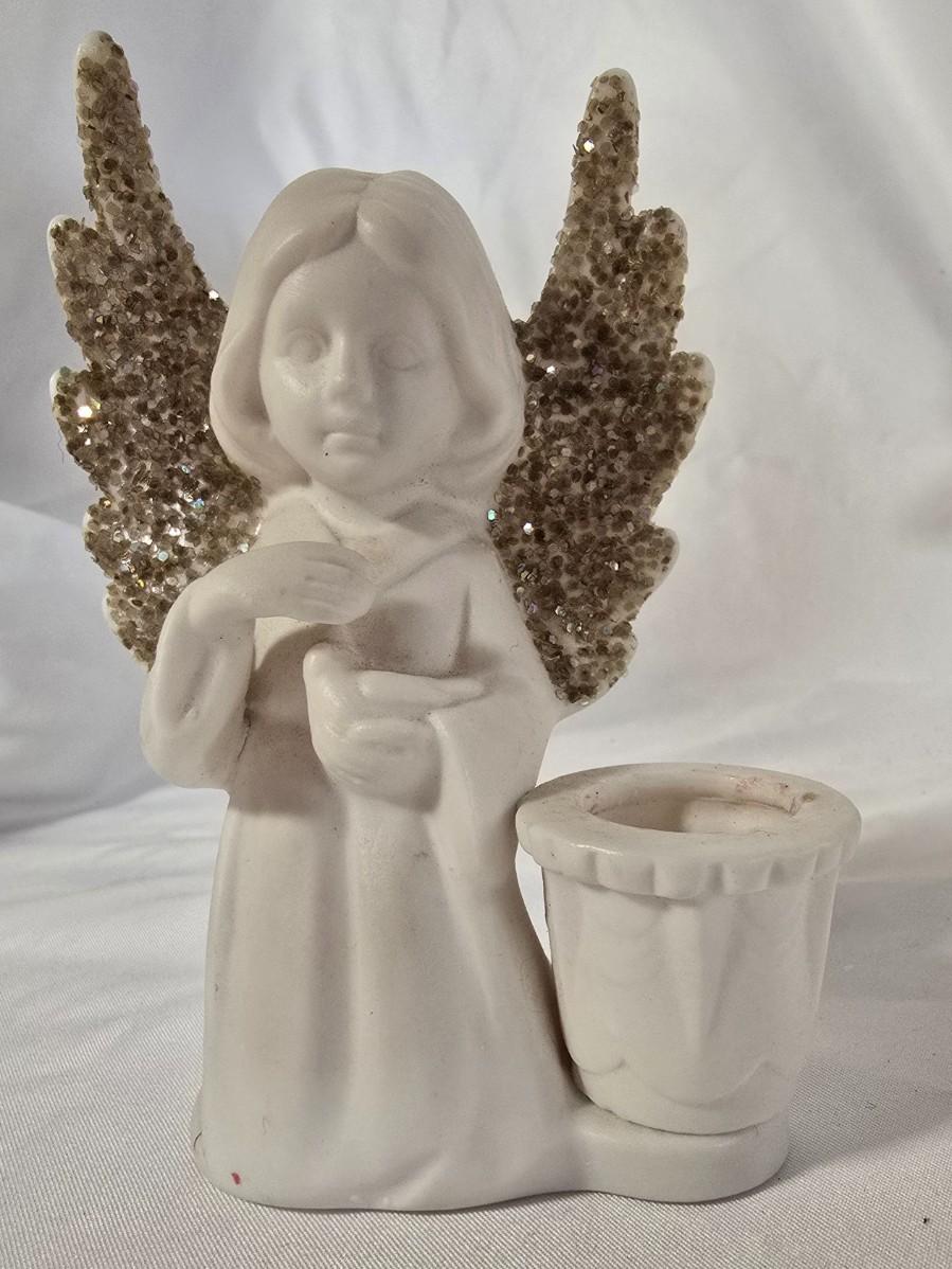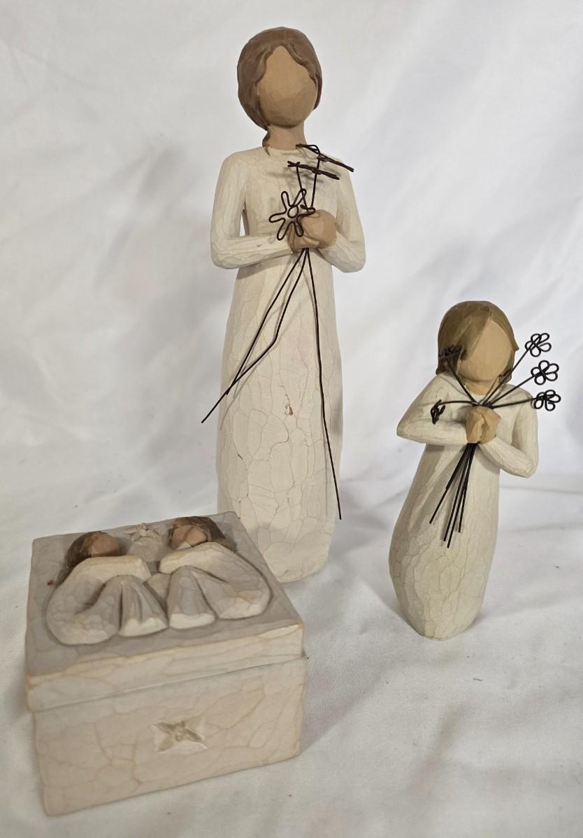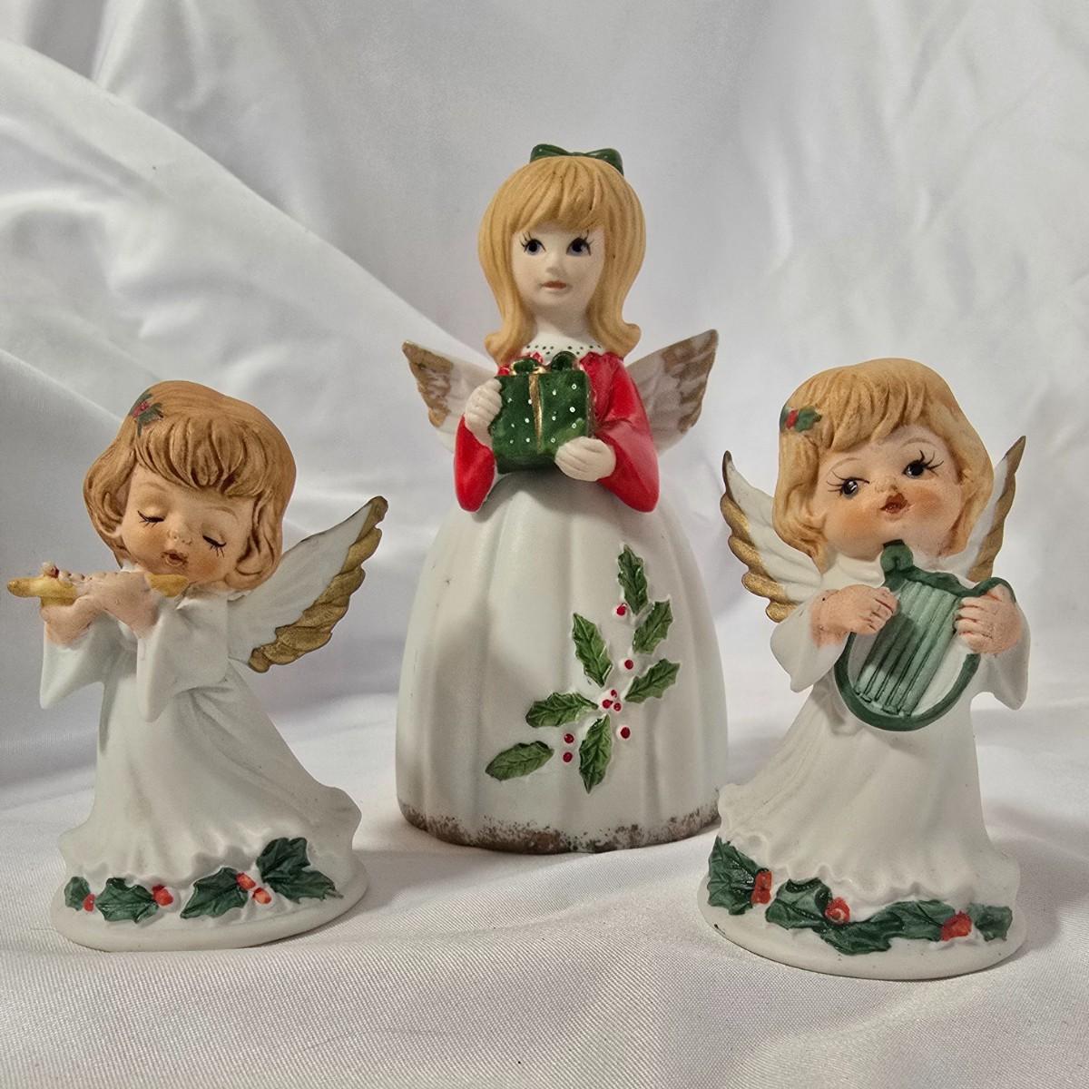LOT 117G: Willow Tree Figurines, 70's Era Ceramic Angels, Glass Bell, and New In Box Angel Ornaments