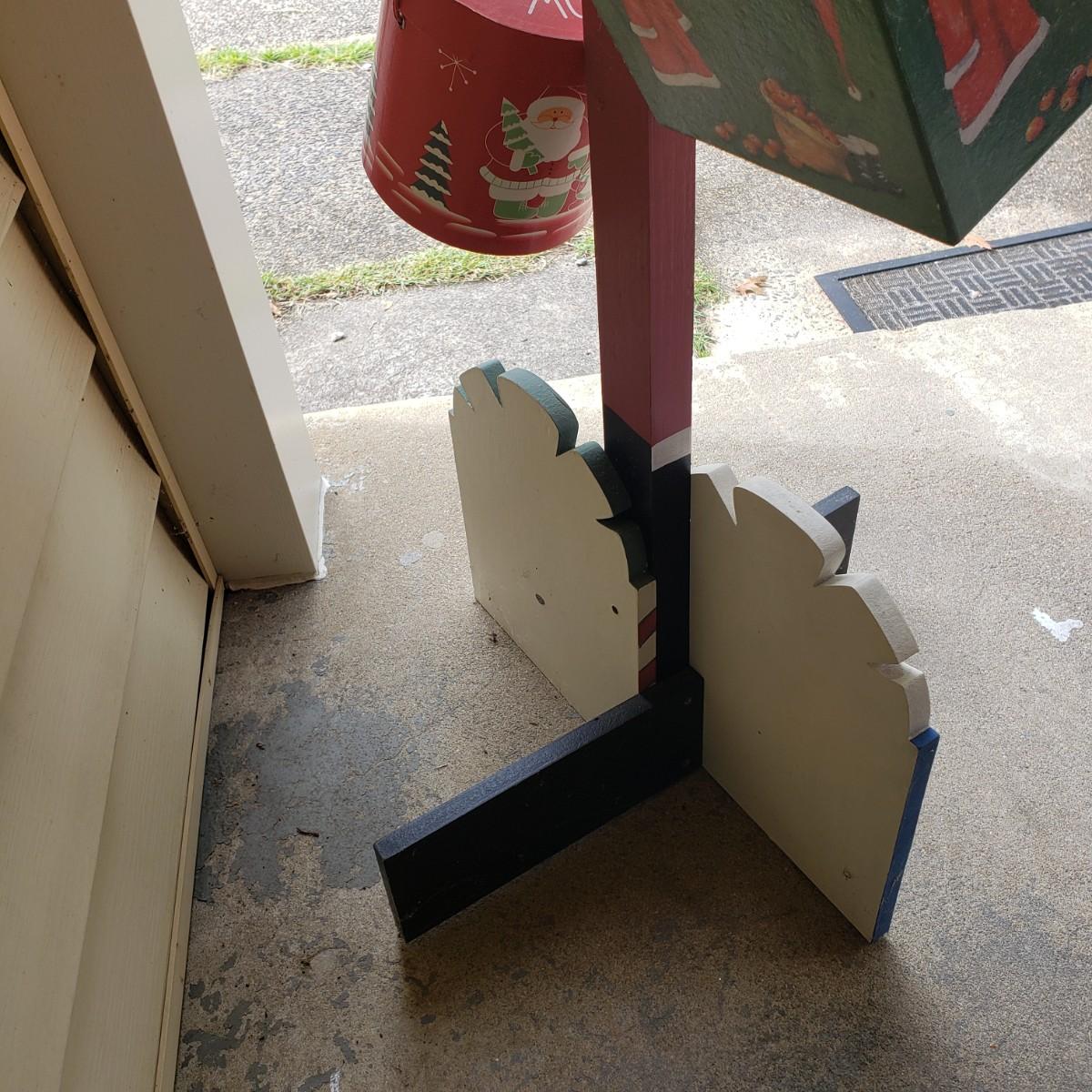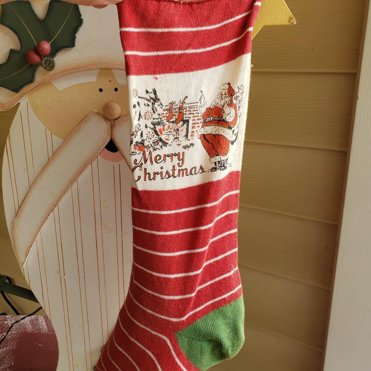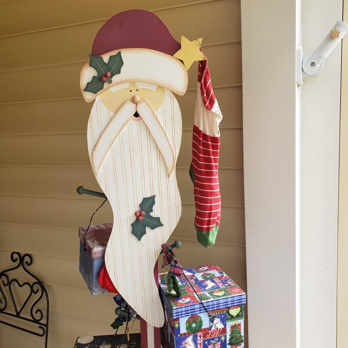 LOT 147G: 6Ft Wooden Santa Decoration with Boxes & Vintage Stockings