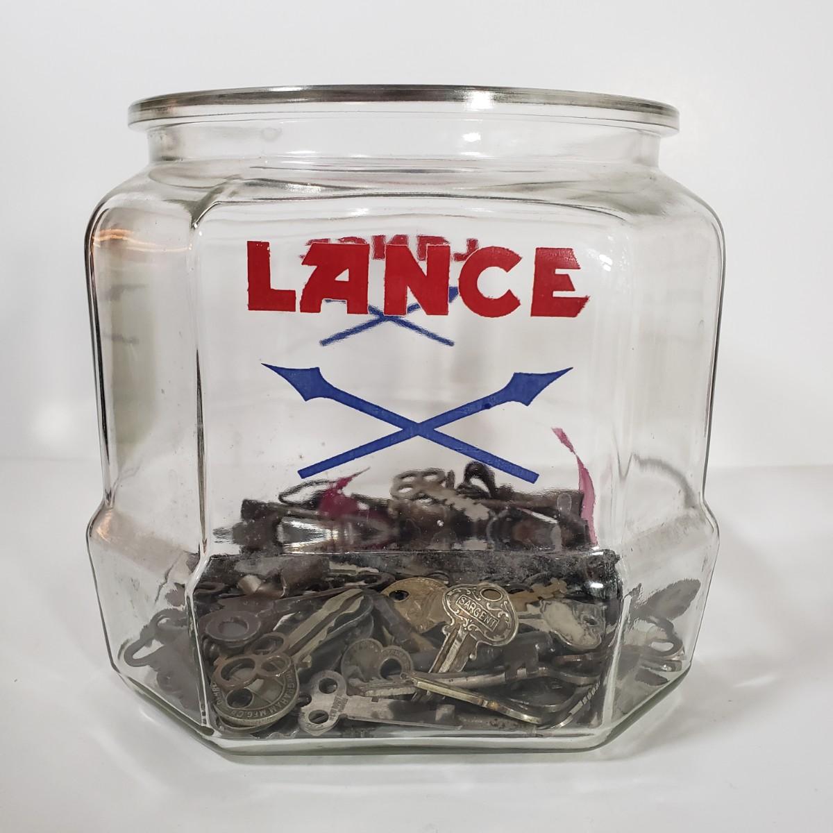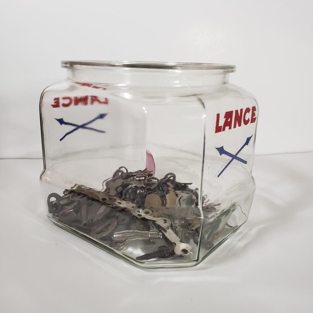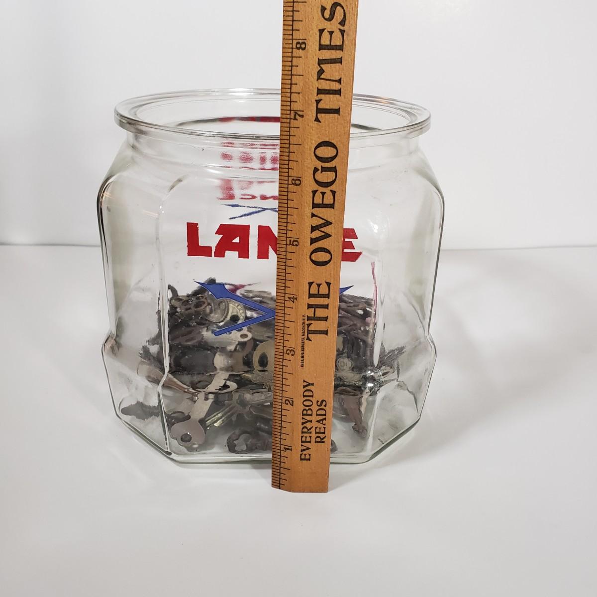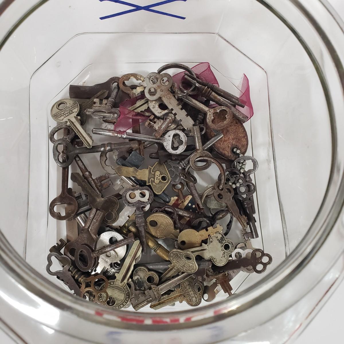 LOT 148L: Vintage Lance Cracker Glass Jar Filled with Keys-Skeleton, Rollerskate, Clock Keys & More