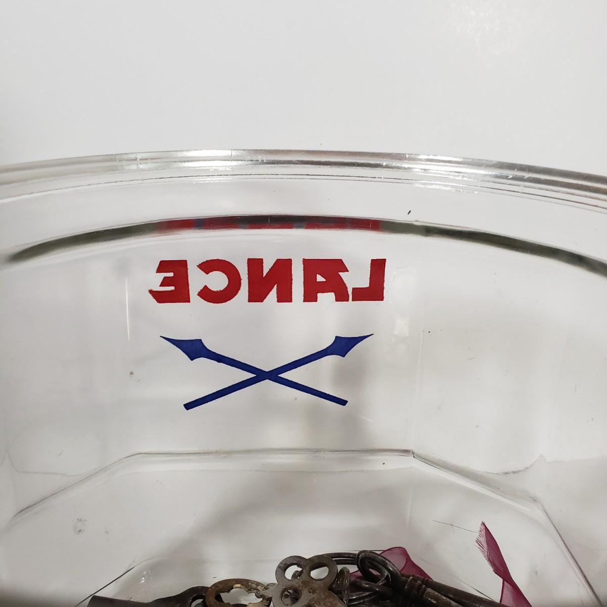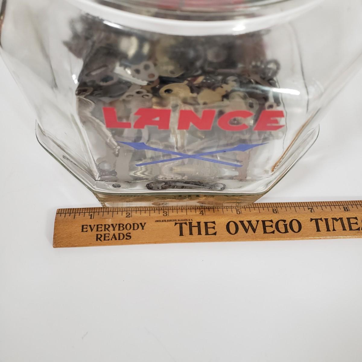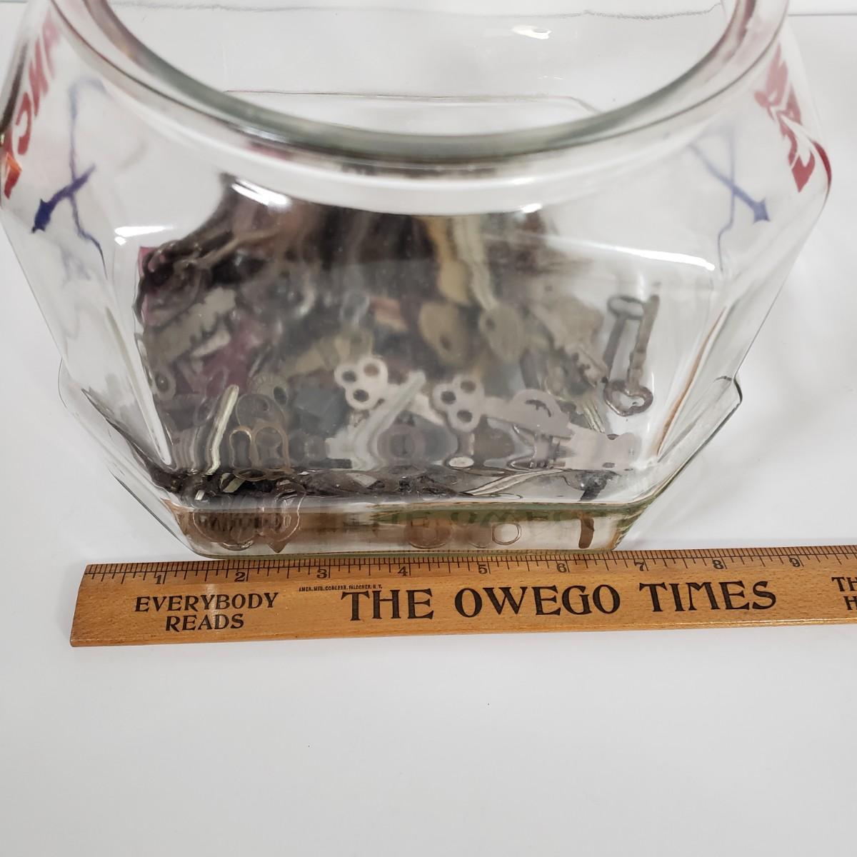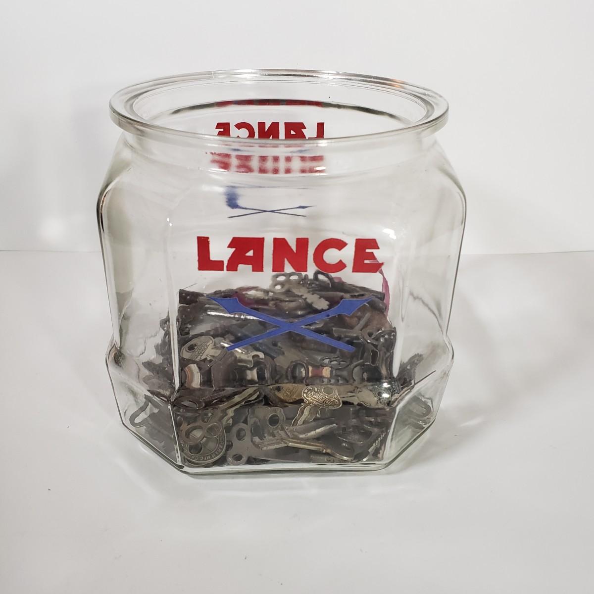 LOT 148L: Vintage Lance Cracker Glass Jar Filled with Keys-Skeleton, Rollerskate, Clock Keys & More