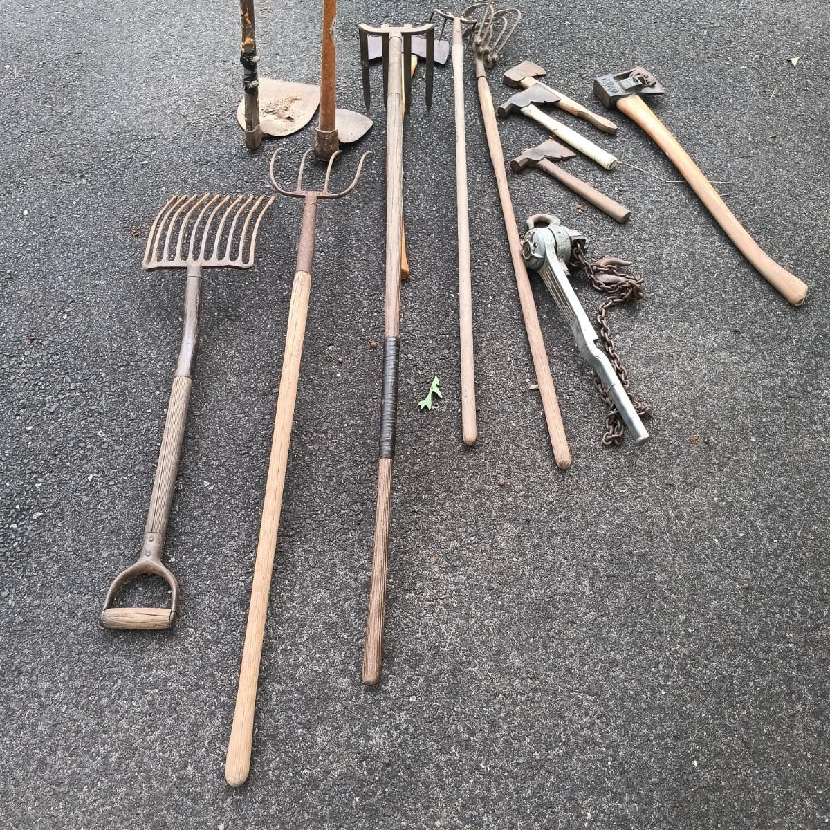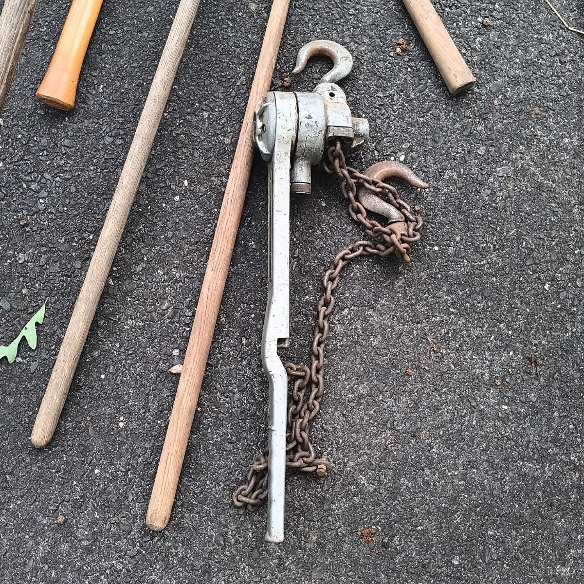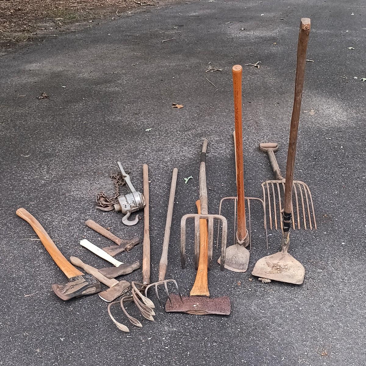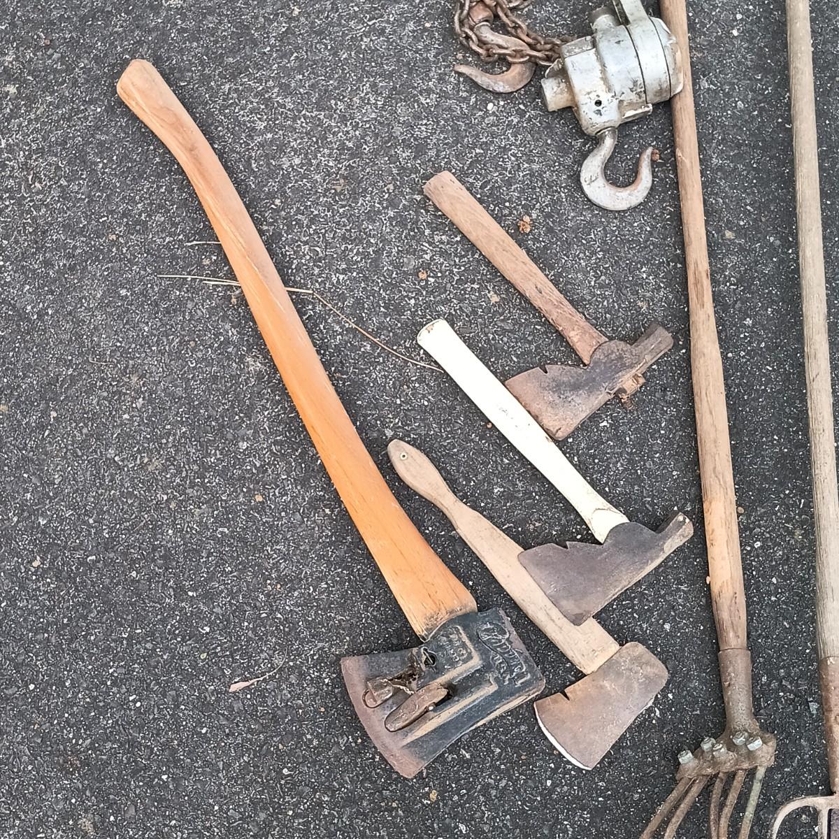 LOT 13: Gardening Tools - Axes, Chain Hoist, Pitchforks & More