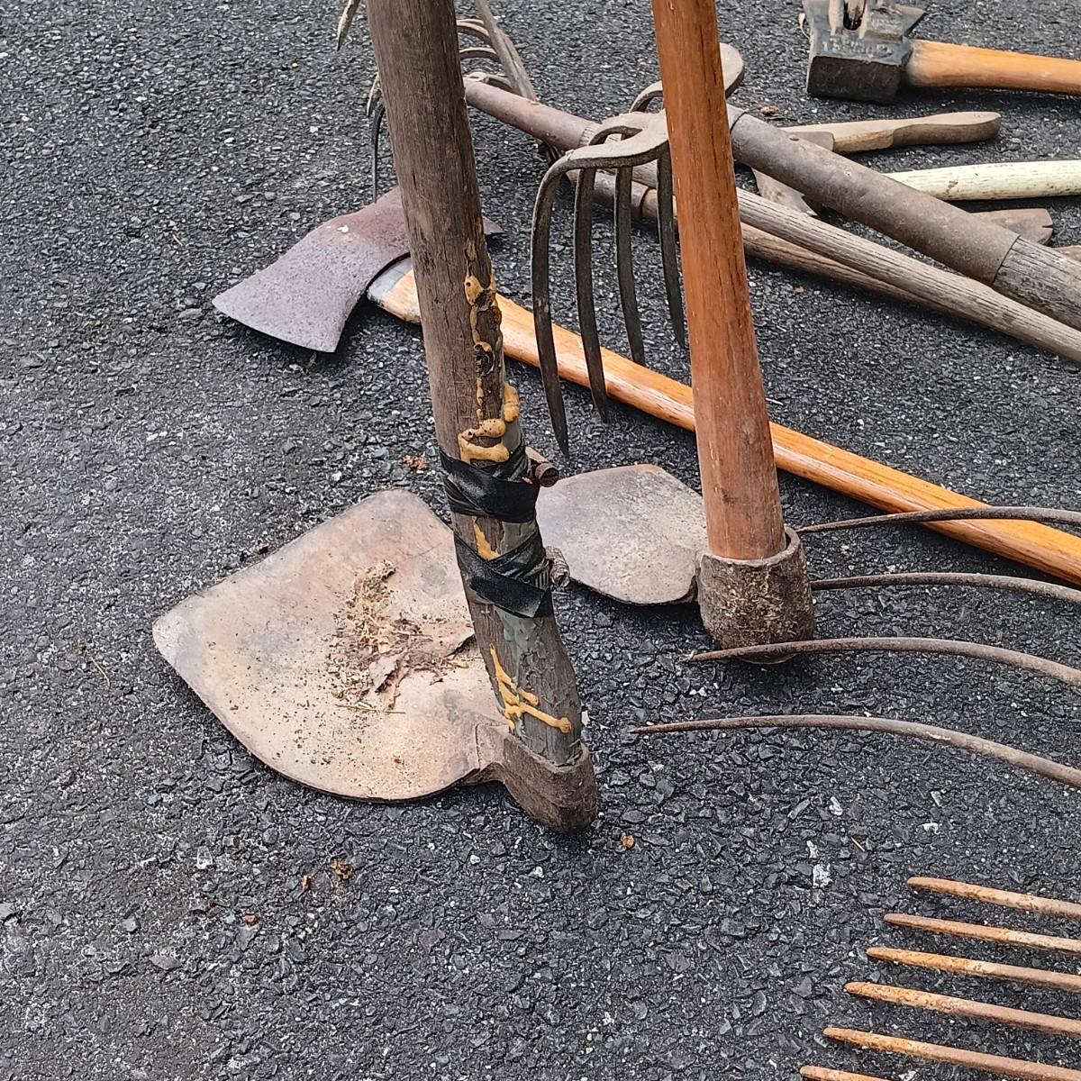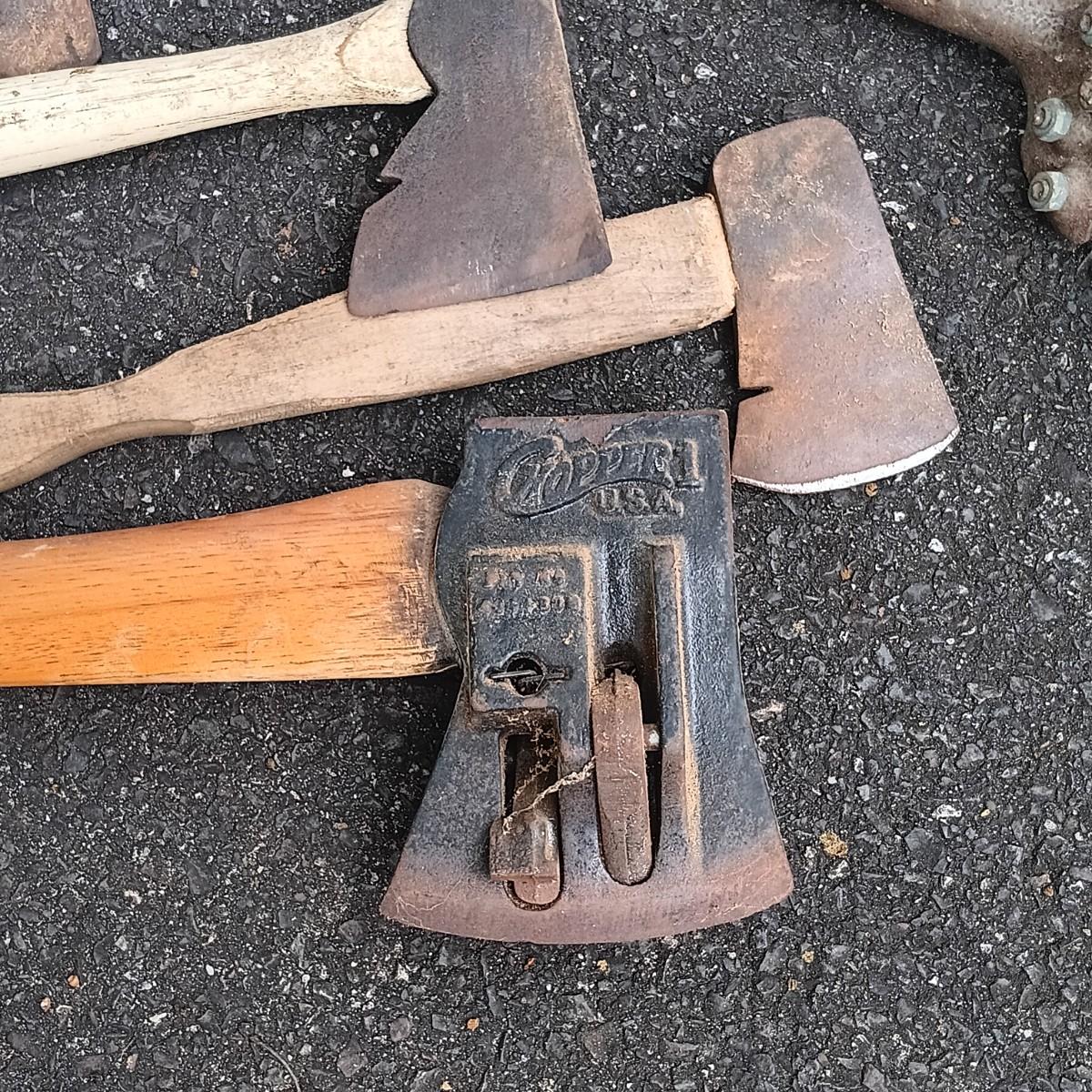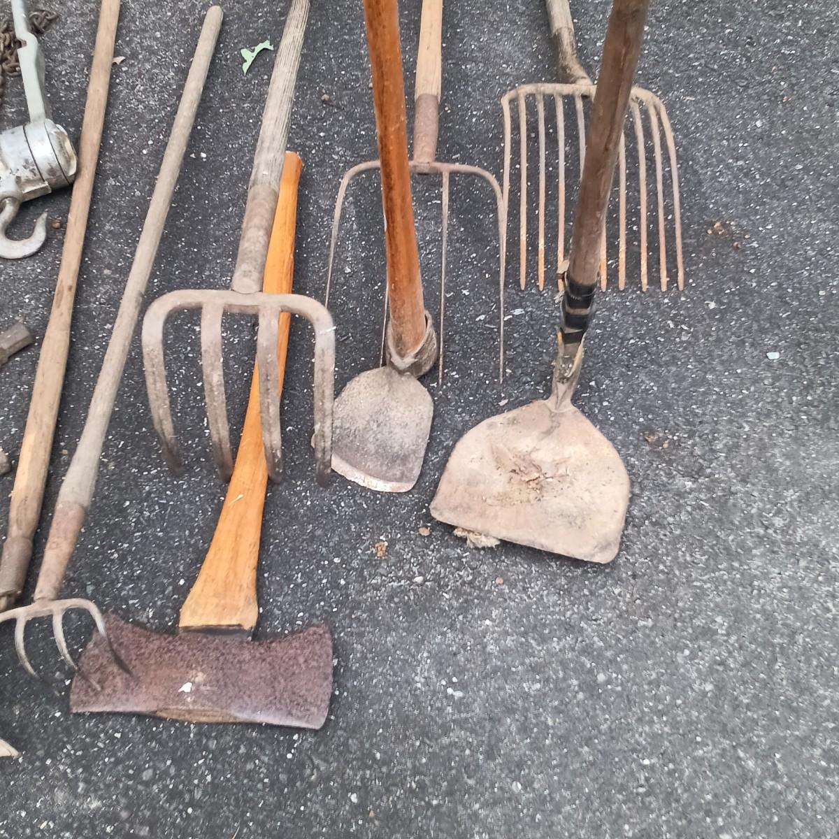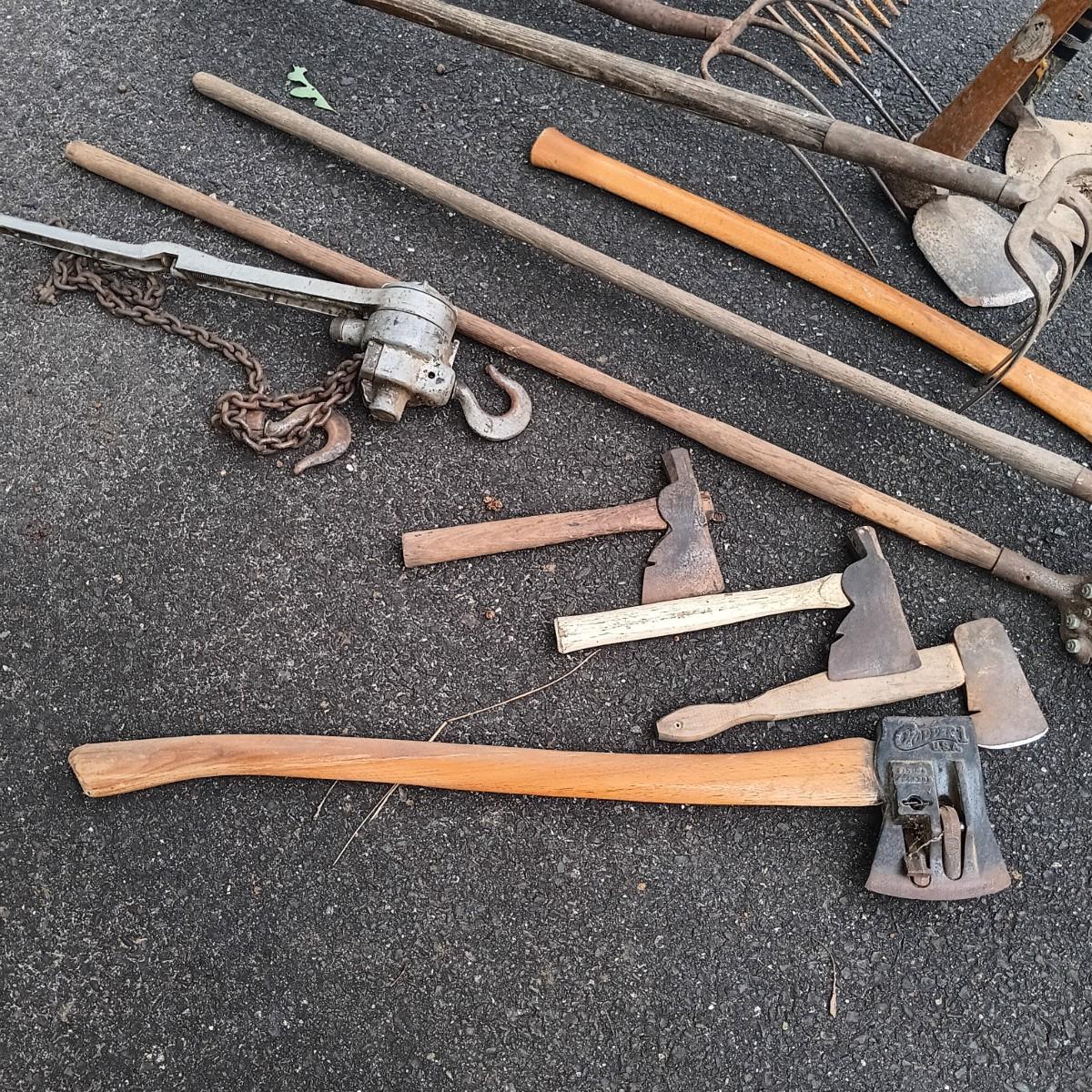 LOT 13: Gardening Tools - Axes, Chain Hoist, Pitchforks & More