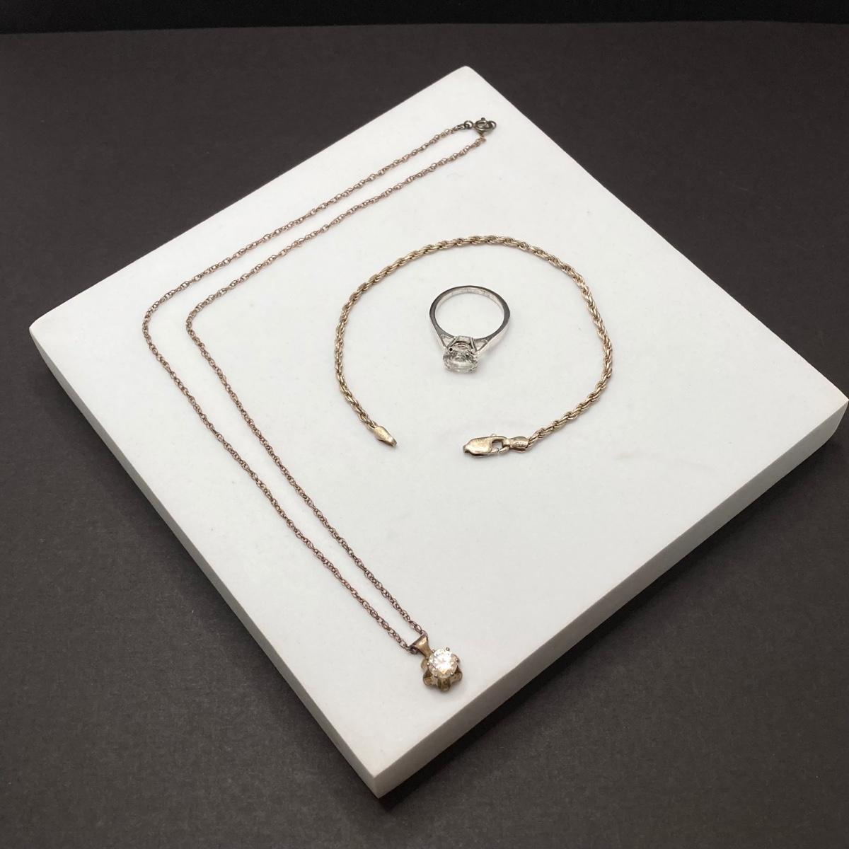 LOT 46: Sterling Jewelry - Cubic Zirconia Ring Sz 7.5, Pendant Necklace 18" and Bracelet 8"