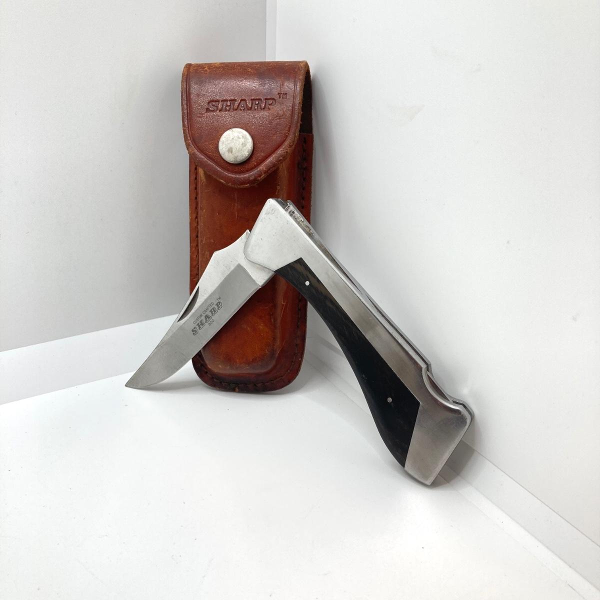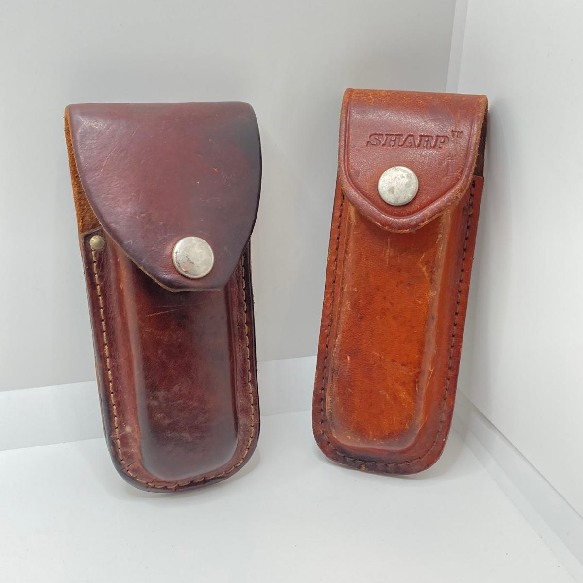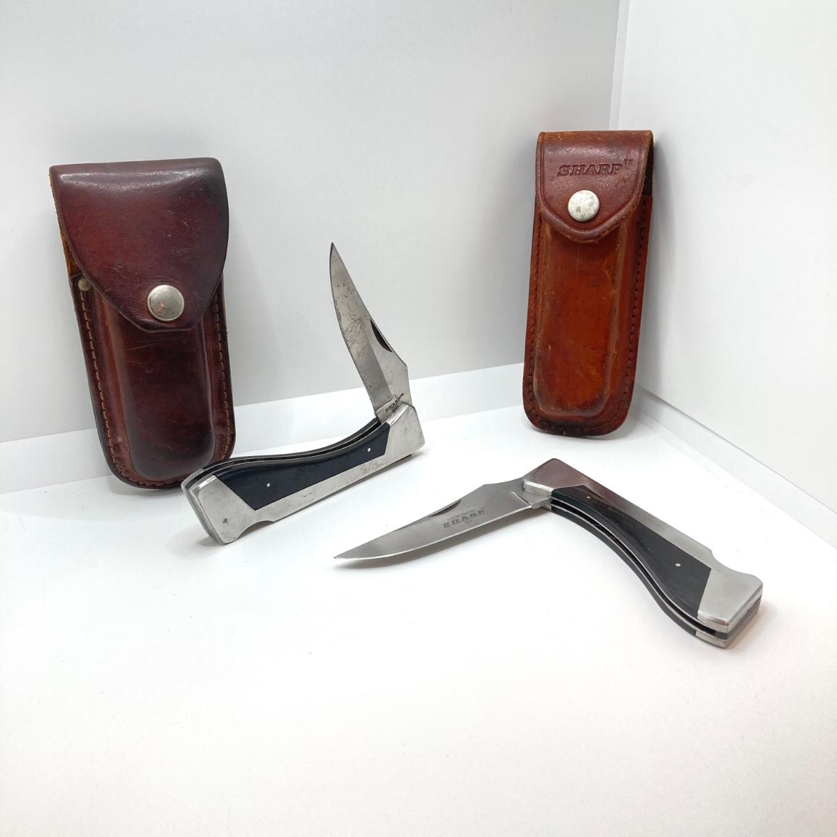 LOT 73: Pair of Sharp 300 Folding Knives with Leather Sheaths