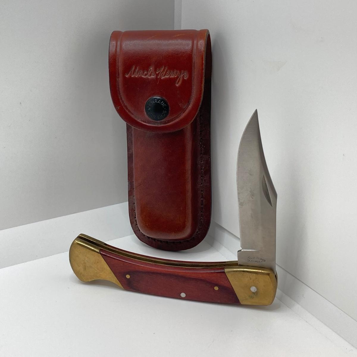 LOT 75: Vintage Uncle Henry Schrade Folding Knife with Leather Sheath