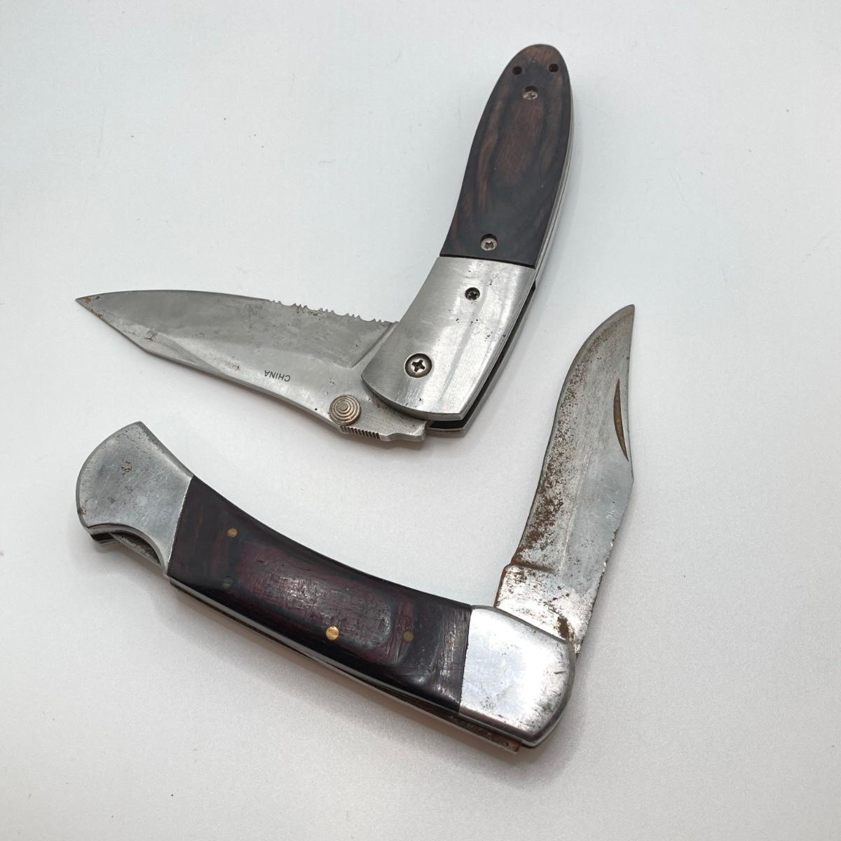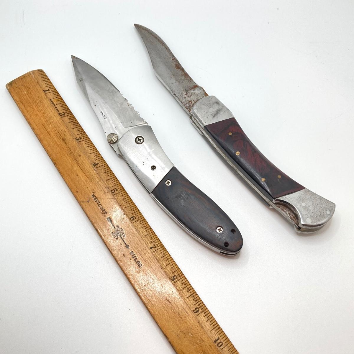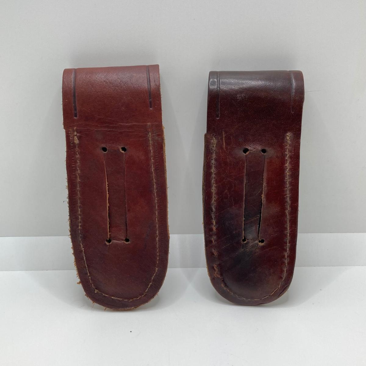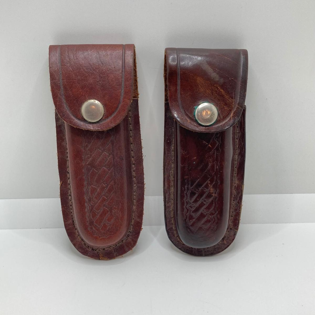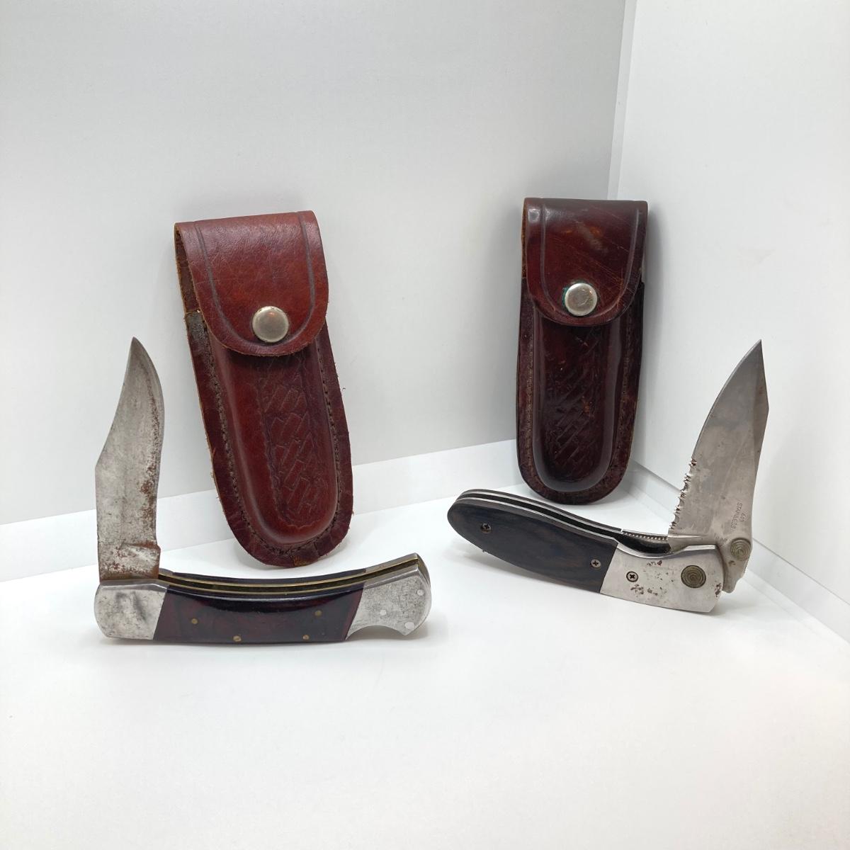 LOT 76: Pair of Folding Knives with Leather Sheaths