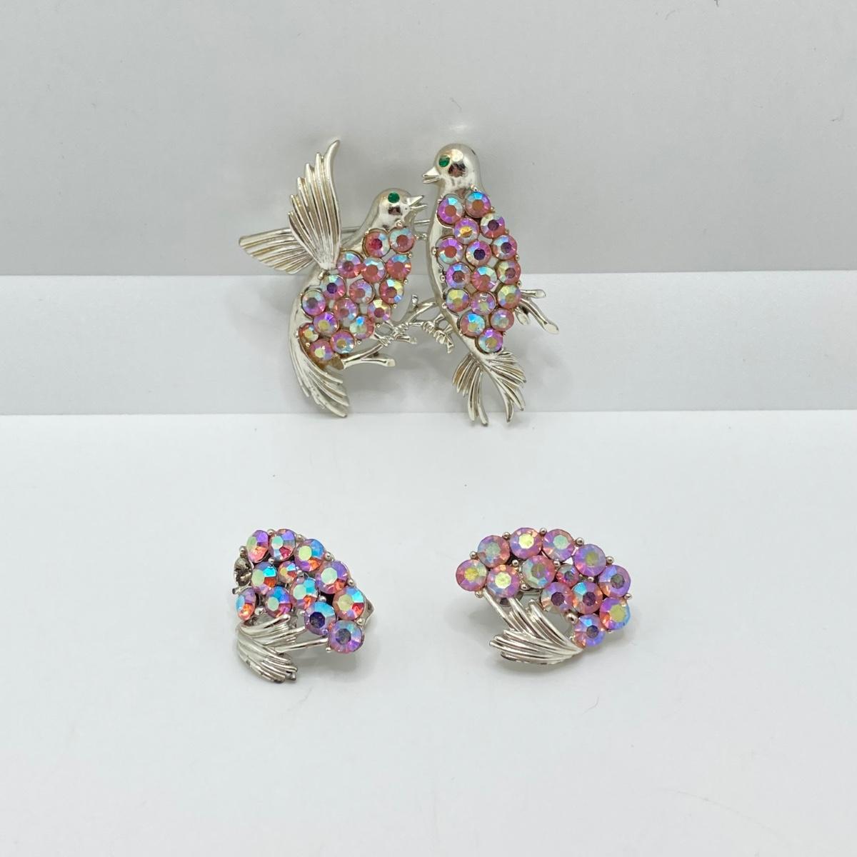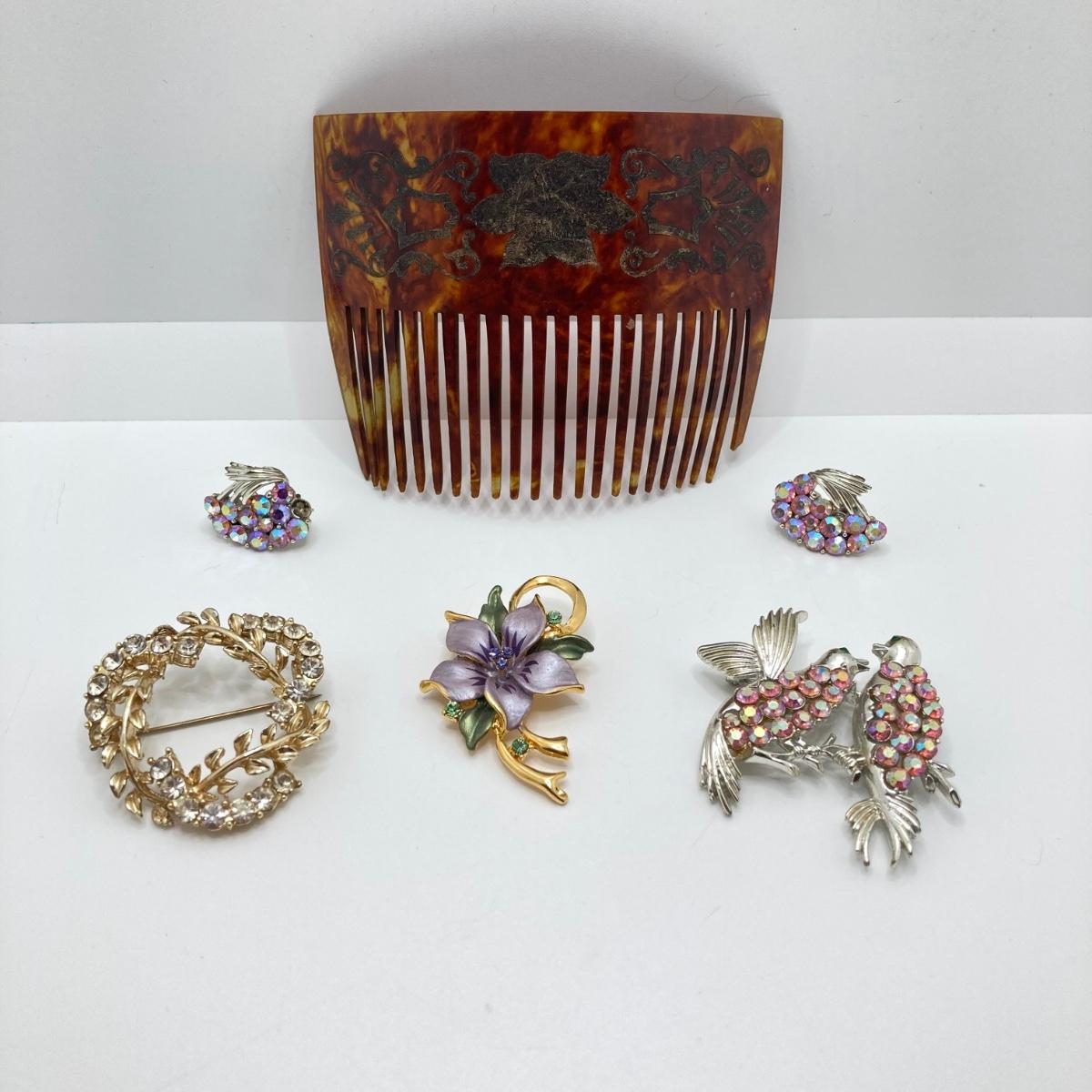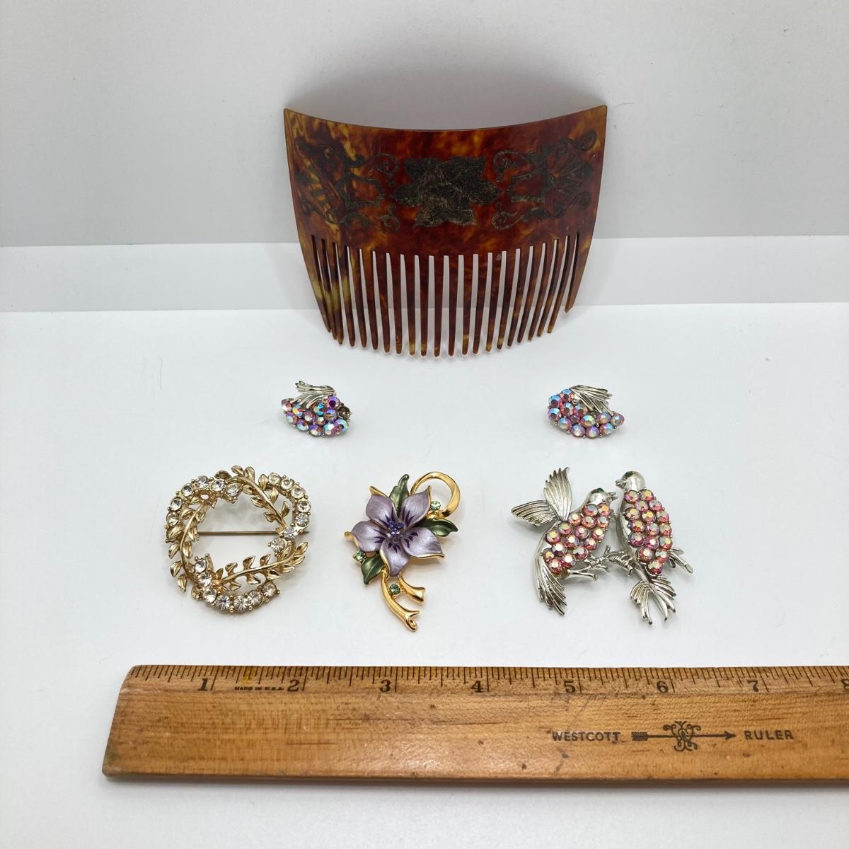 LOT 79: Vintage Jewelry and More - Coro Brooches, Love Birds Set and Tortoise Shell with Overlay Hair Comb