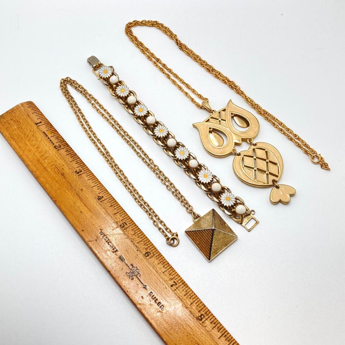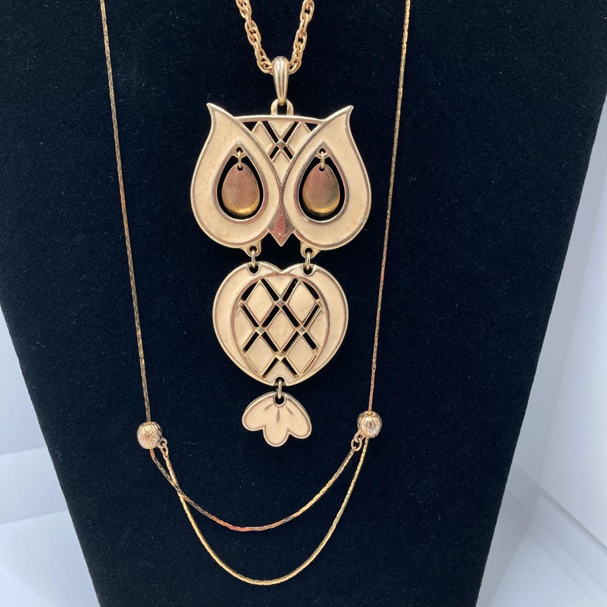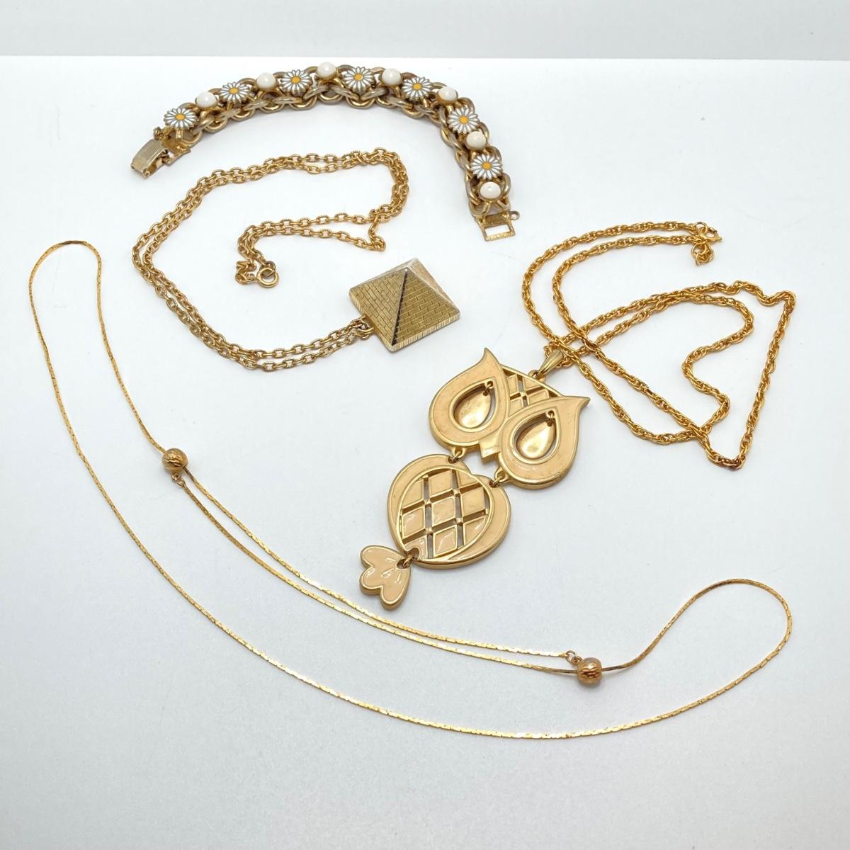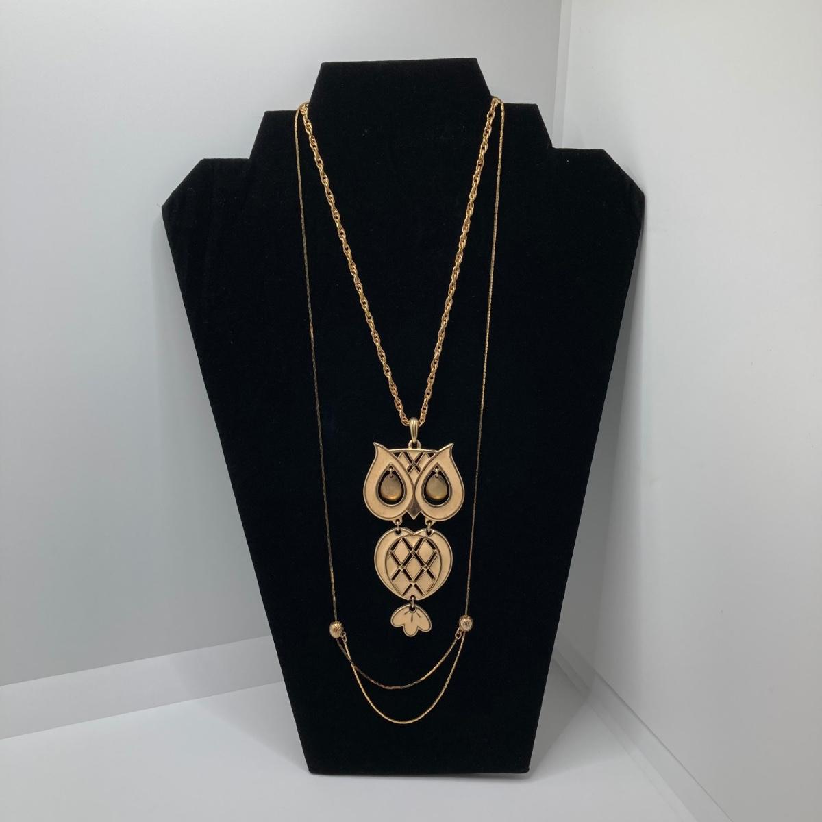 LOT 81: Vintage Gold Tone Jewelry Collection - Talisman Guild 1976 Pyramid Pendant Necklace, Articulated Owl Necklace,