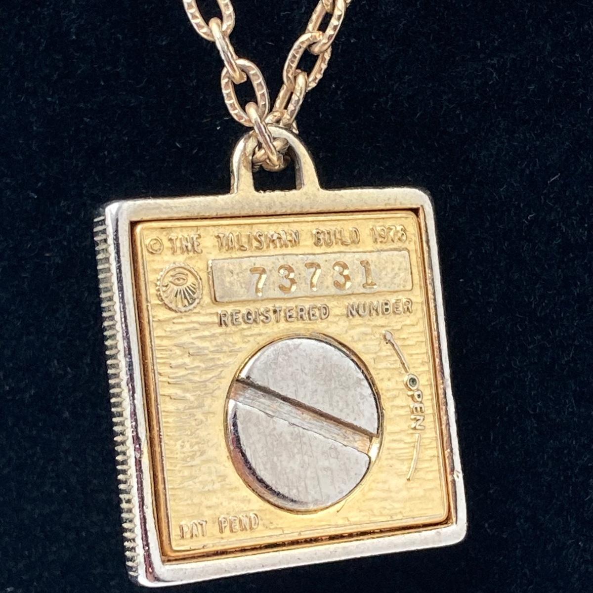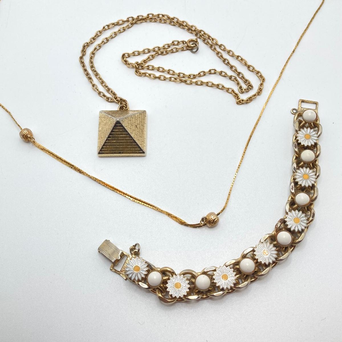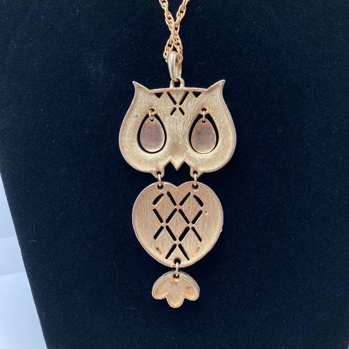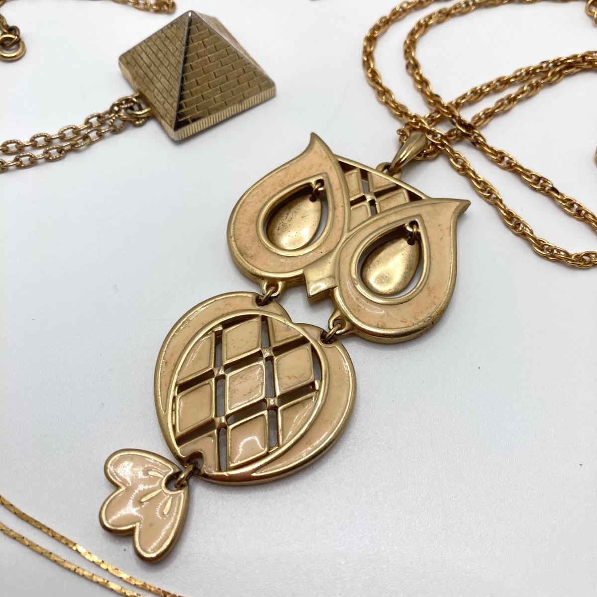 LOT 81: Vintage Gold Tone Jewelry Collection - Talisman Guild 1976 Pyramid Pendant Necklace, Articulated Owl Necklace,
