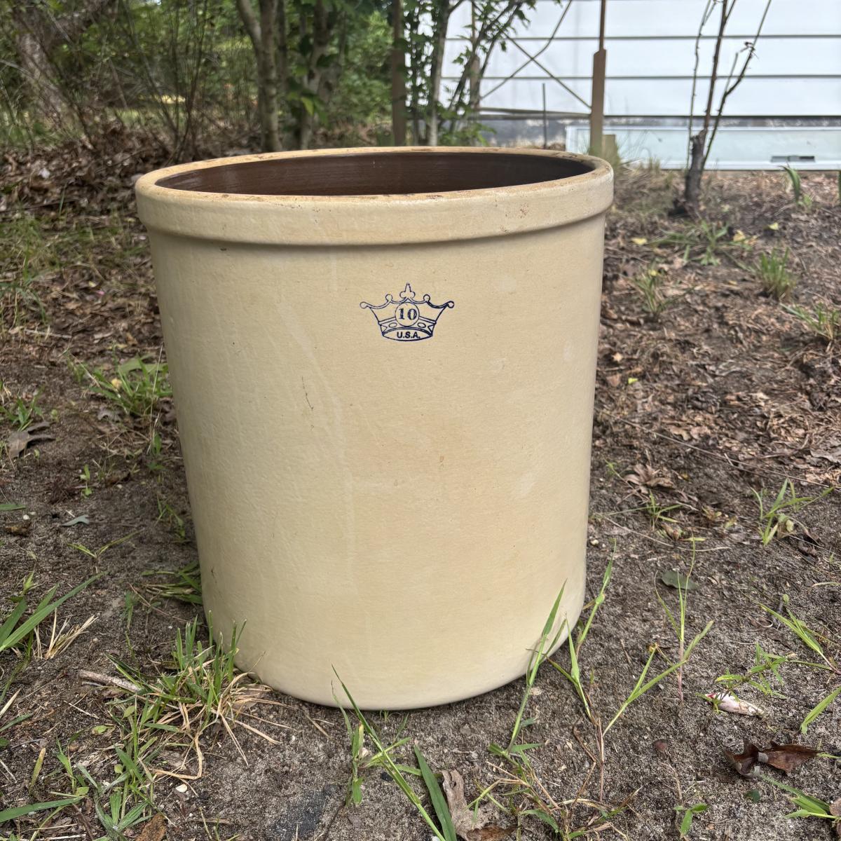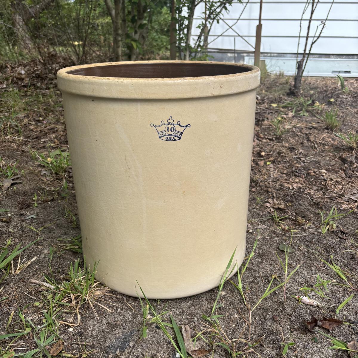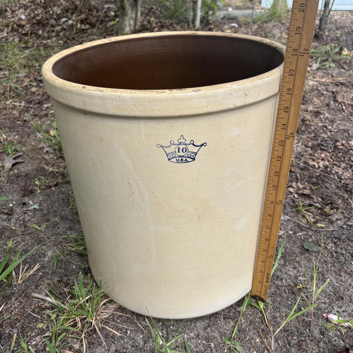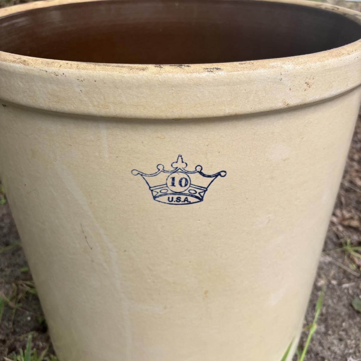 LOT 84: Vintage Robinson Ransbottom 10 Gallon Blue Crown Stoneware Crock USA