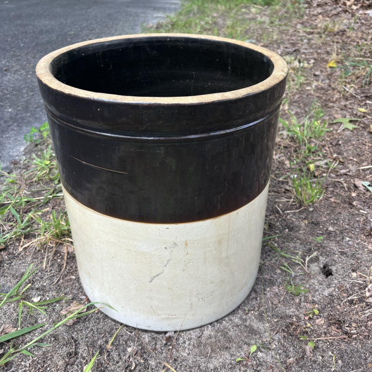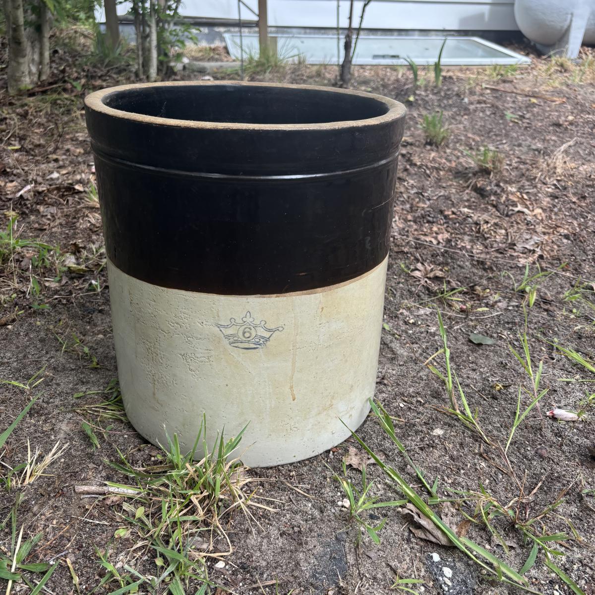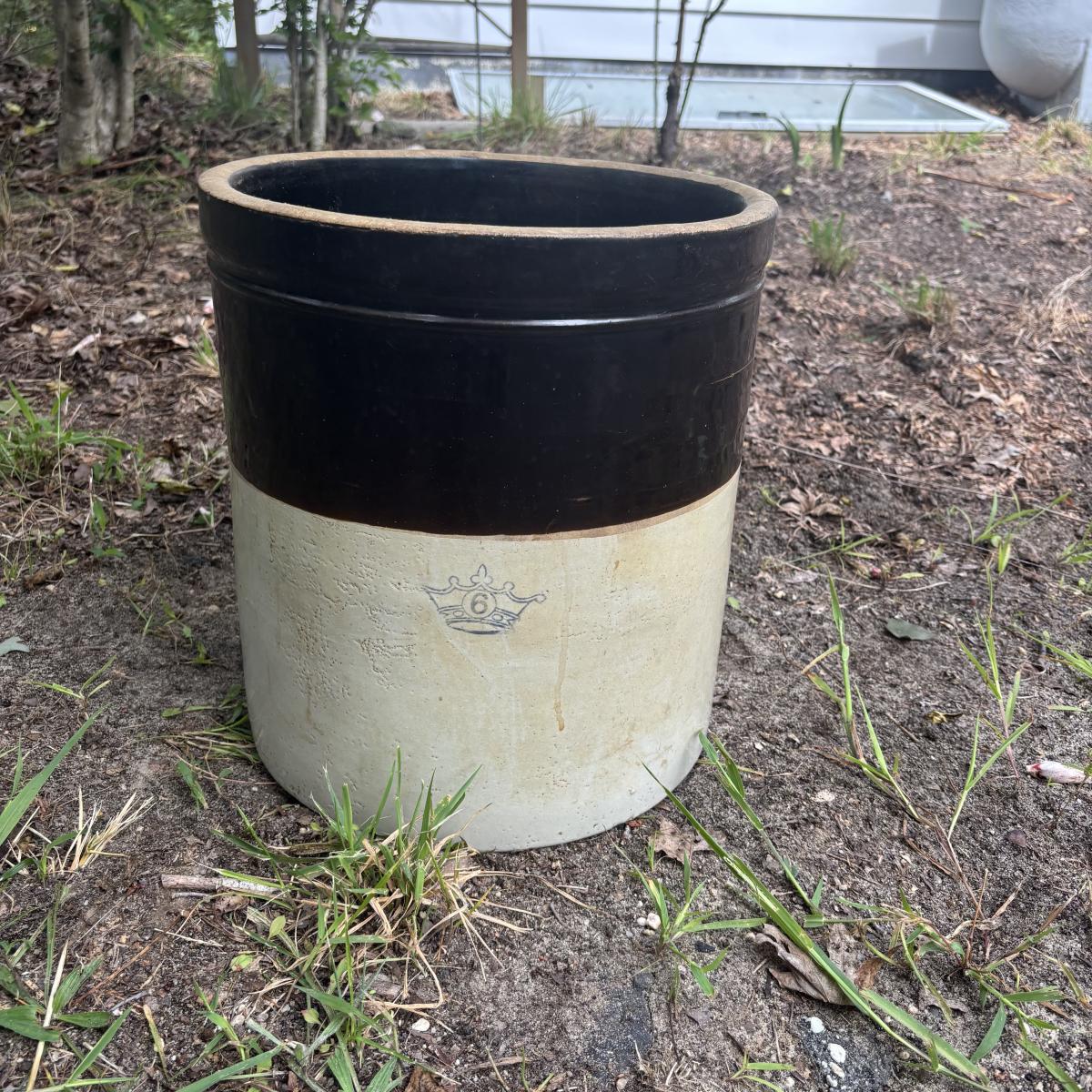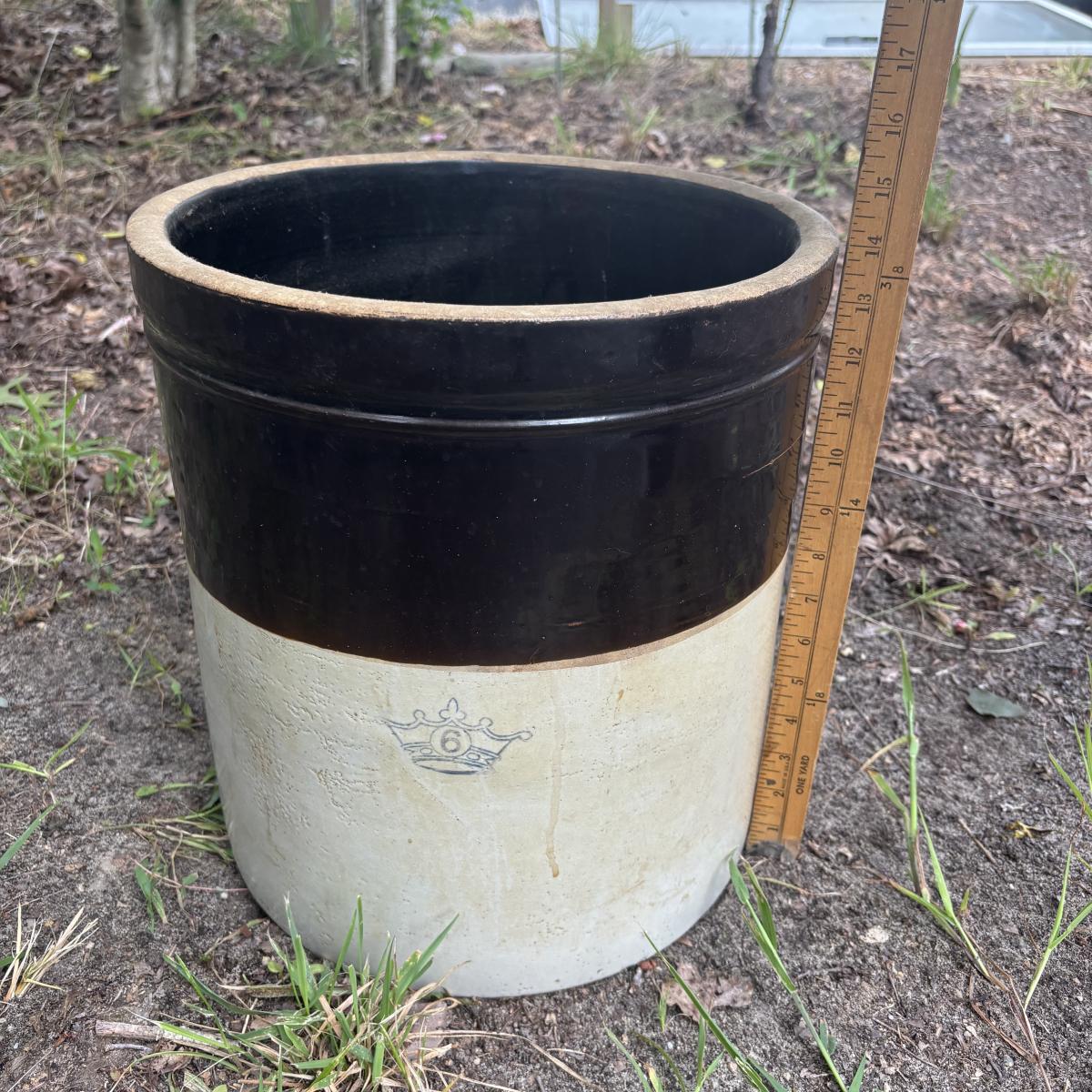 LOT 85: Vintage Two-Tone Robinson Ransbottom 6 Gallon Blue Crown Stoneware Crock USA