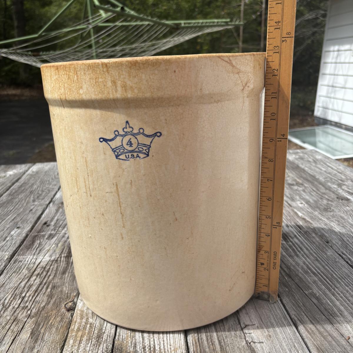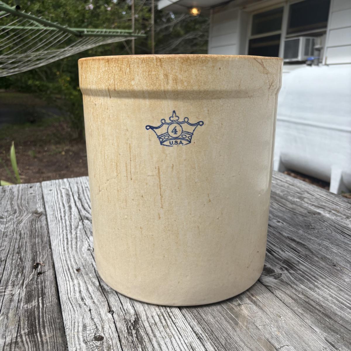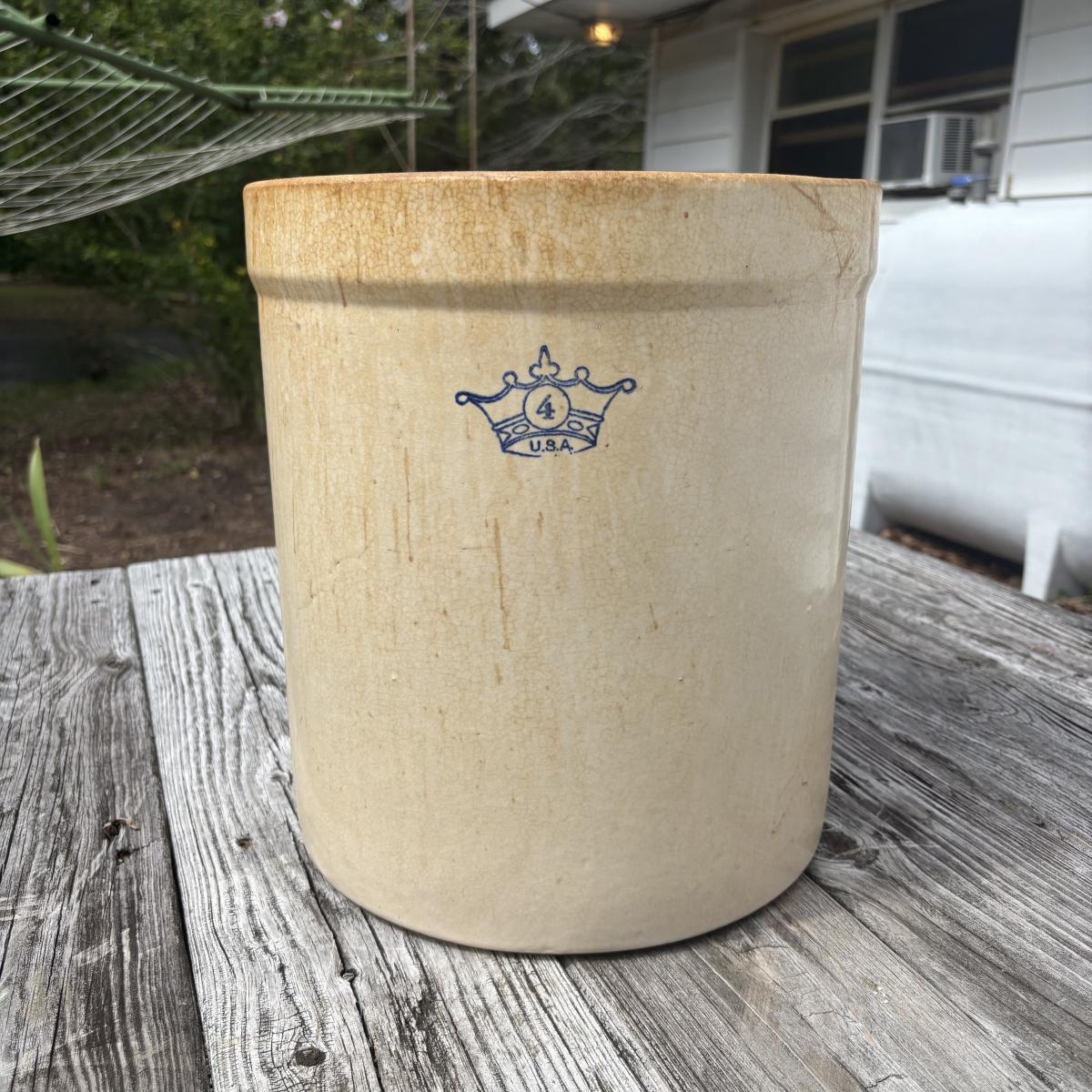 LOT 86: Vintage Robinson Ransbottom 4 Gallon Blue Crown Stoneware Crock USA