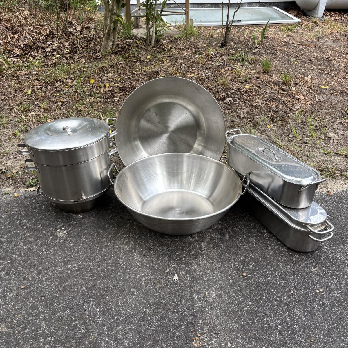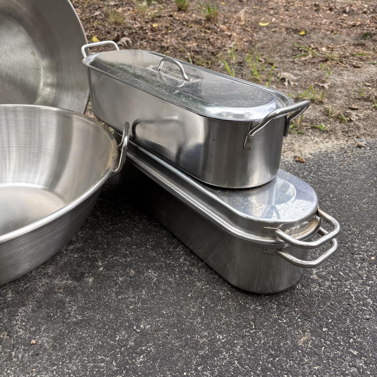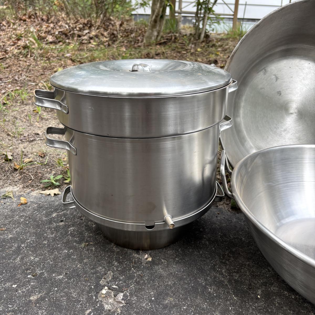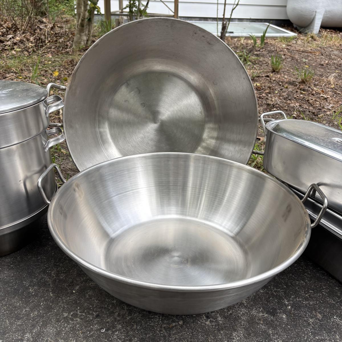 LOT 93: Stainless Steel Cookware Collection: Flatbottom Pan/Wok (2), Juicer Pot Made in Finland, Poacher/Steamer Pots