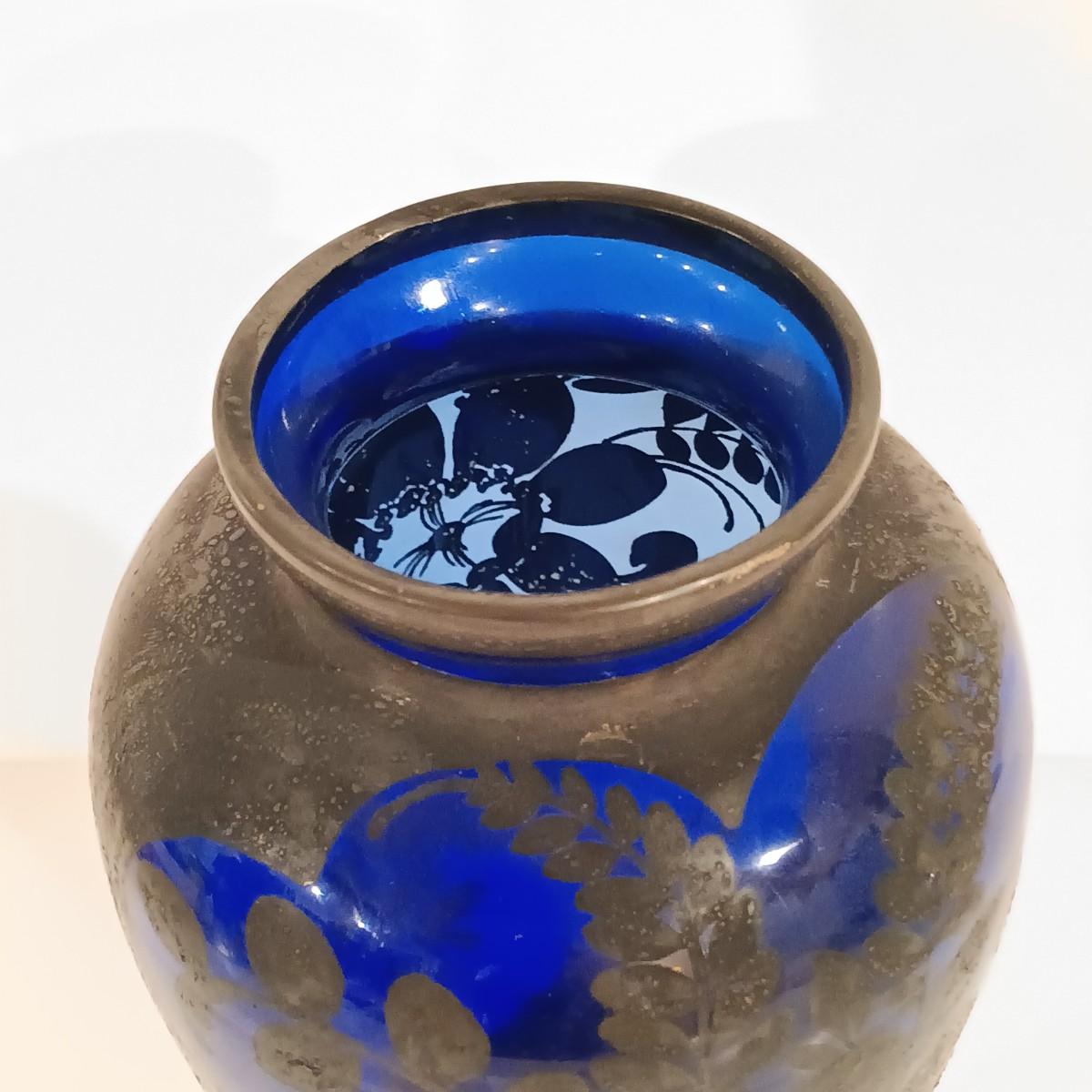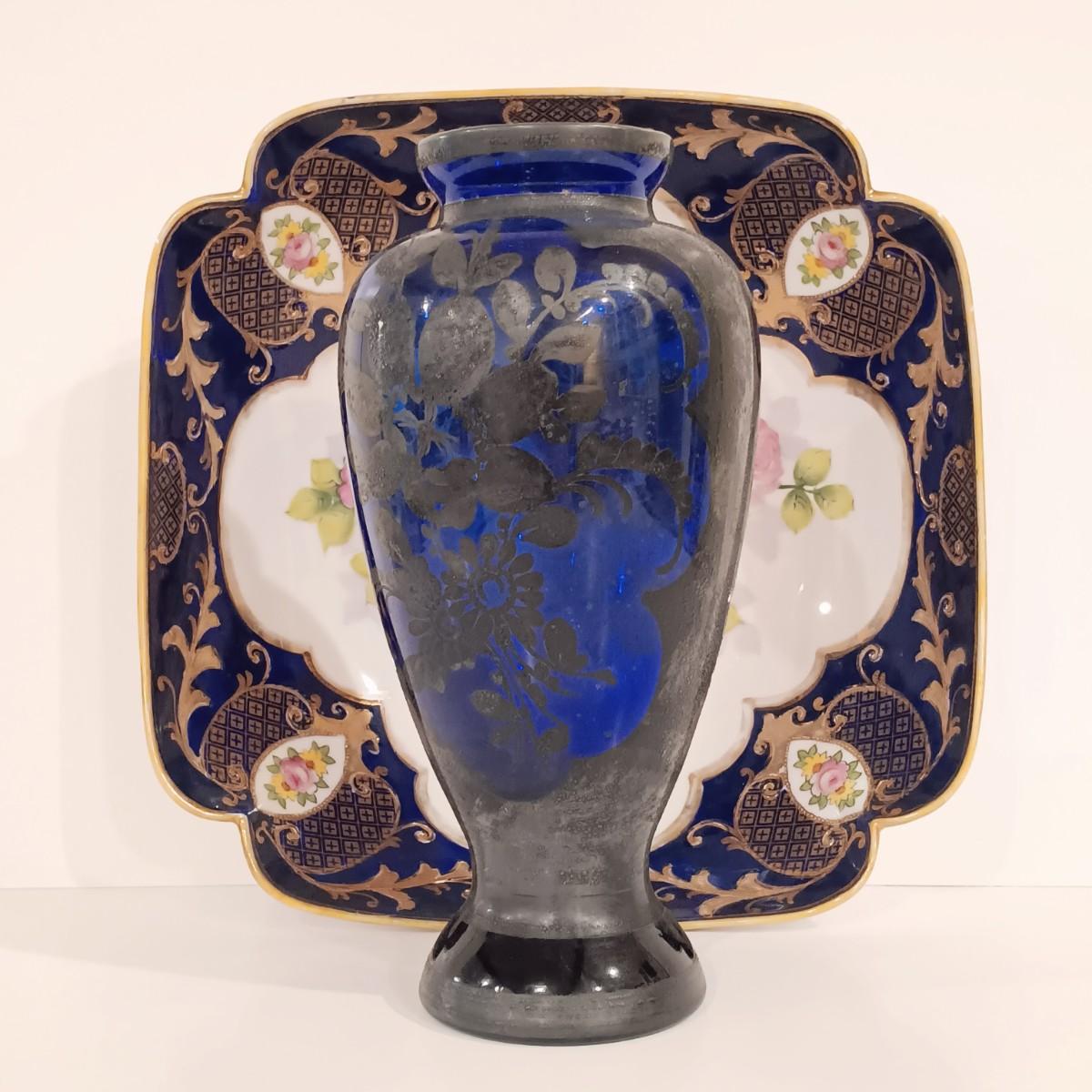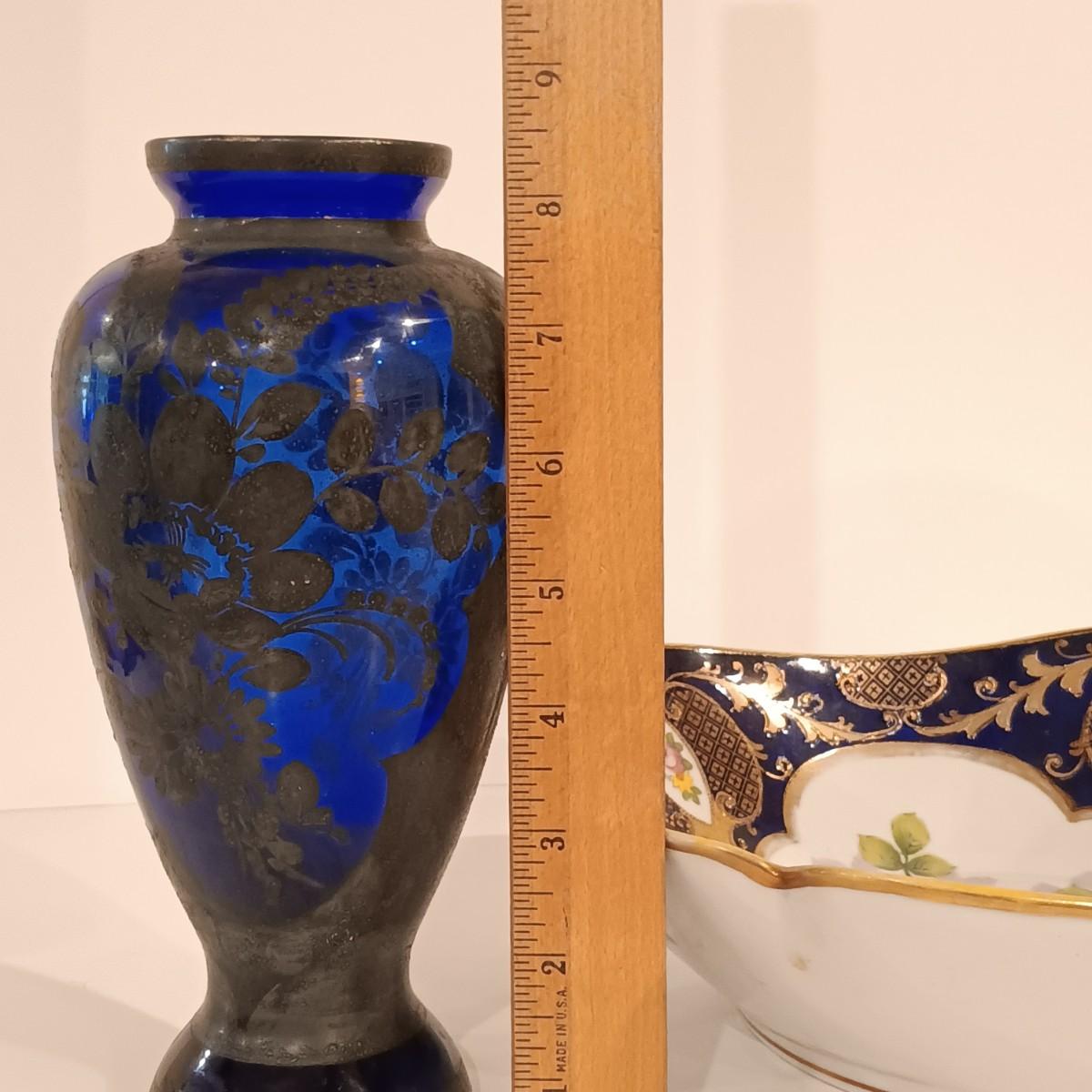 LOT 115; Cobalt Blue Vase with Silver-Tone Overlay & Noritake Cobalt Handpainted Plate