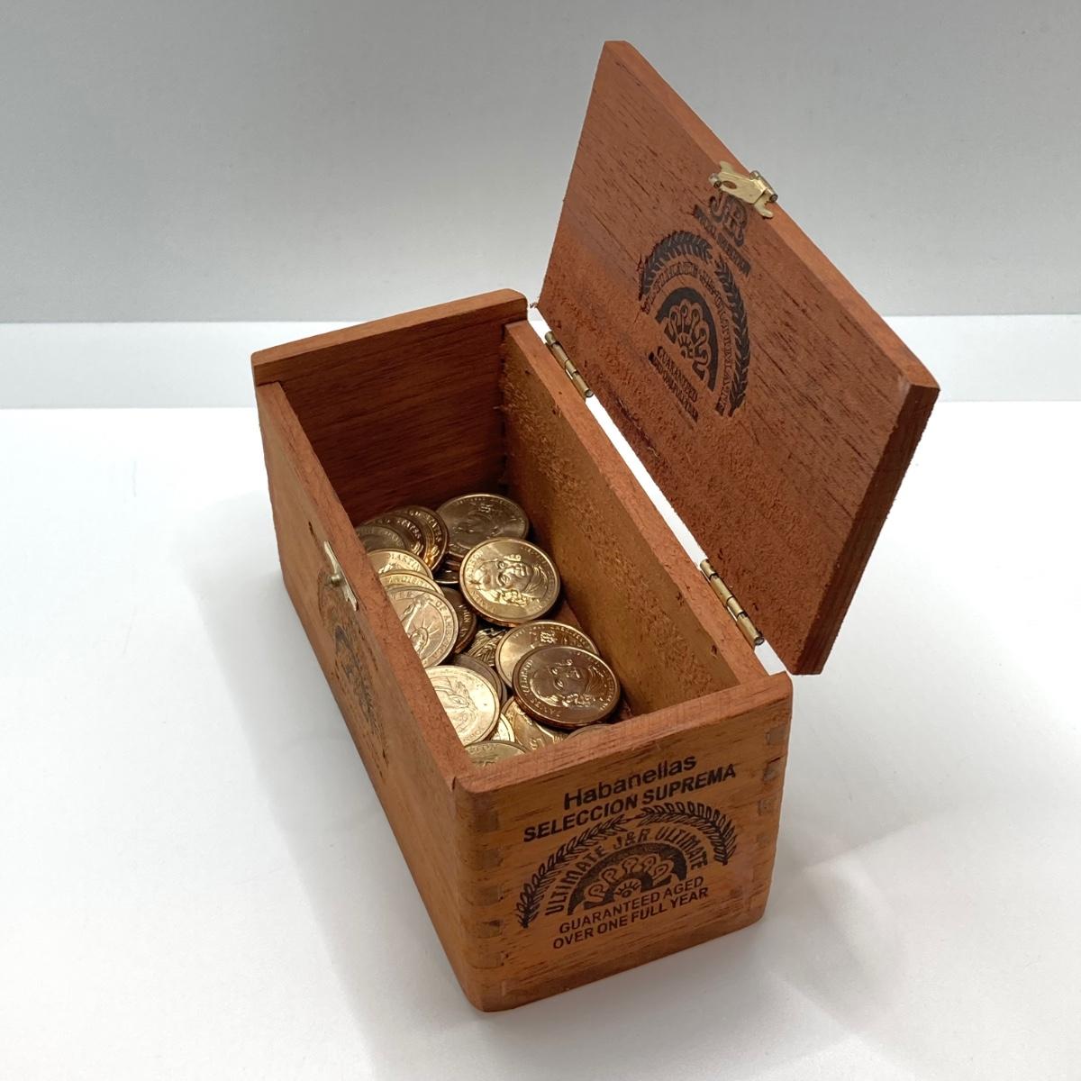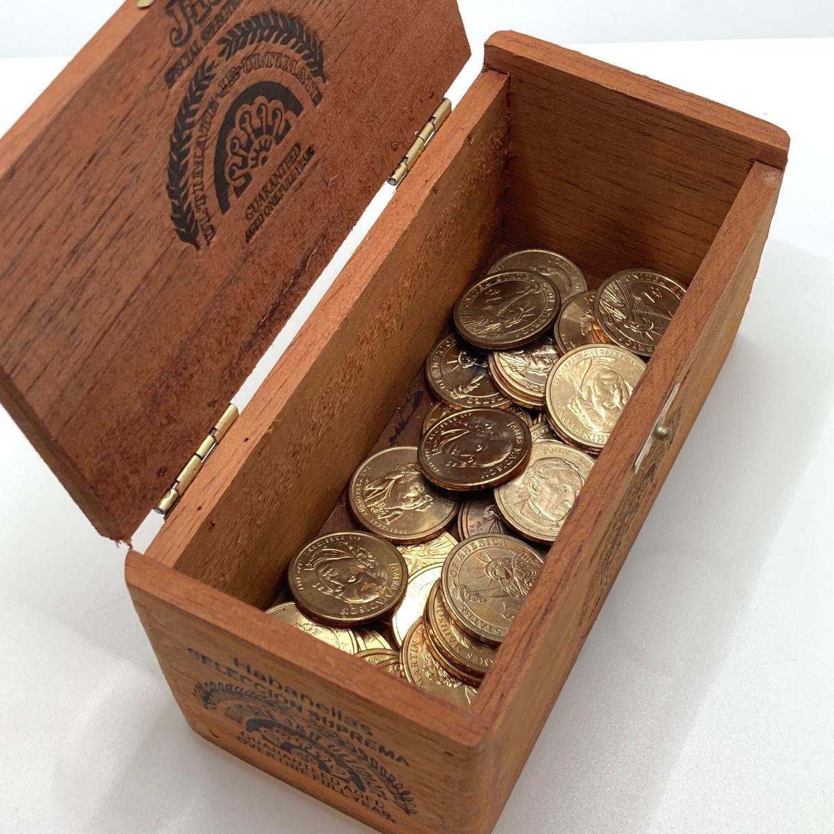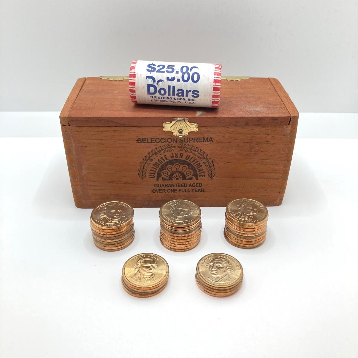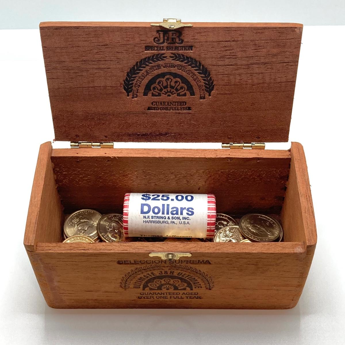 LOT 136: Collection of US President One Dollar $1.00 Loose Coins with $25 Uncirculated Roll of Thomas Jefferson Dollars in Cigar Box
