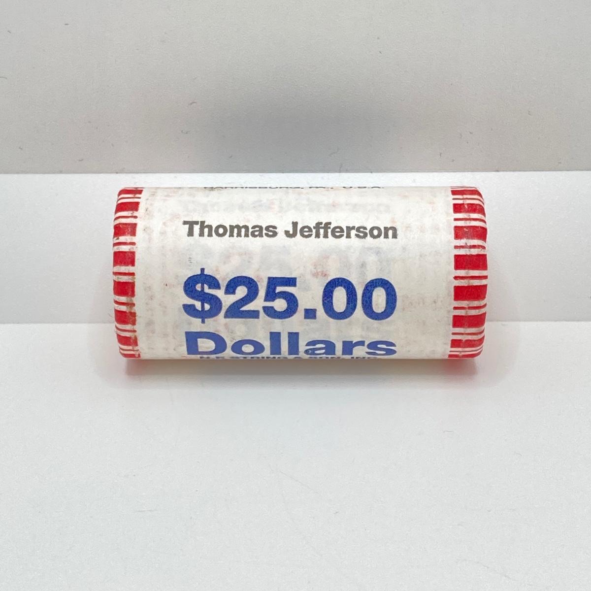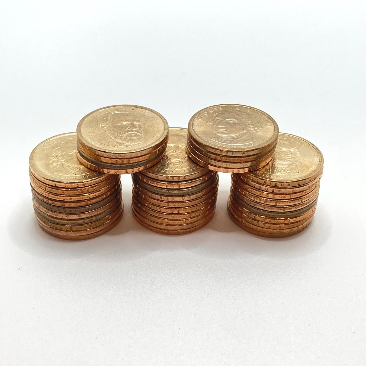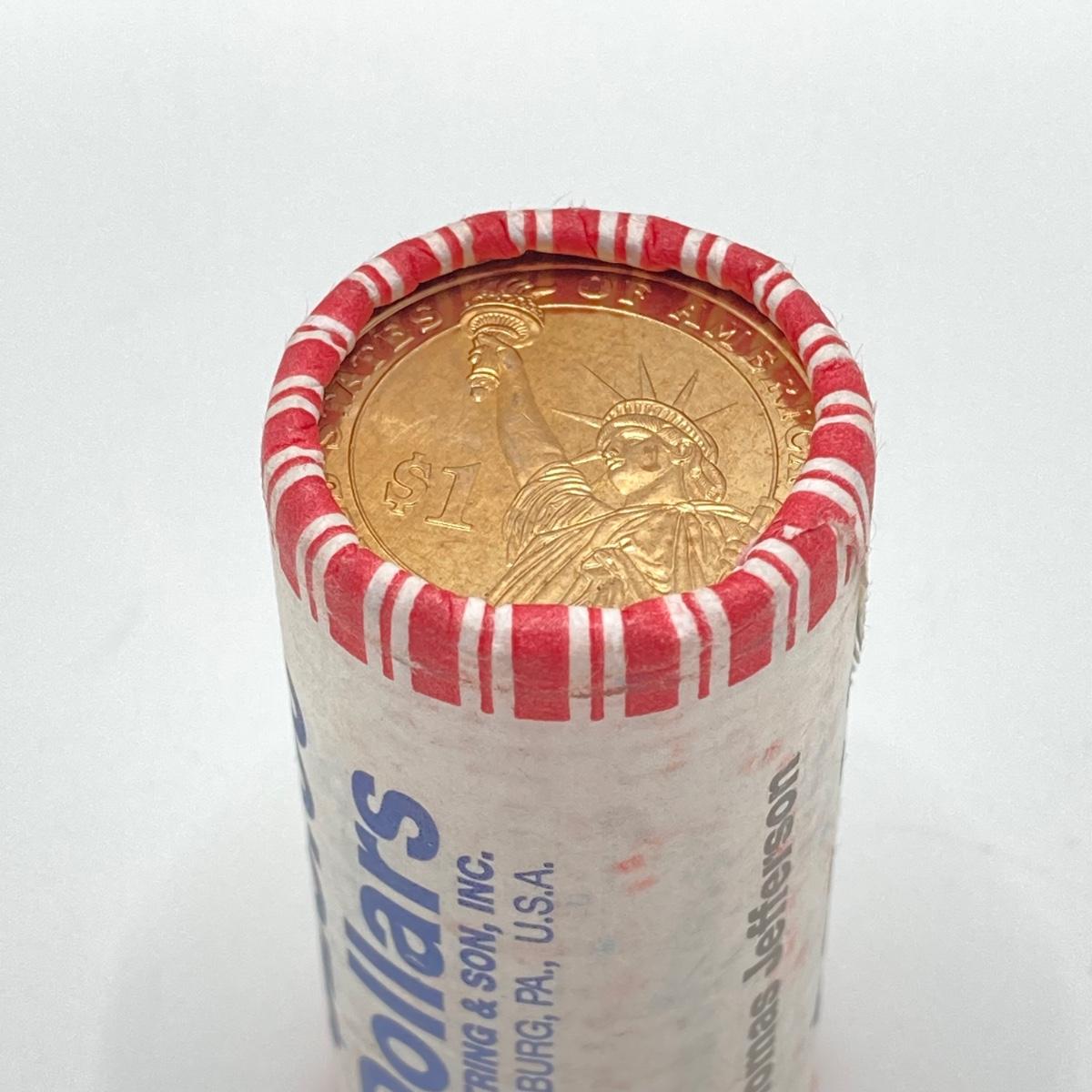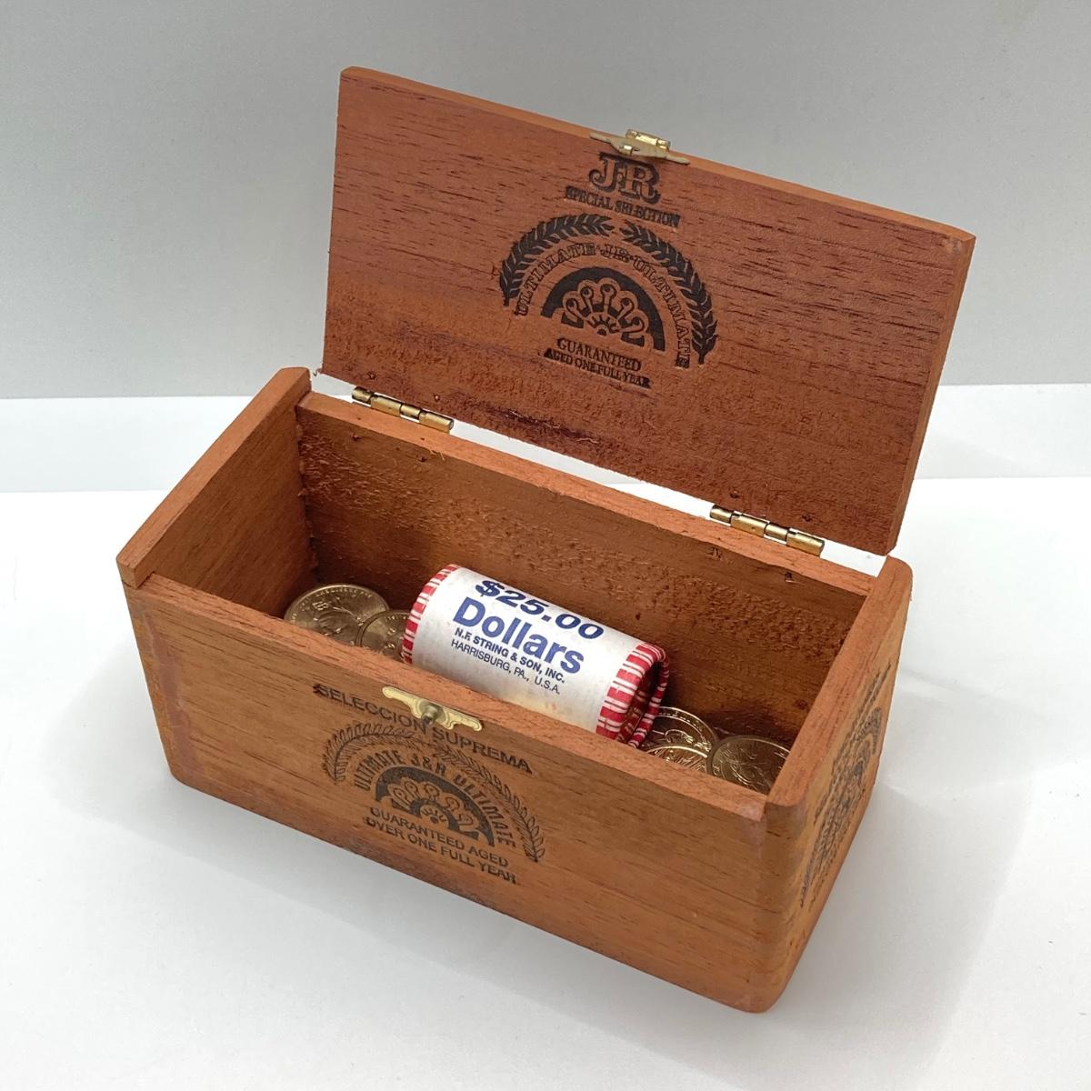 LOT 136: Collection of US President One Dollar $1.00 Loose Coins with $25 Uncirculated Roll of Thomas Jefferson Dollars in Cigar Box