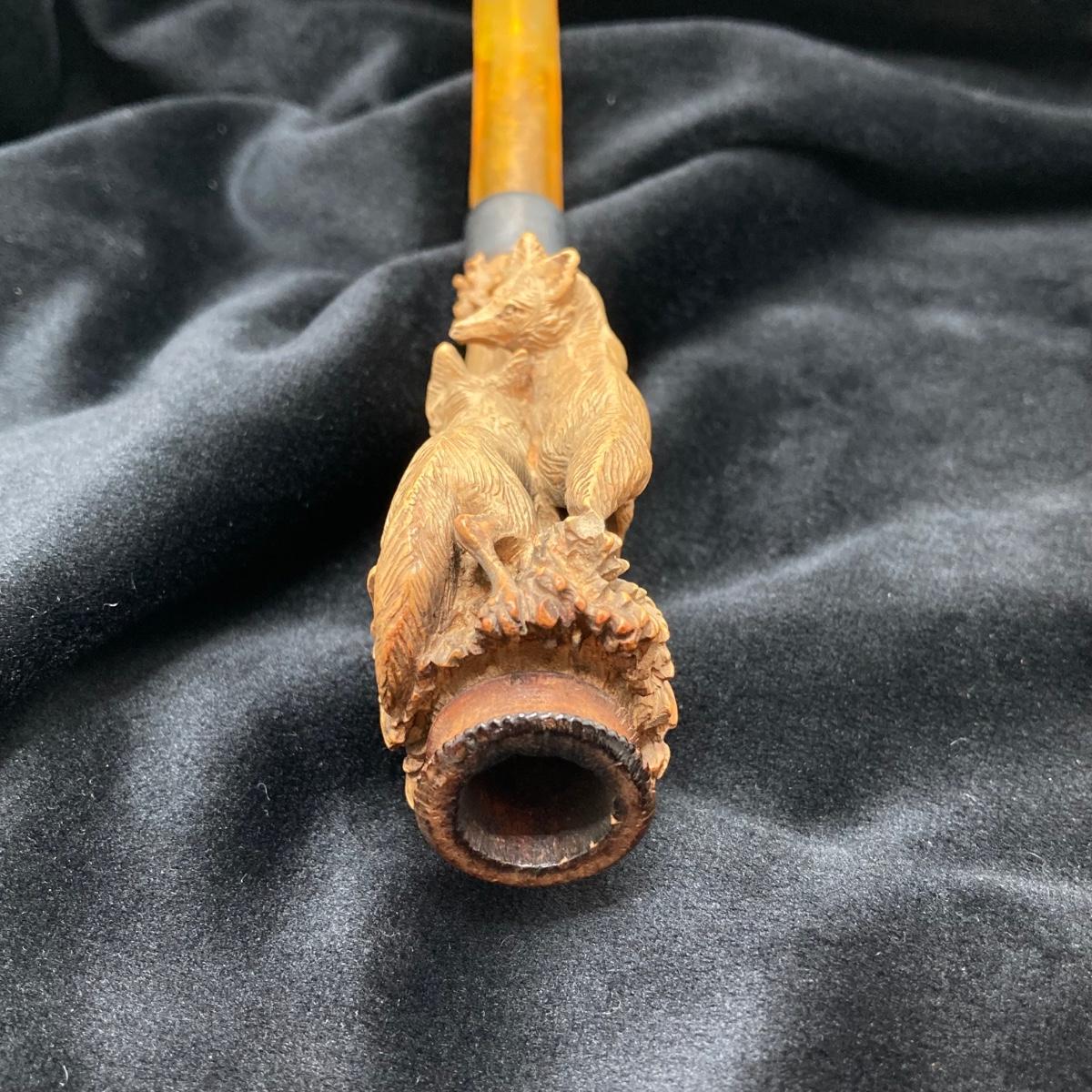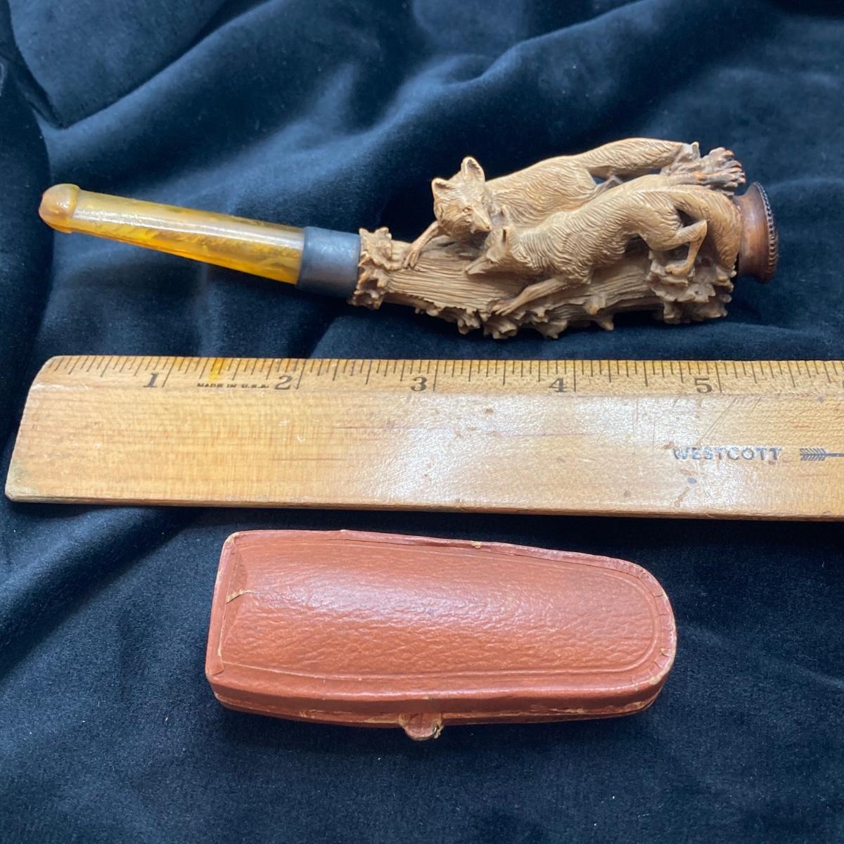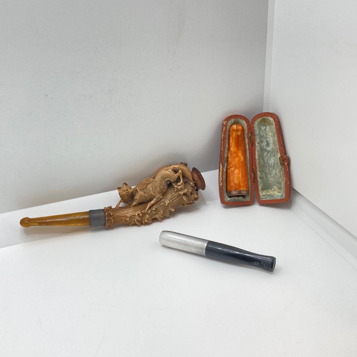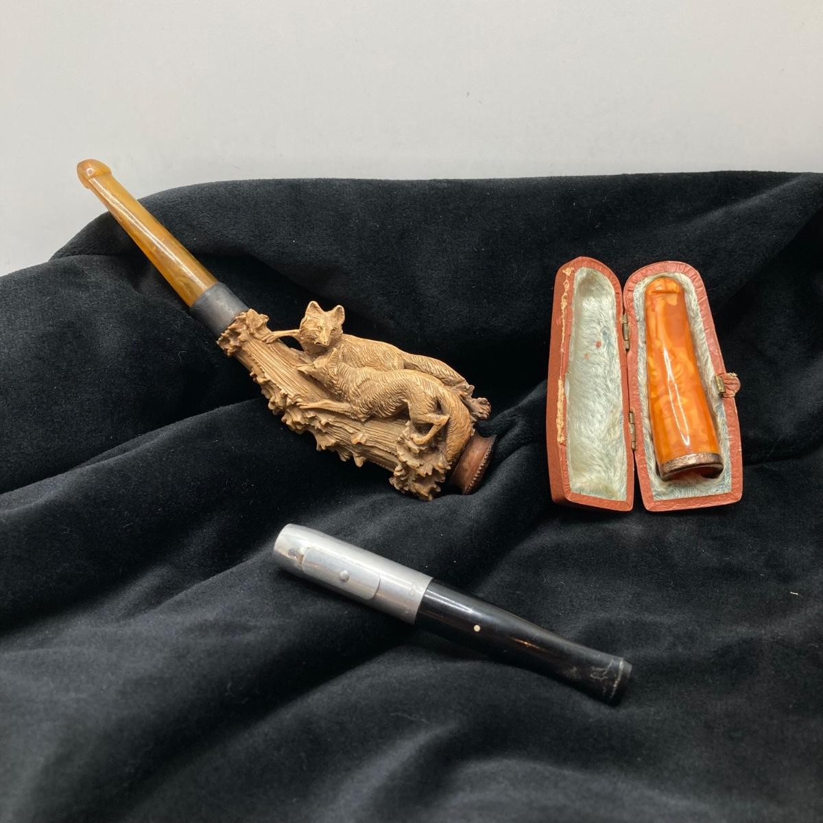 LOT 154: Vintage /Antique Unique Carved Foxes Cigar/Cigarette Holder, Echt Bernstein Case with Tip and Denicotea Holder
