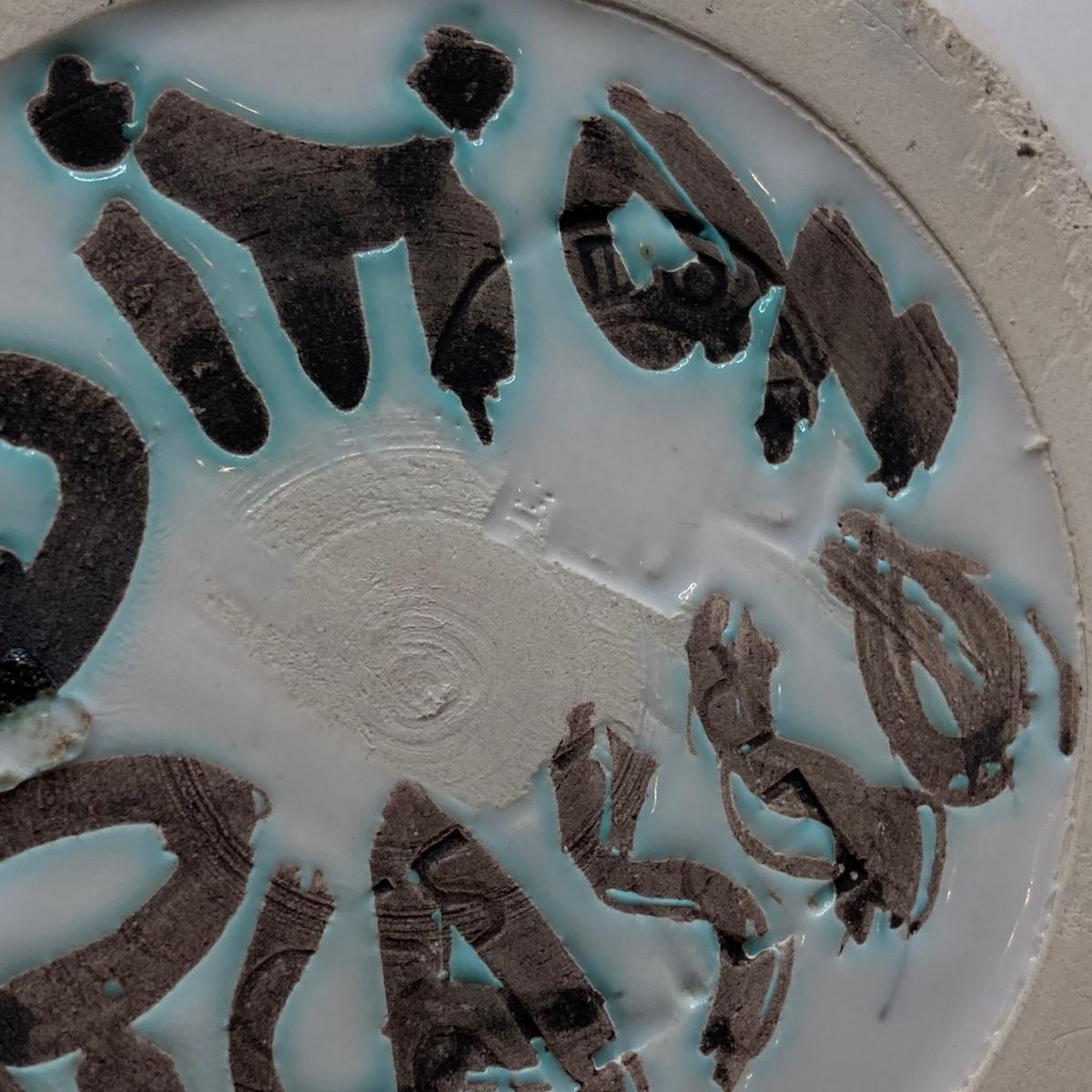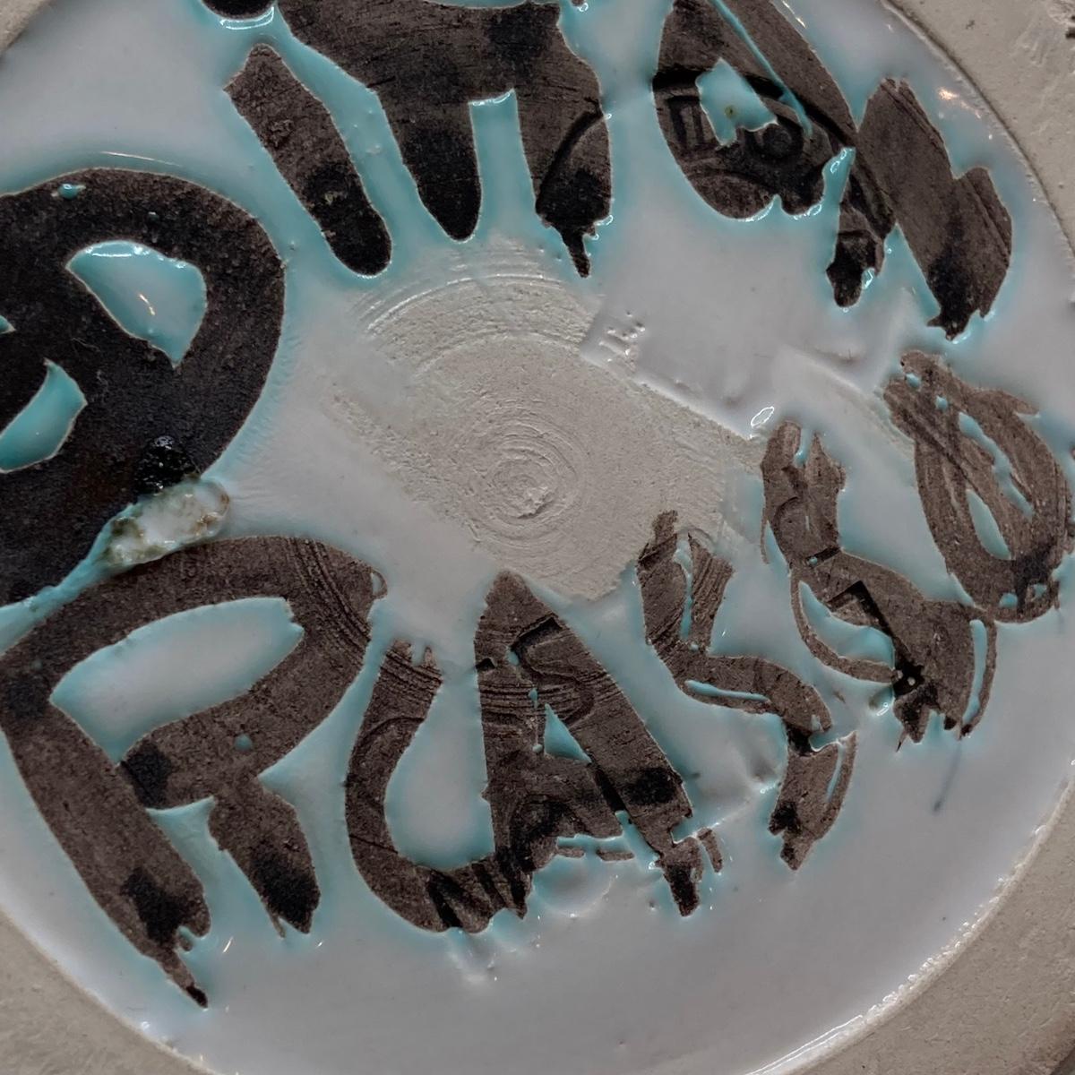 Partially glazed white earthenware clay turned round ash-tray, painted in black