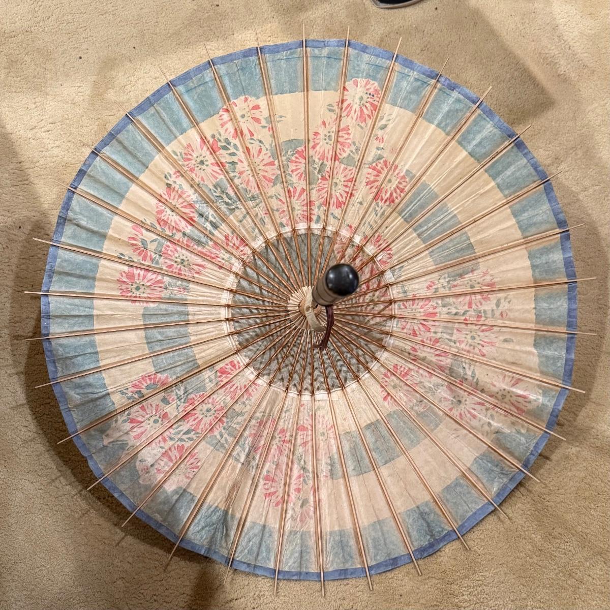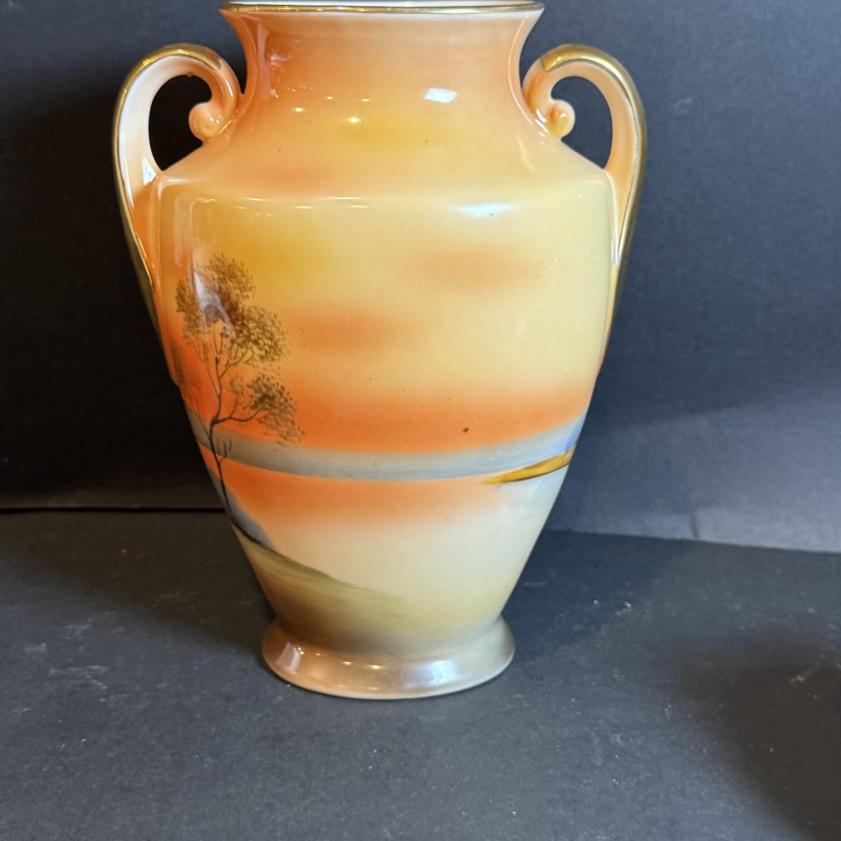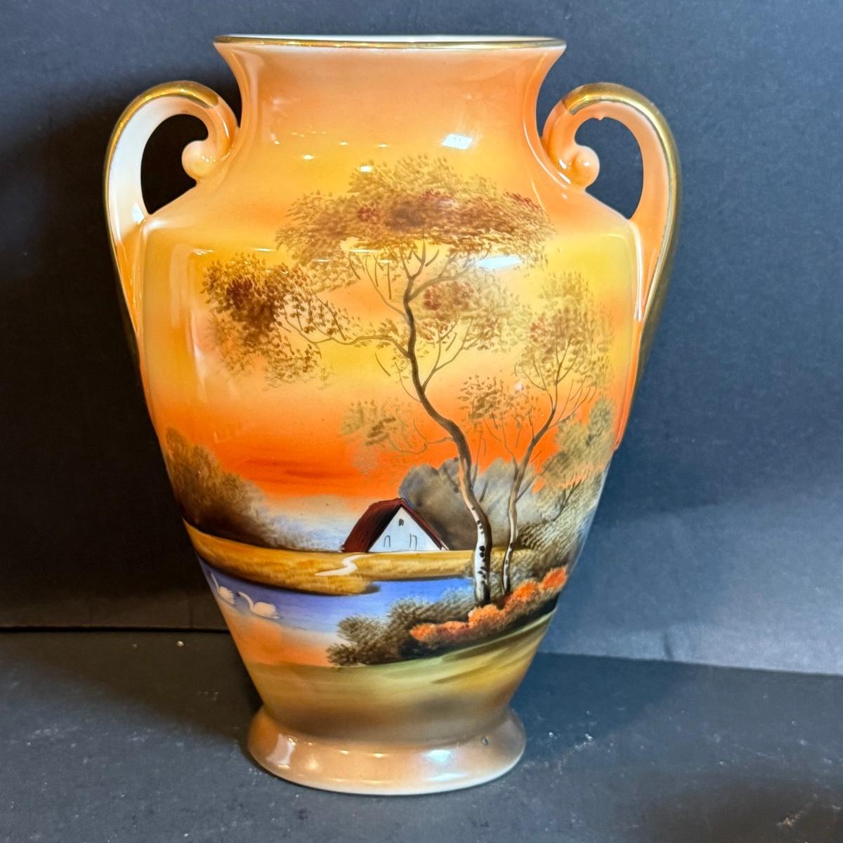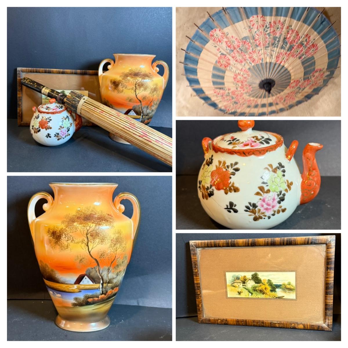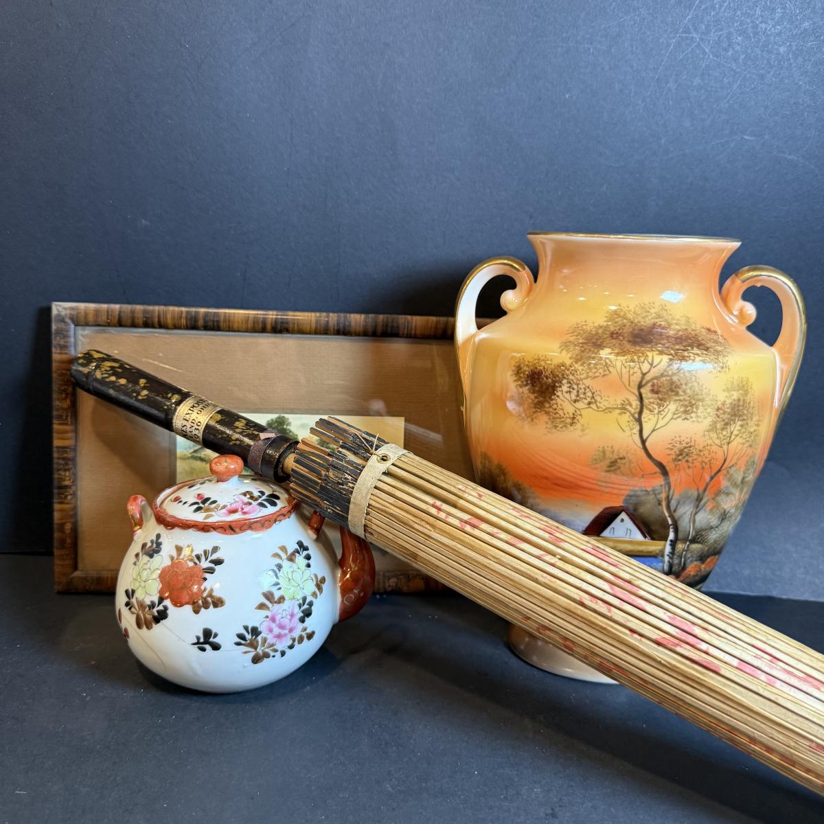 LOT 169: Asian Inspired Collection - Noritake Landscape Vase, Floral Teapot, Vintage Wall Art and Paper Umbrella from 1936