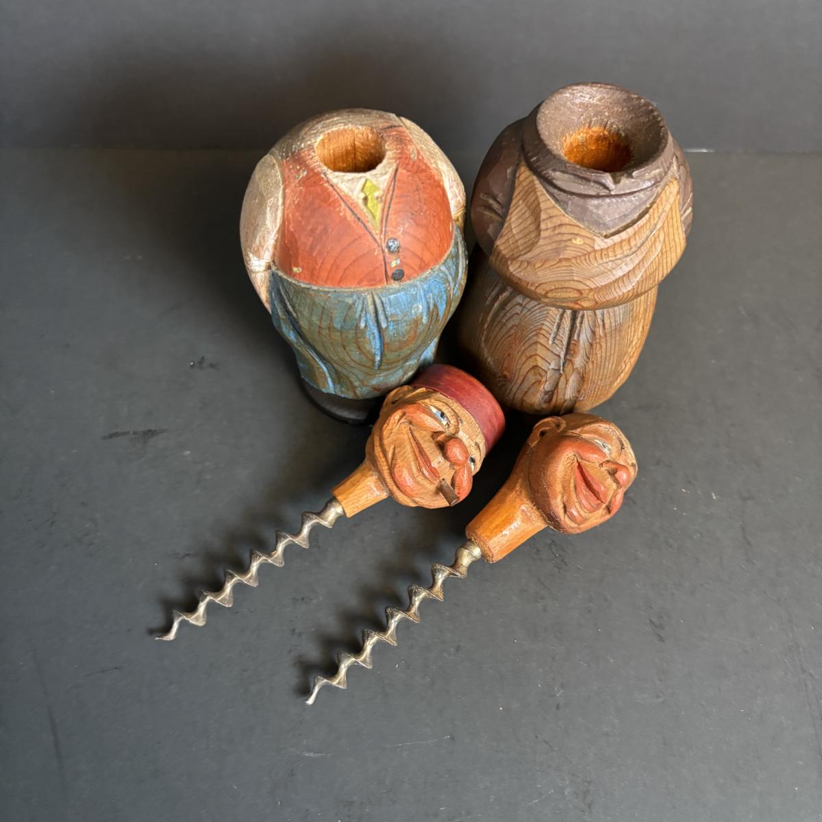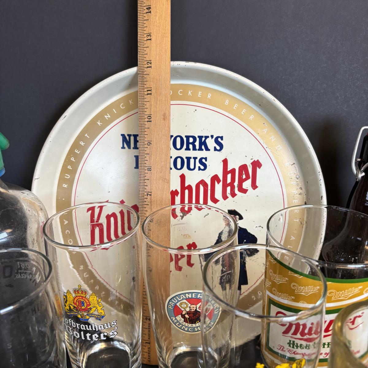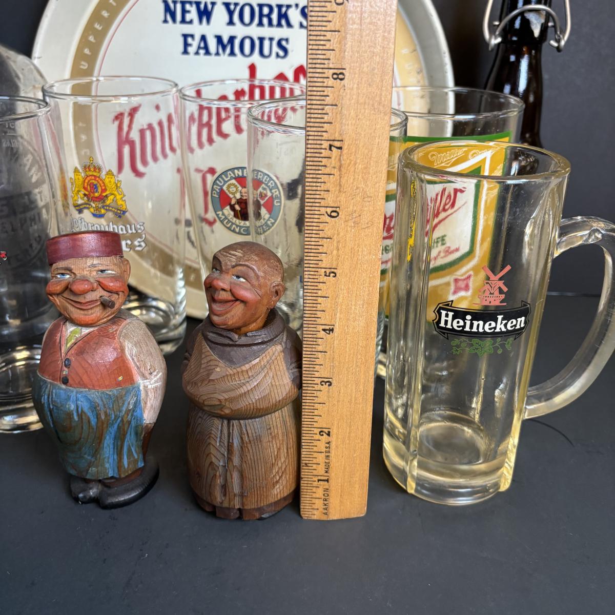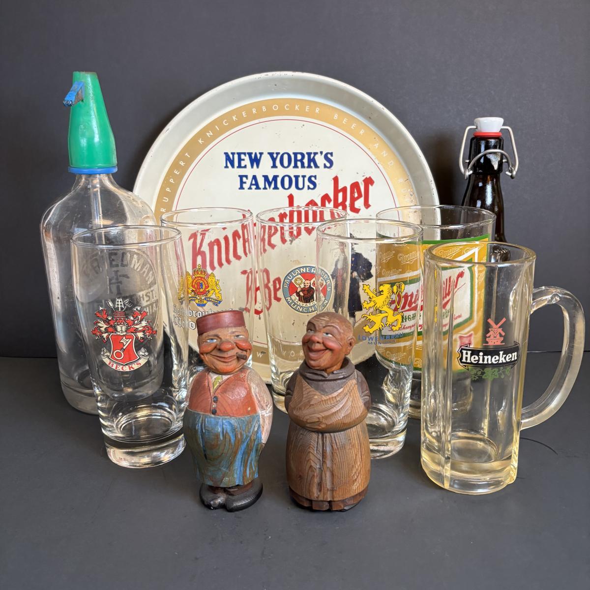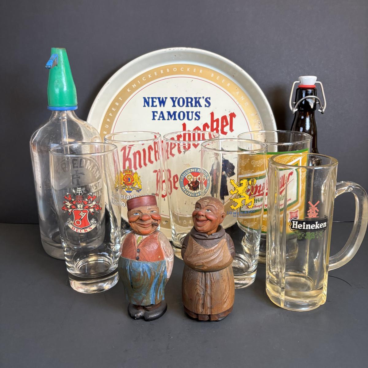 LOT 197: Vintage Barware Collection: Carved Corkscrews Set, Knickerbocker Beer Serving Tray, Philadelphia Seltzer Bottle & More