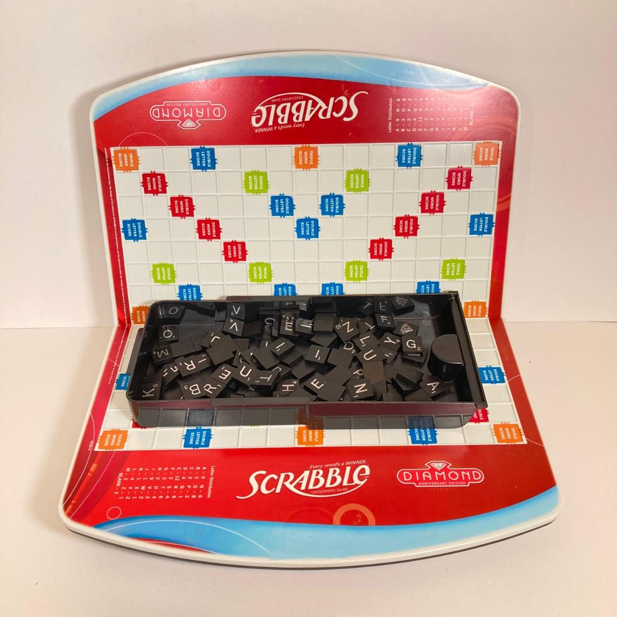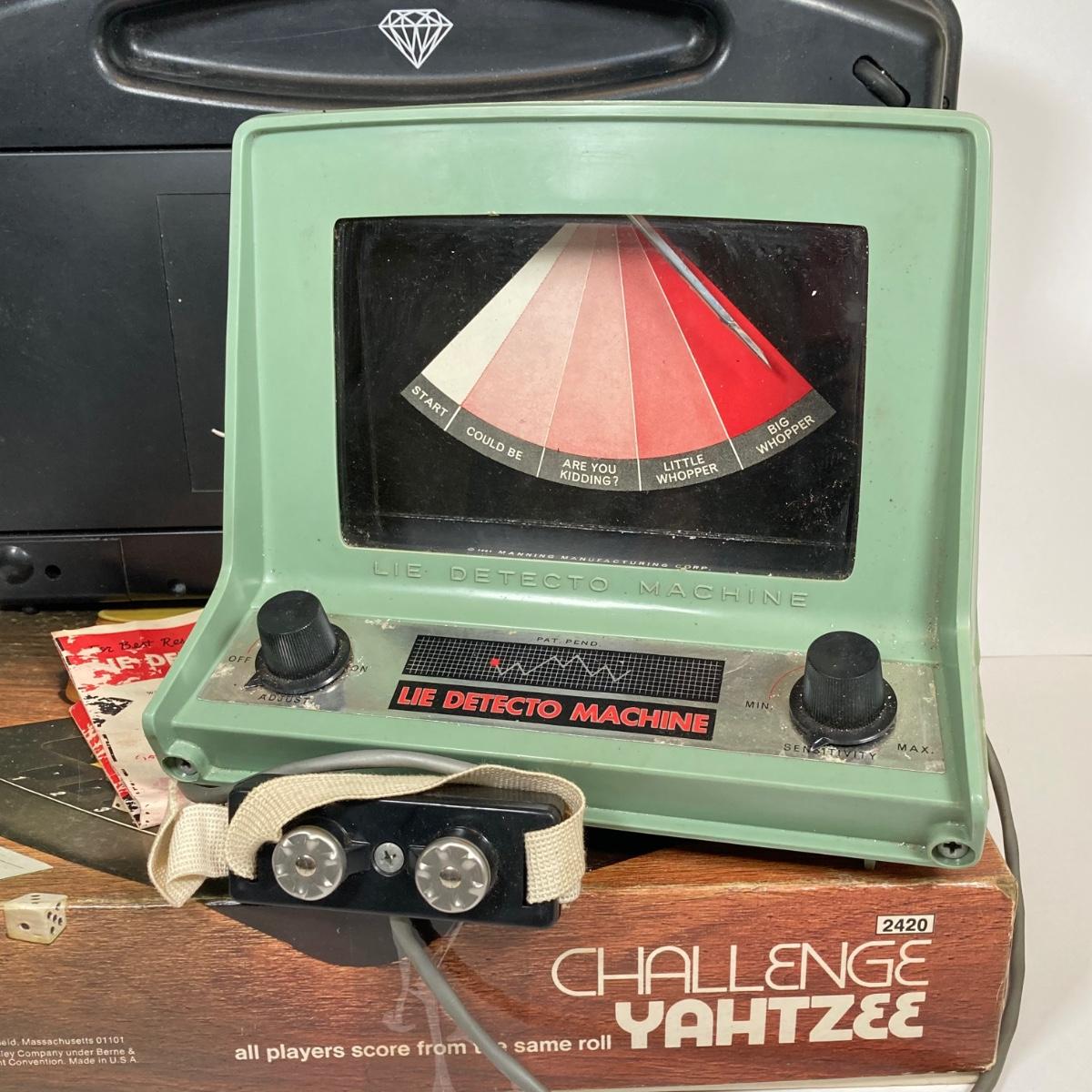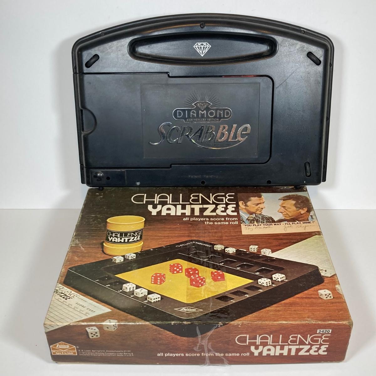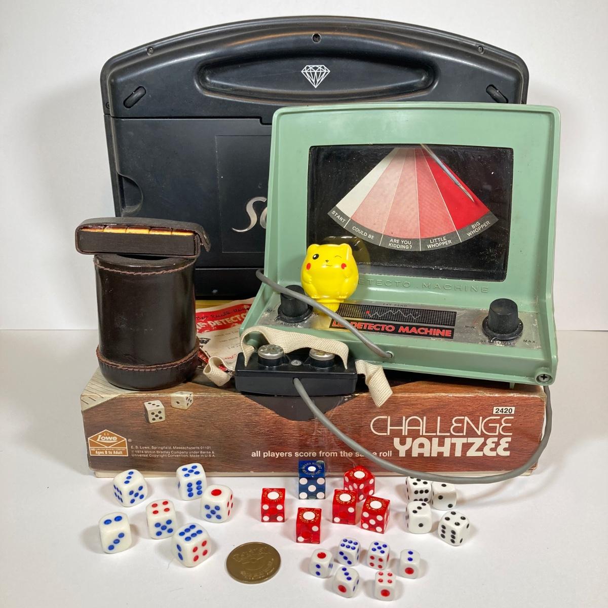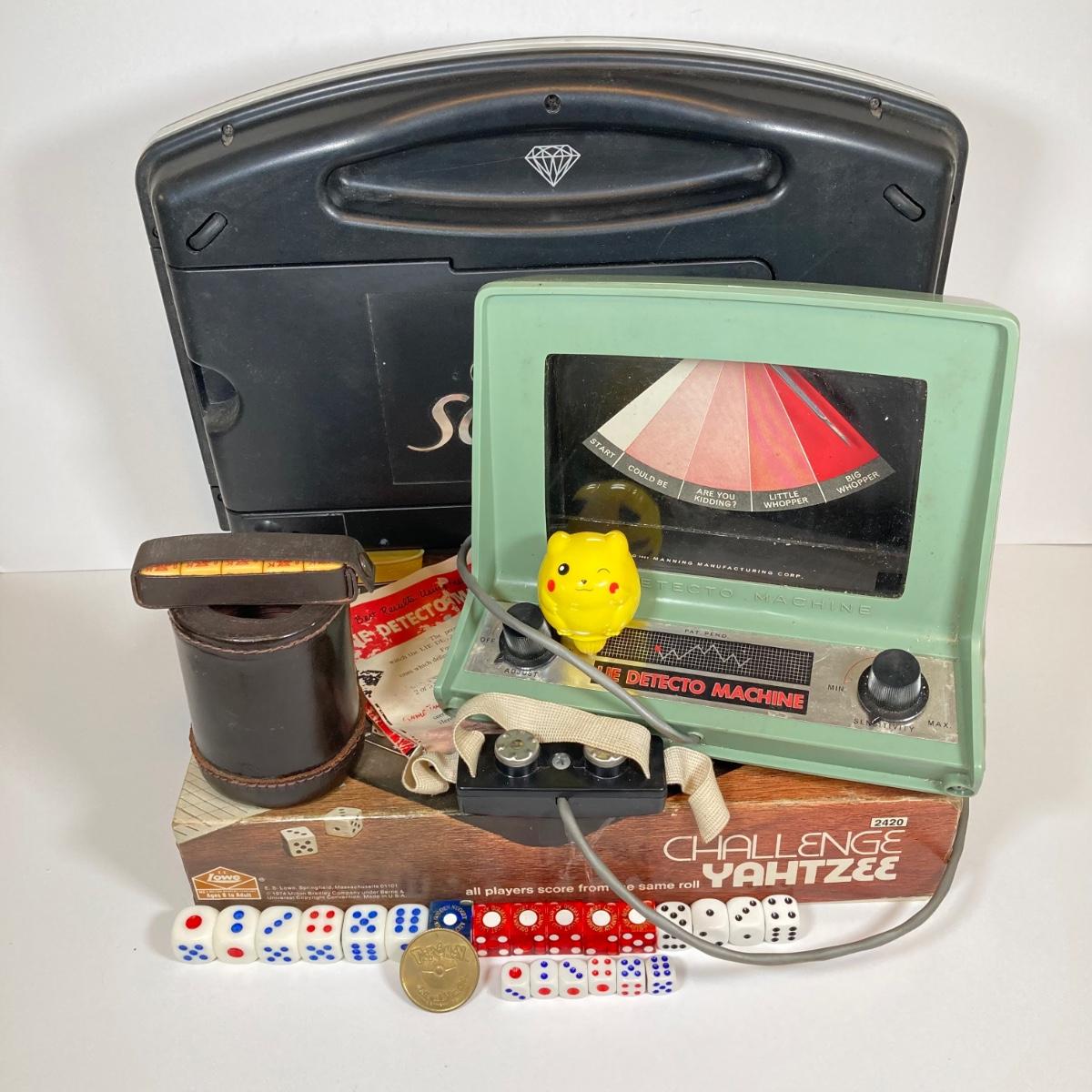 LOT 181: Vintage Game Collection - Scrabble Diamond Anniversary Edition (Rotating Board), Pokemon Pikachu Top / Token Coin, Lie Detecto Machine, Challenge Yahtzee and More