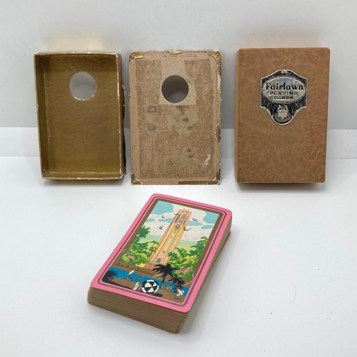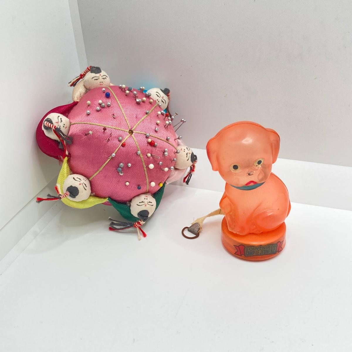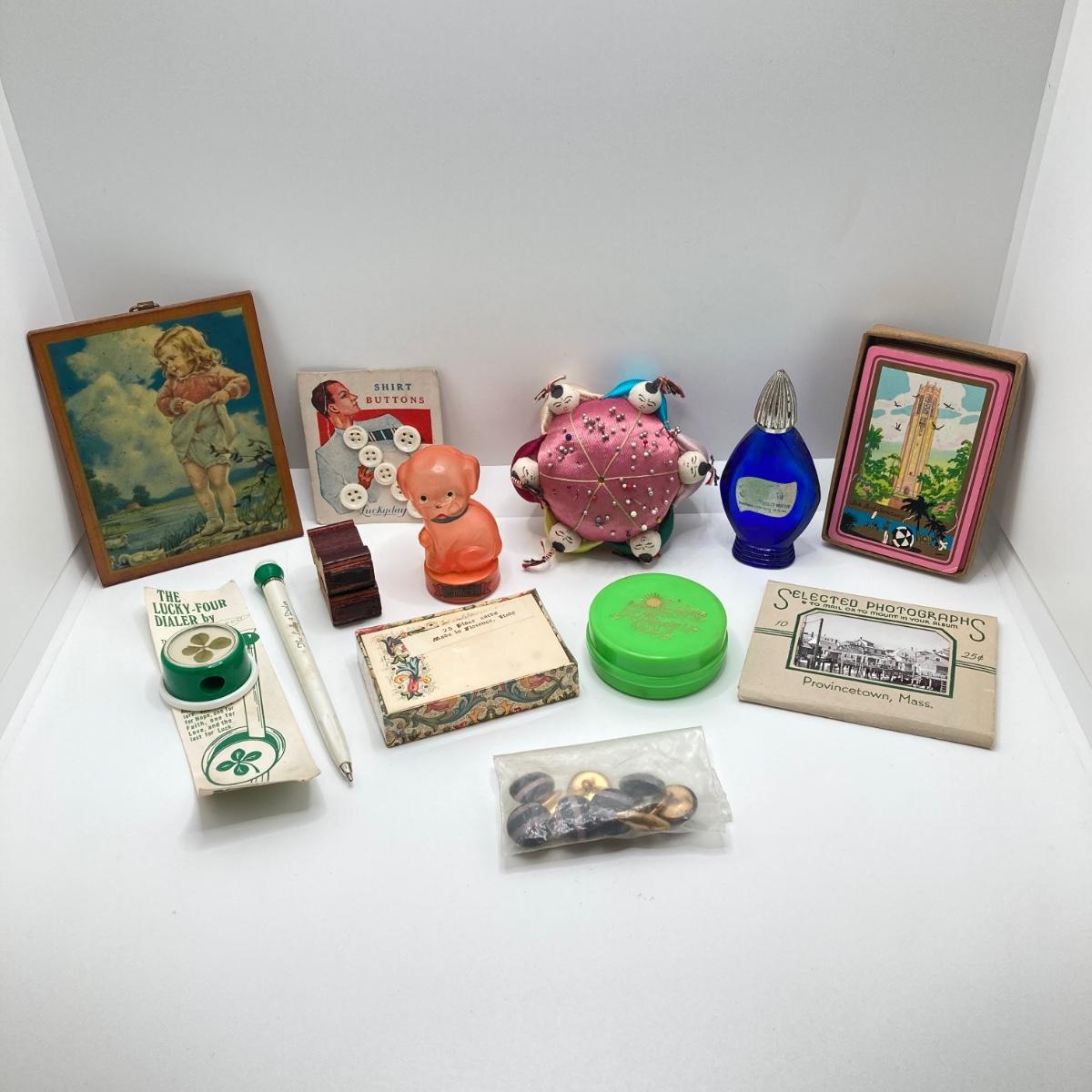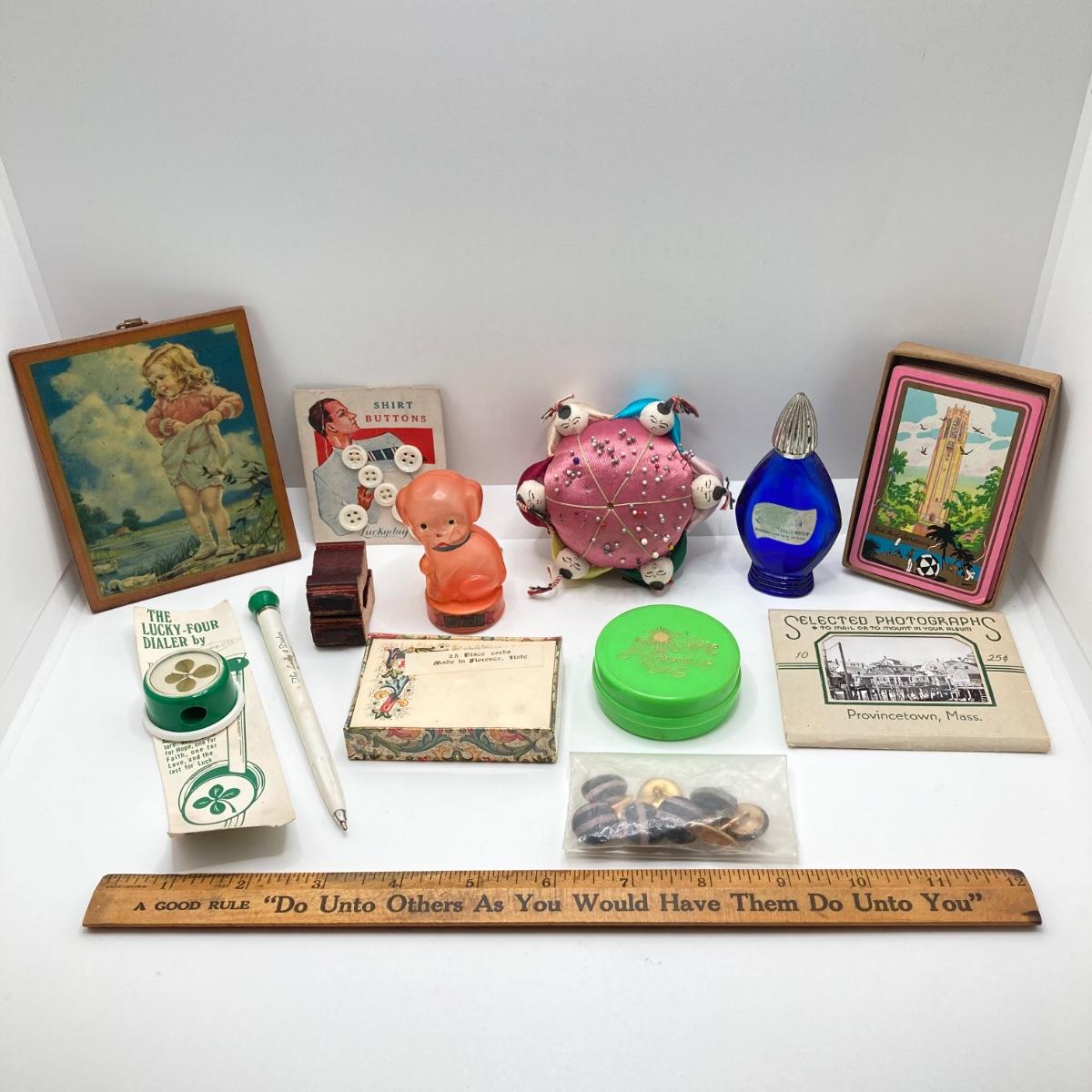 LOT 184: Vintage Collection - Celluloid Tape Measure (Camp, Le Jeune), Pin Cushion, Atlantic City Pill Holder, Perfume Bottle, Mabel Rollins Harris Picture, Bok Bird Sanctuary Playing Cards and More