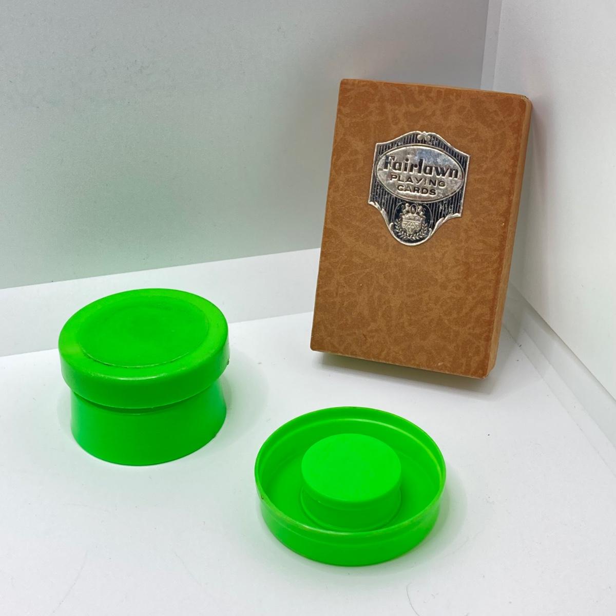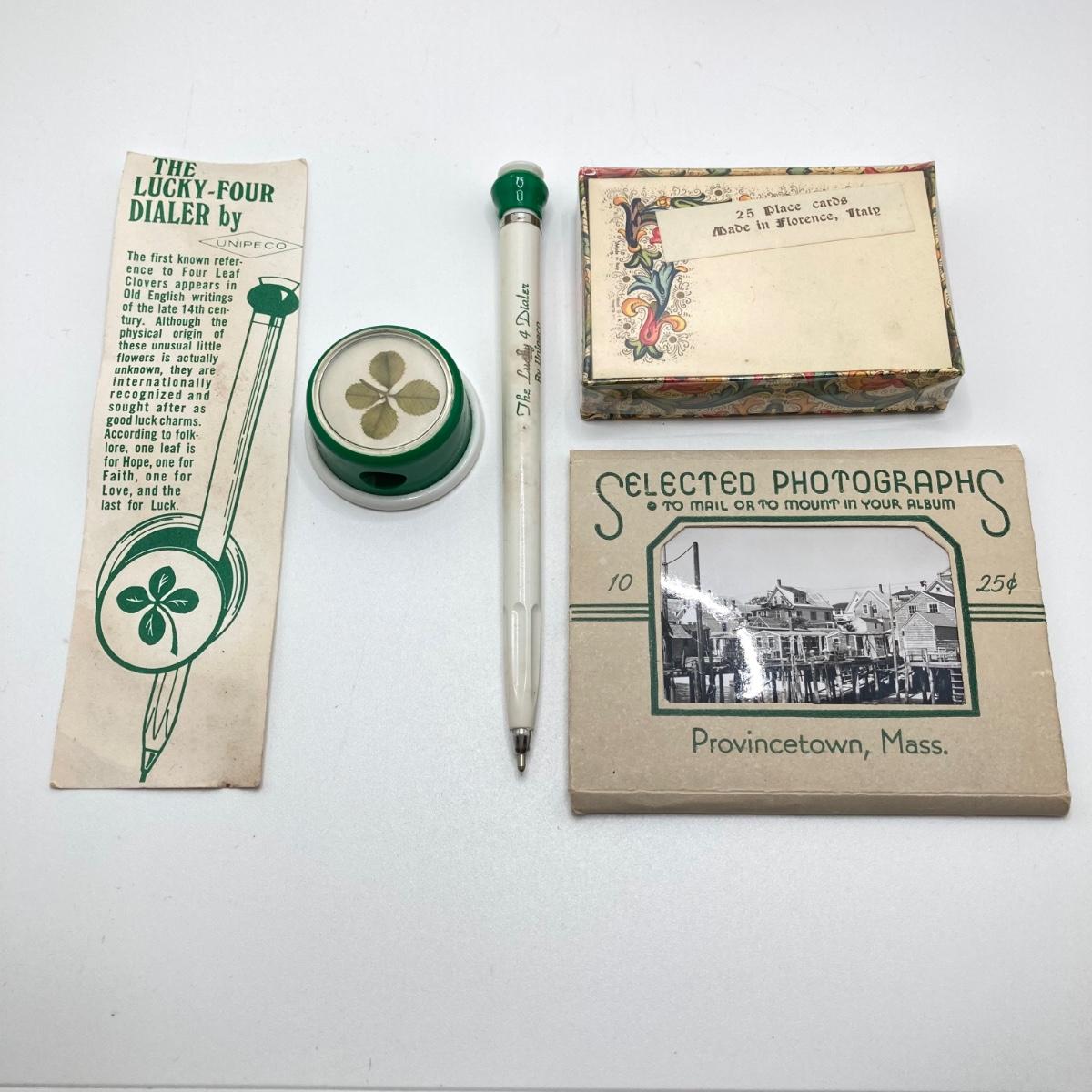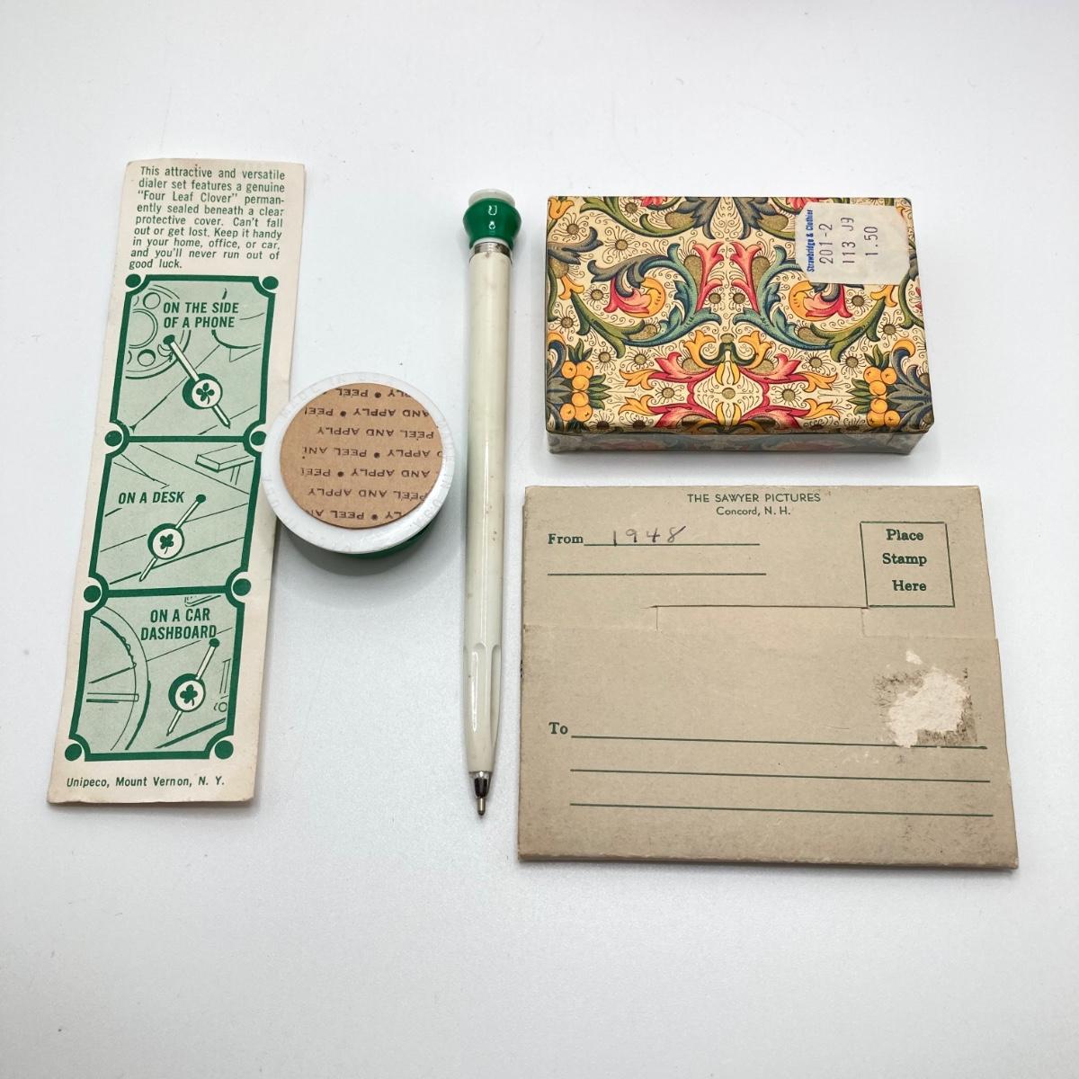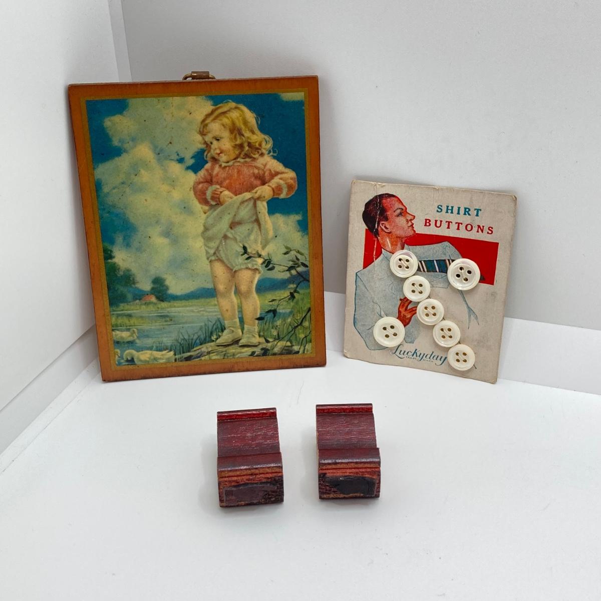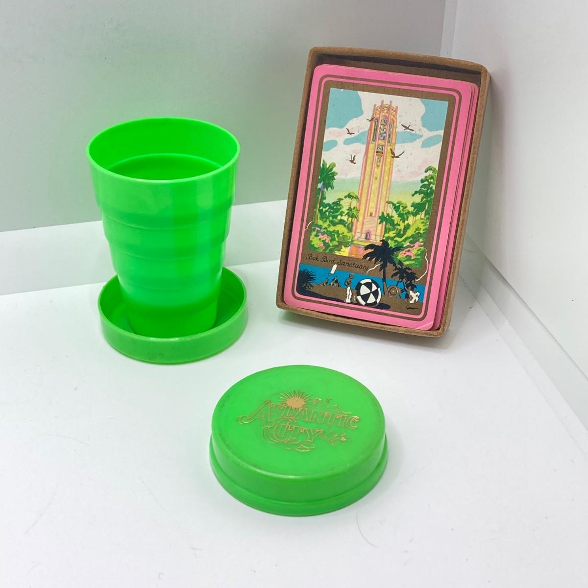 LOT 184: Vintage Collection - Celluloid Tape Measure (Camp, Le Jeune), Pin Cushion, Atlantic City Pill Holder, Perfume Bottle, Mabel Rollins Harris Picture, Bok Bird Sanctuary Playing Cards and More