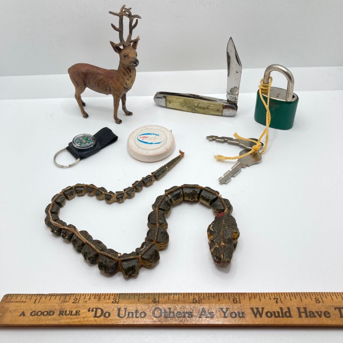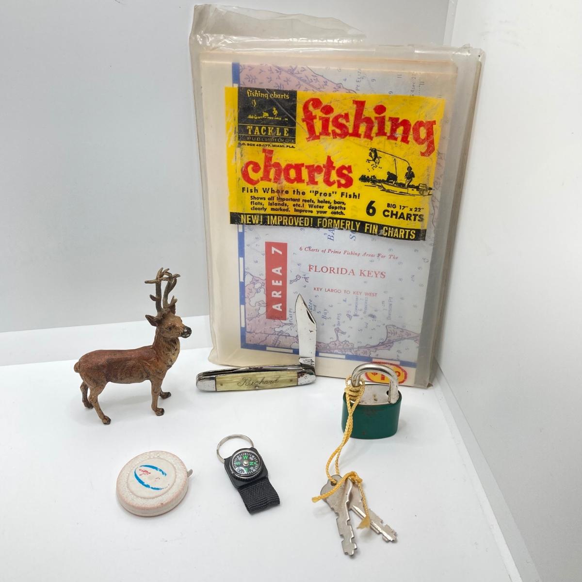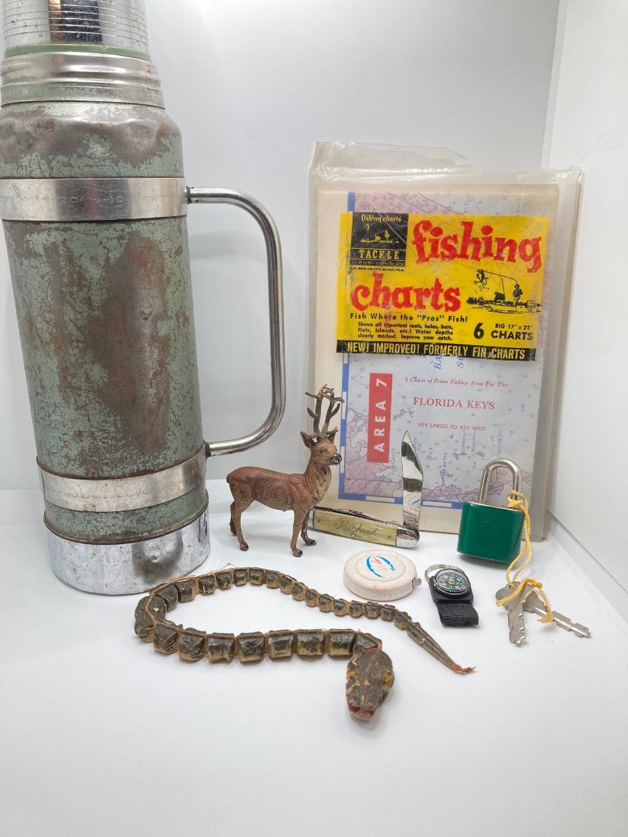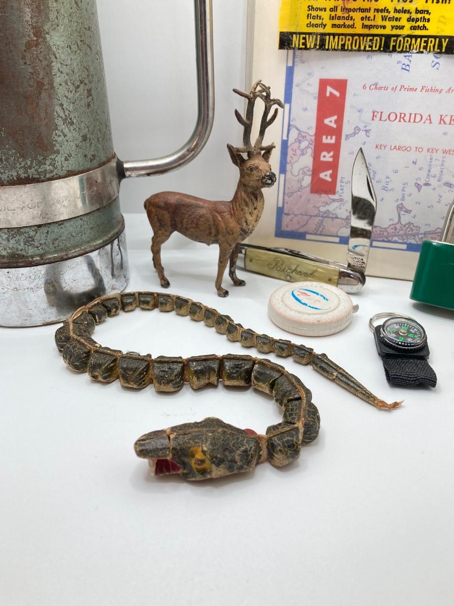 LOT 186: Vintage Sporting Goods Collection - Cast Iron Reindeer / Buck Figurine Made in Germany, Articulated Snake, Fishing Charts, Stanley Aladdin Thermos, Folding Pocket Knife and More