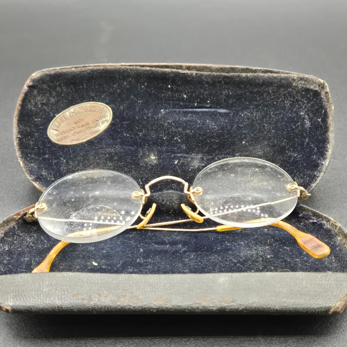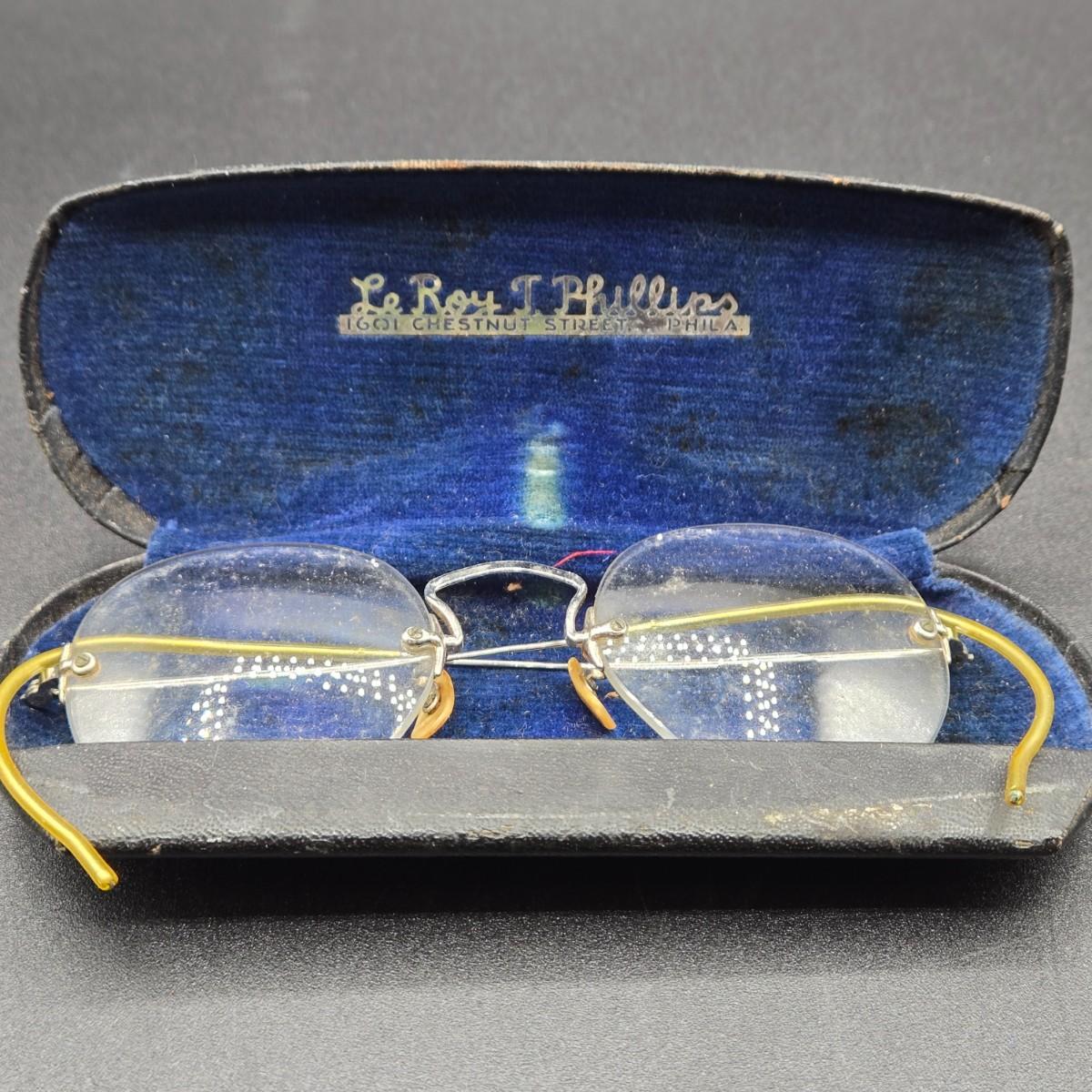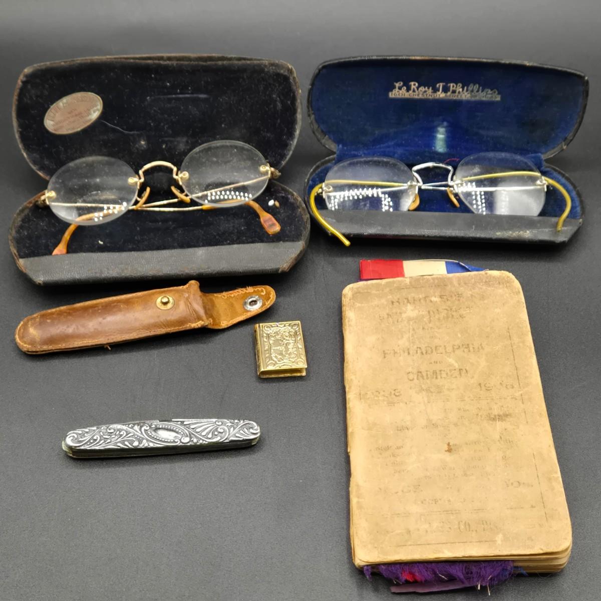 LOT 22J: Two Pairs of Antique Rimless Eyeglasses in Cases, WH Morley & Sons Pocket Knife with Case, Tiny Book Locket, and More