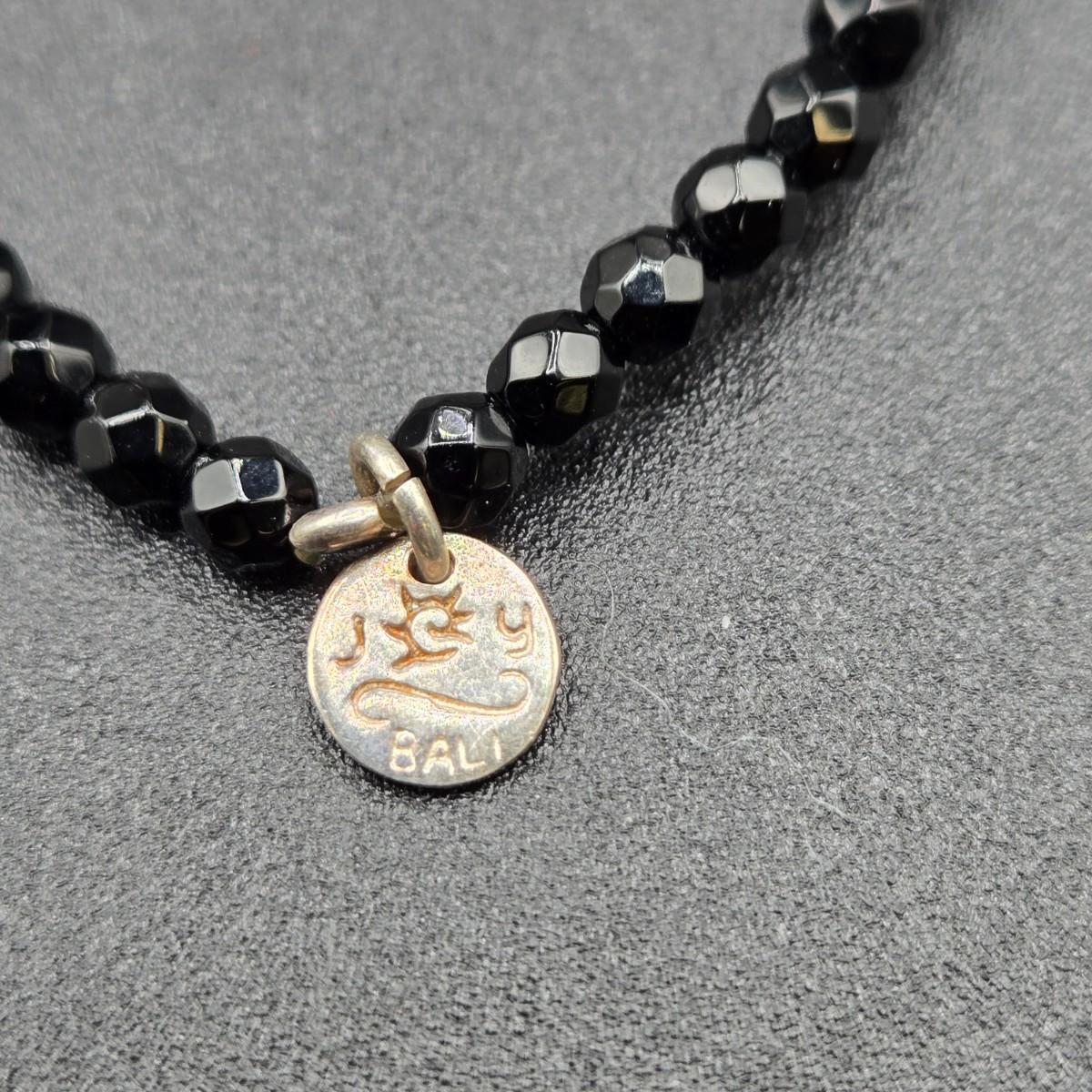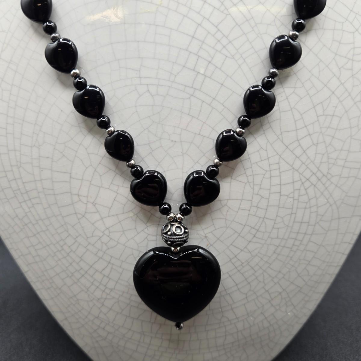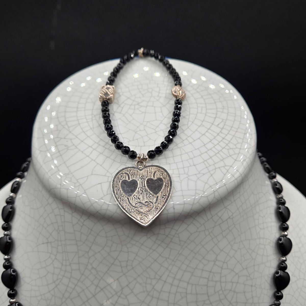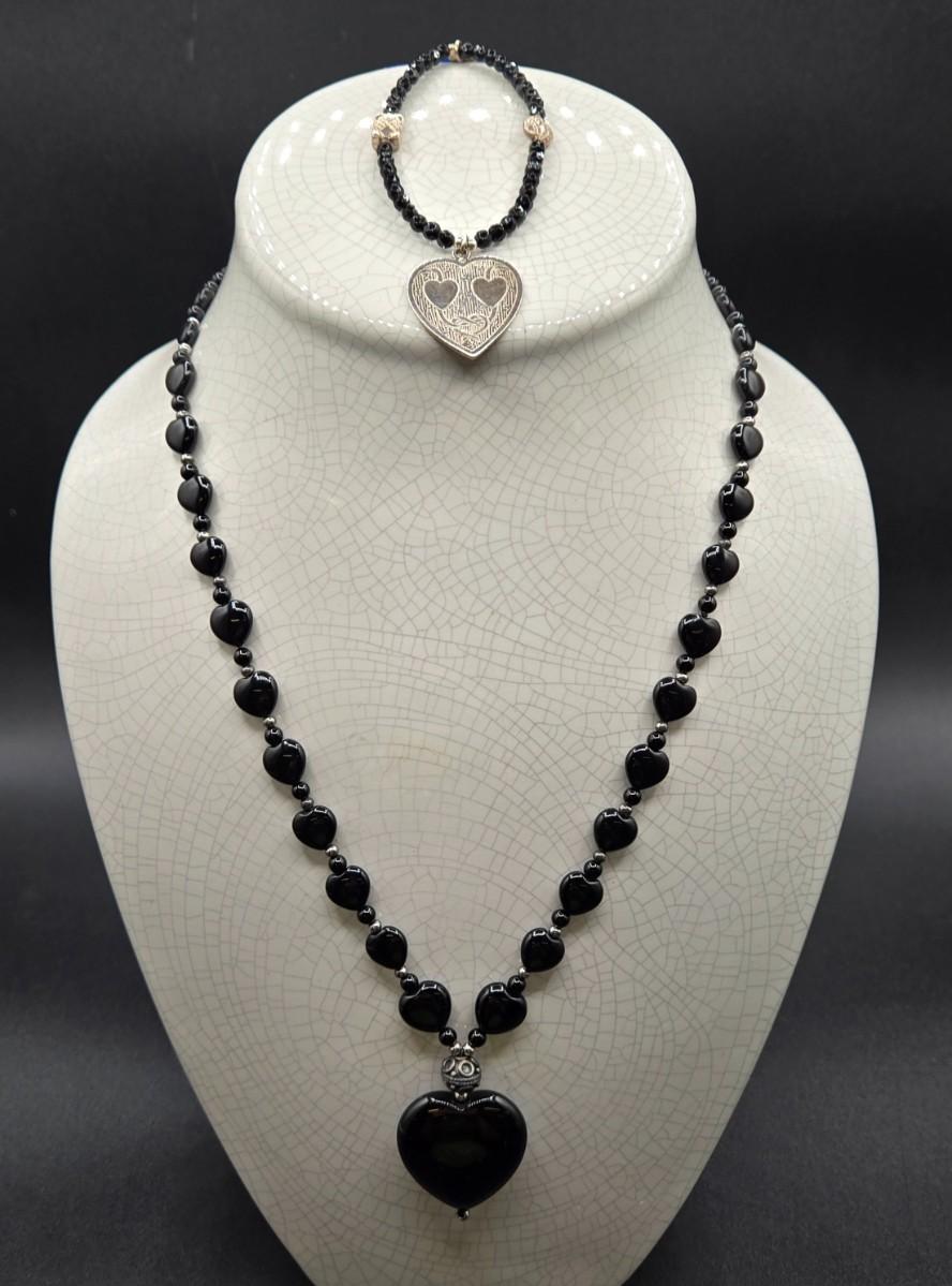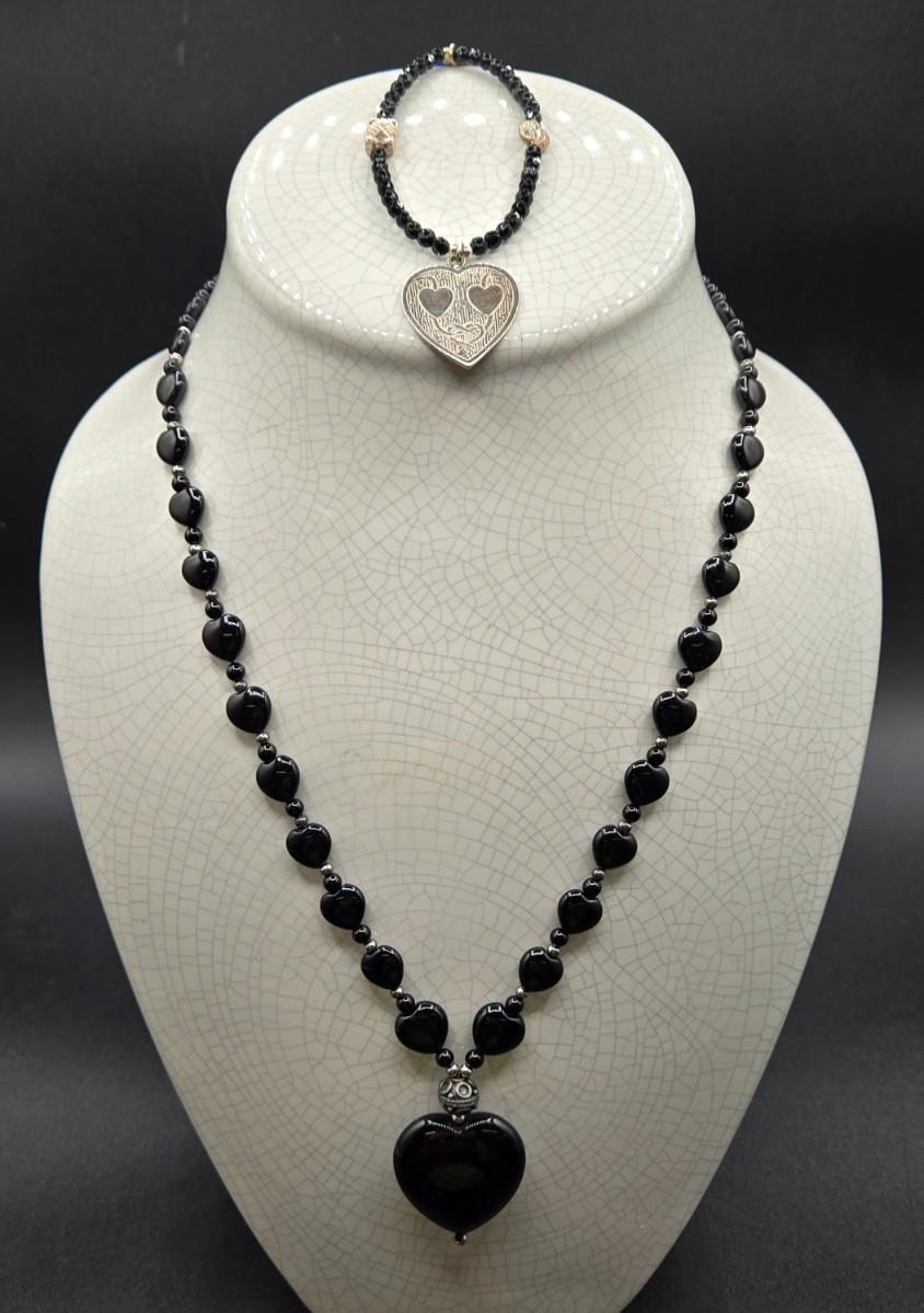 LOT 26J: Black Bead and Sterling Heart Necklace and Bracelet Set