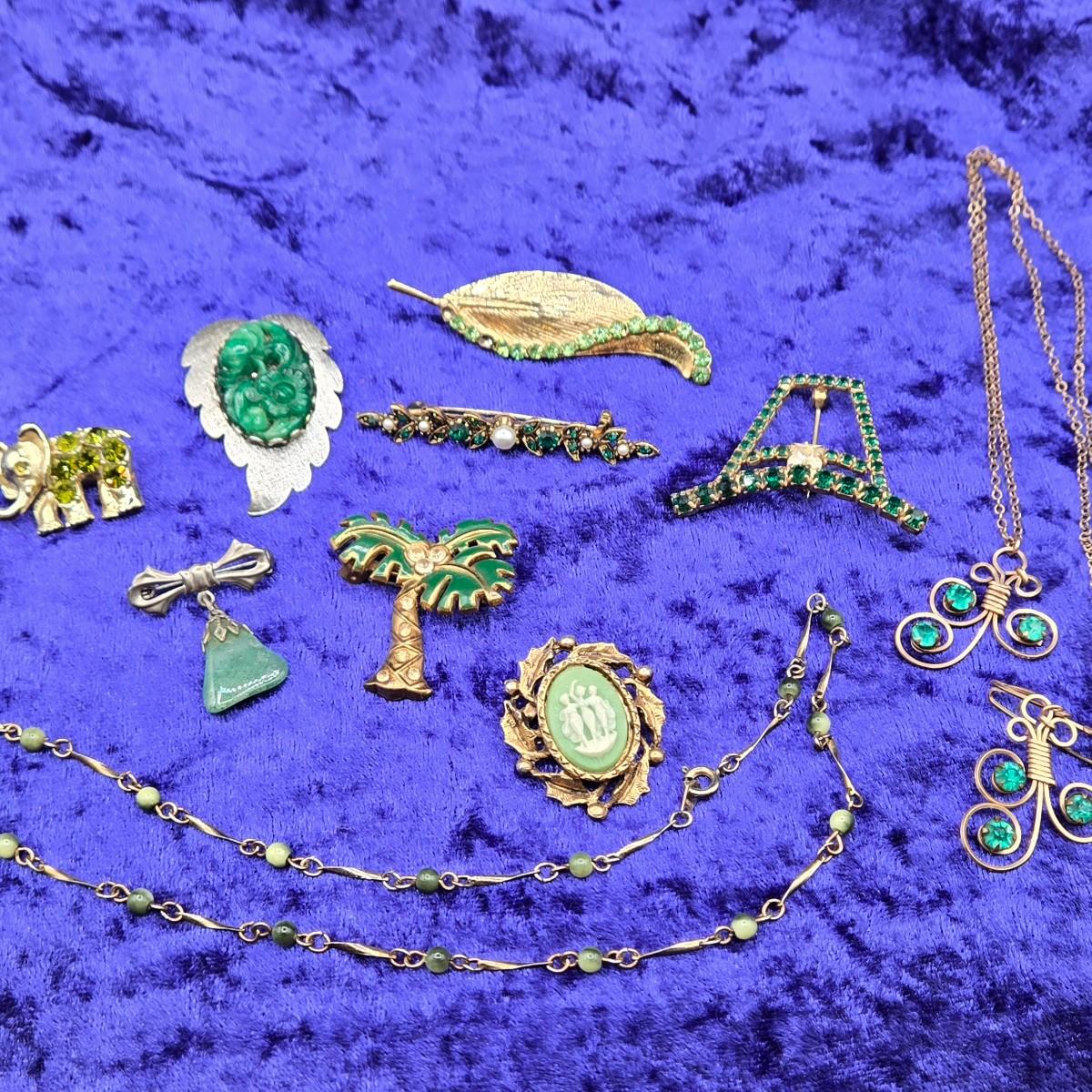 LOT 53J: Vintage Wire Scroll Work 18 Inch Necklace & Pin with Teal Stones, Elephant Pin, Palm Tree Pin, Leaf Pins, and More