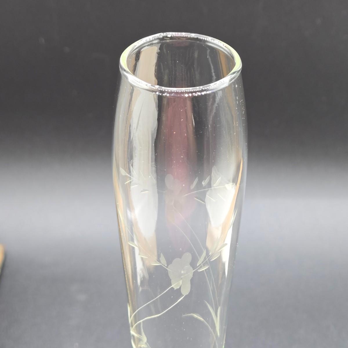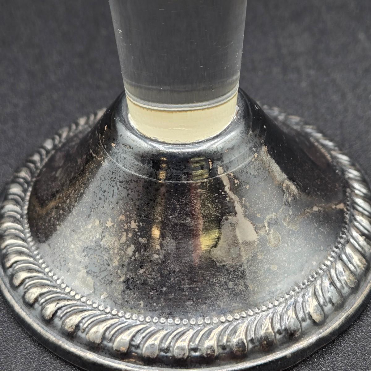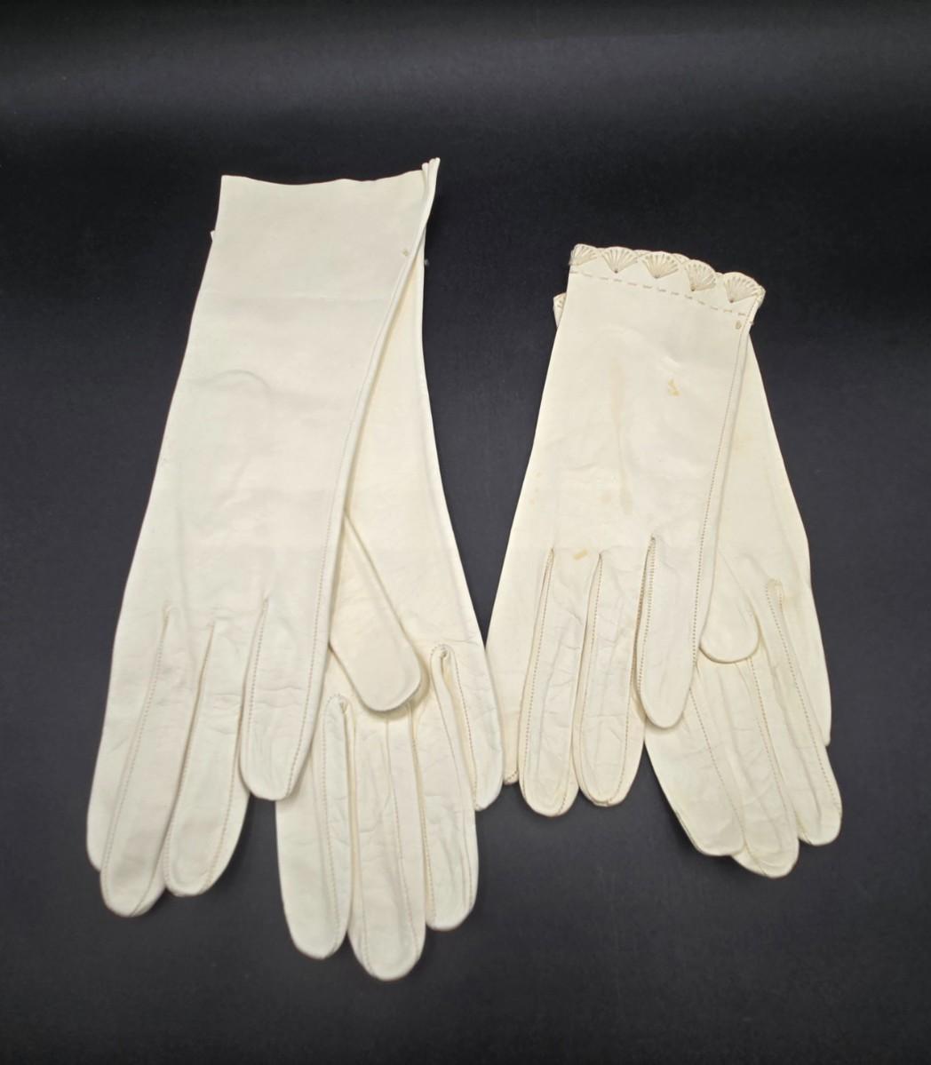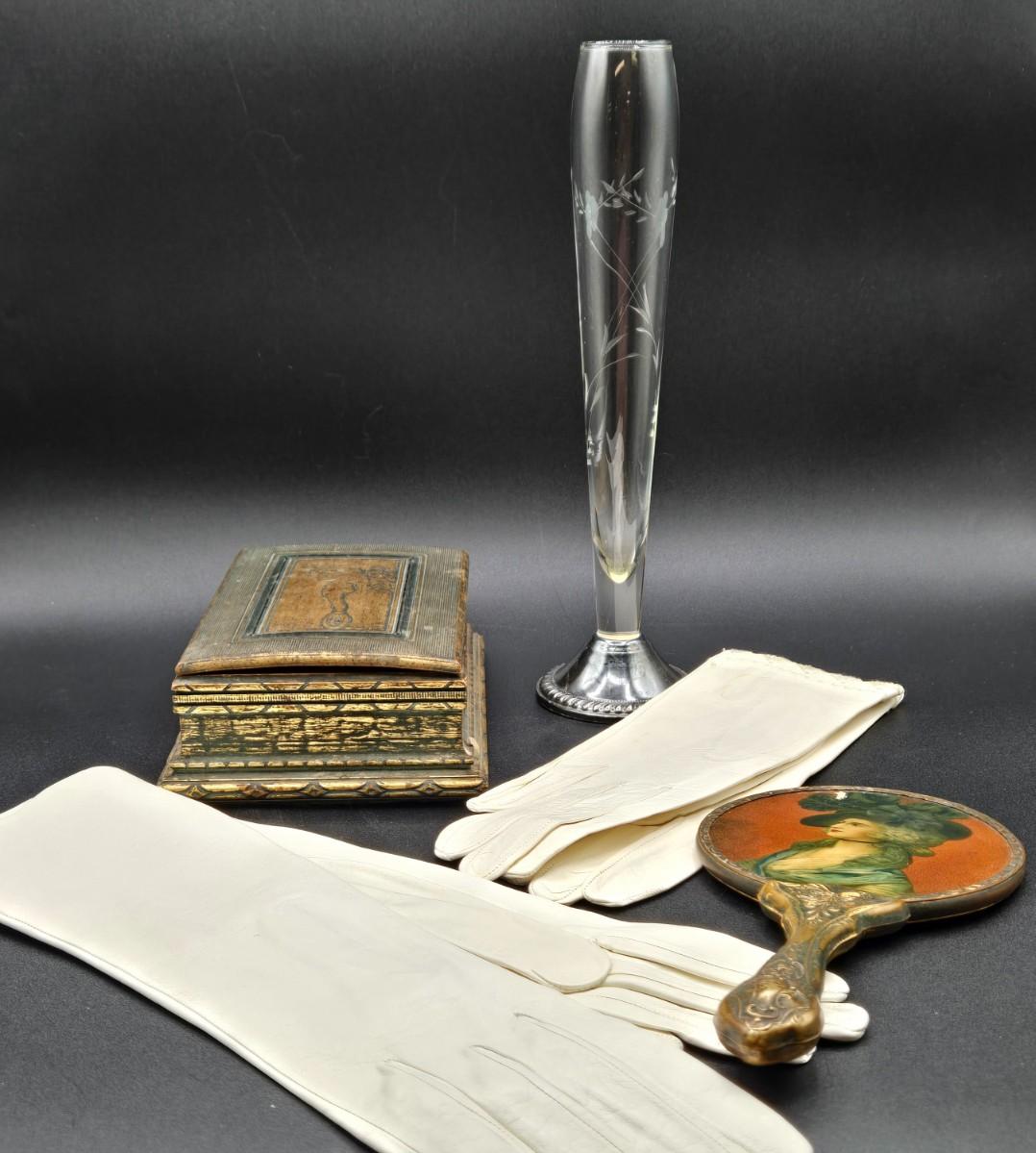 LOT 81: Mid Century Duchin Creation Etched Glass Bud Vase with Weighted Sterling Base, Vintage Faux Burlwood Card Holder, Two Pair of White Leather Gloves, and Vanity Hand Mirror