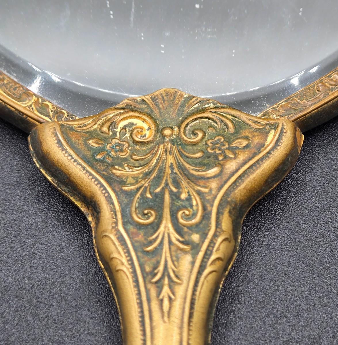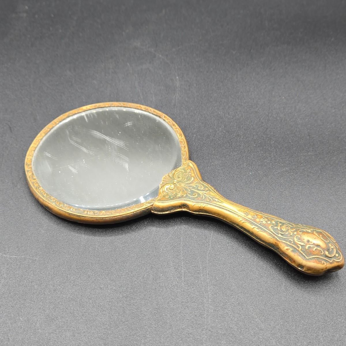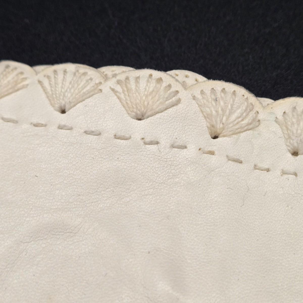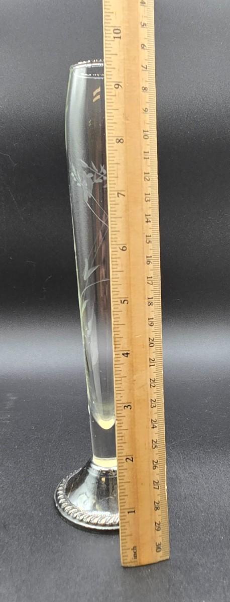 LOT 81: Mid Century Duchin Creation Etched Glass Bud Vase with Weighted Sterling Base, Vintage Faux Burlwood Card Holder, Two Pair of White Leather Gloves, and Vanity Hand Mirror