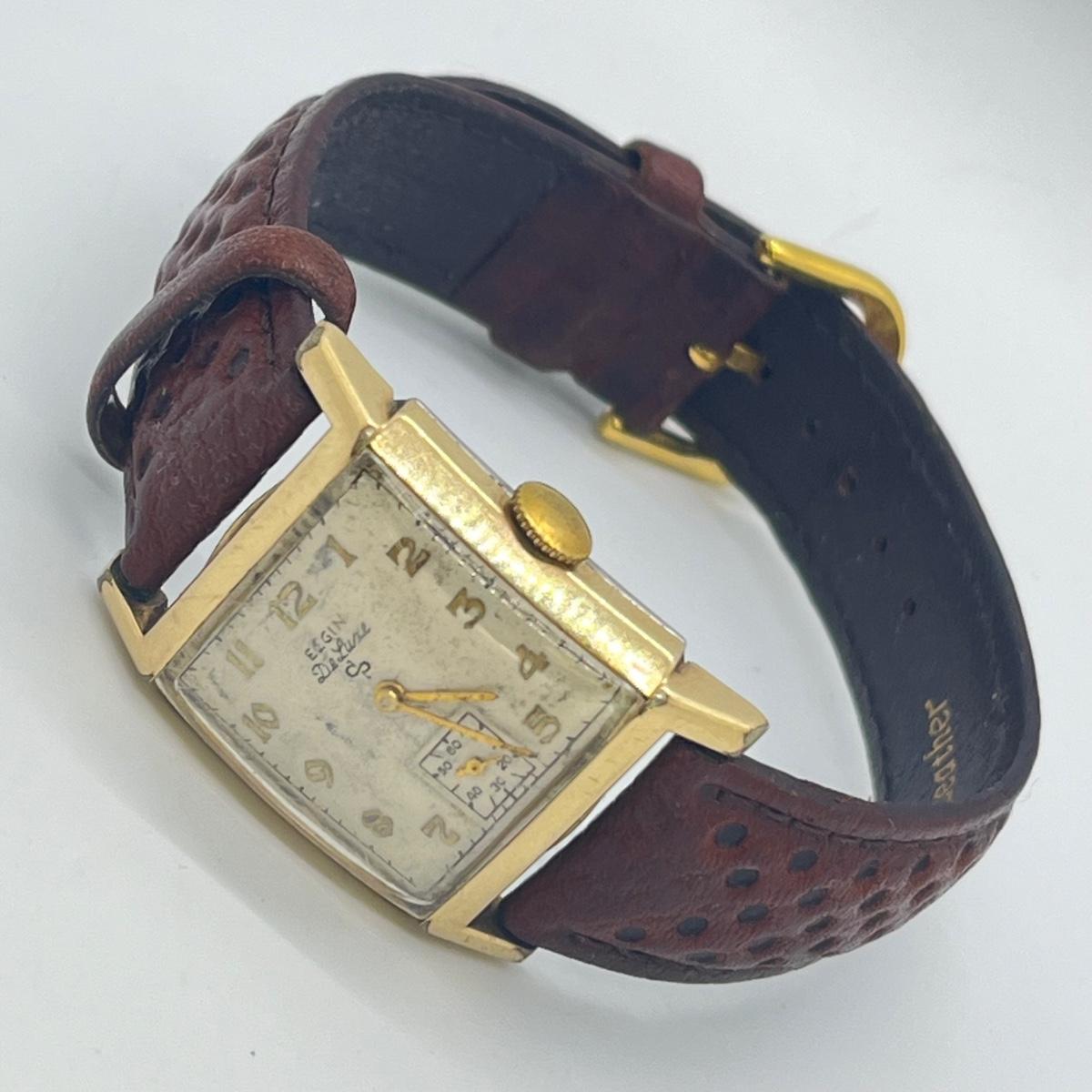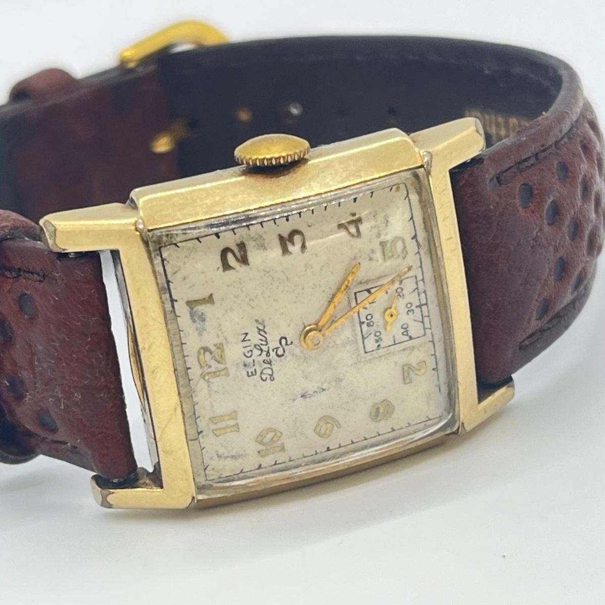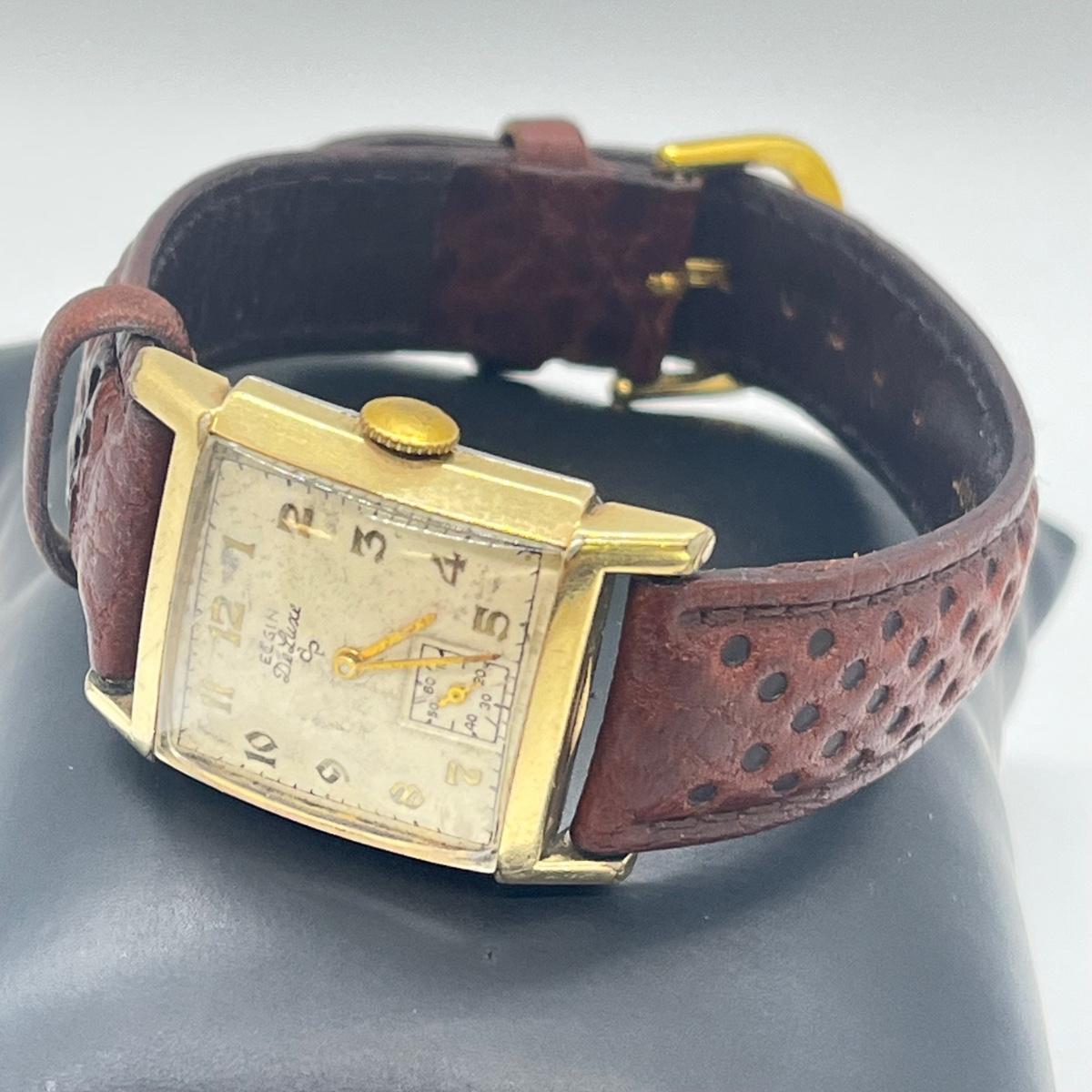 LOT 122: Vintage Elgin DeLuxe Men's Watch w/ 10K Gold Filled Bezel and Leather Band - Winds and Ticks