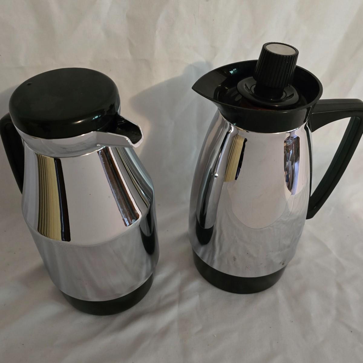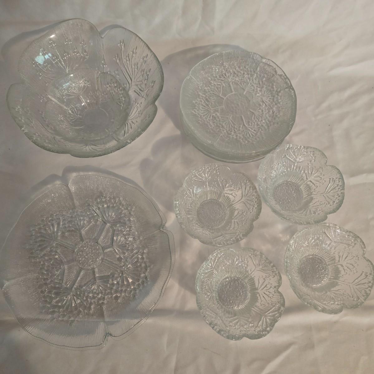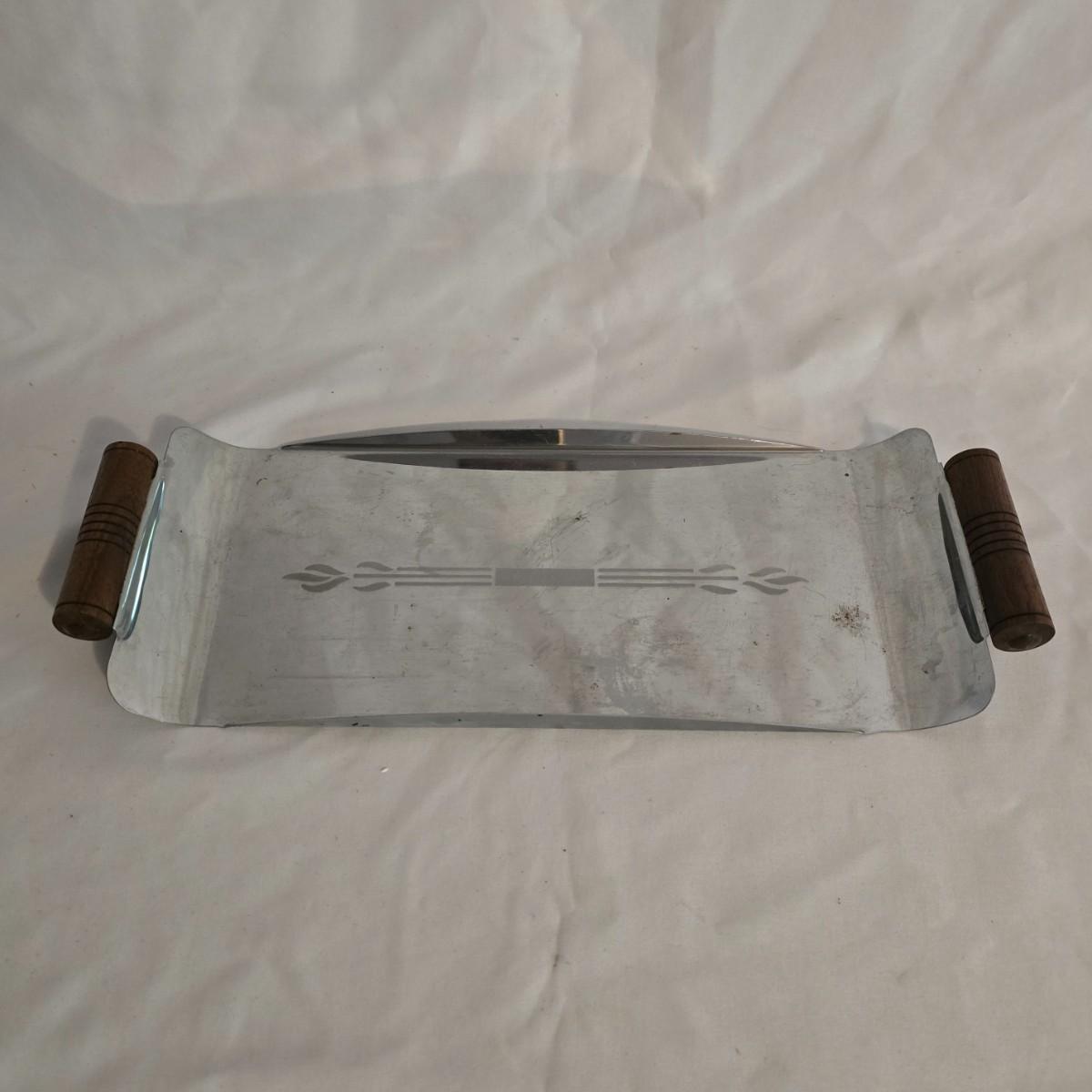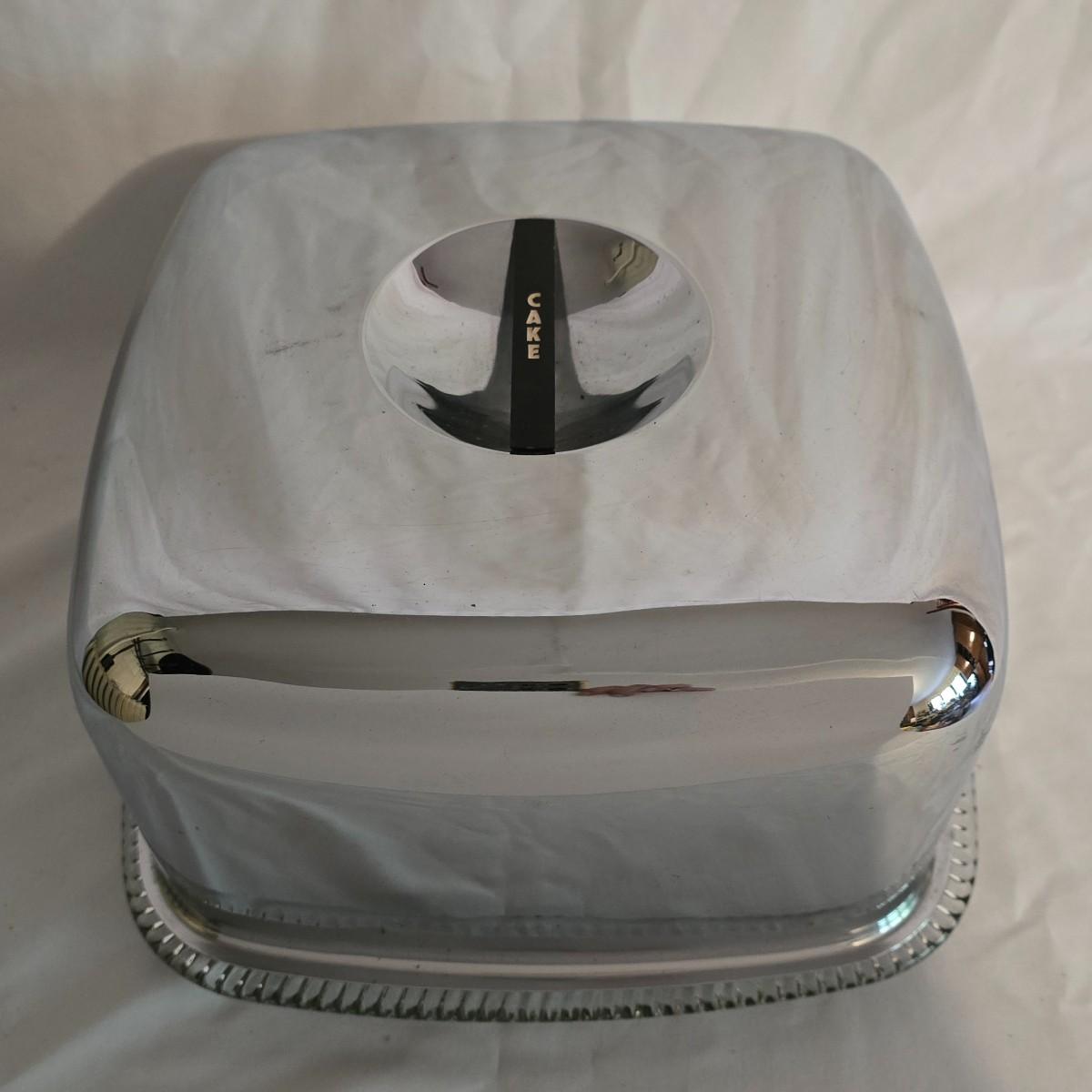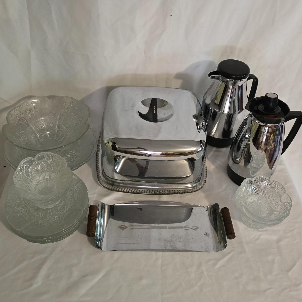LOT 11: MCM Chrome Cake Platter with Chrome Carafes and Glass Bowls and Plates