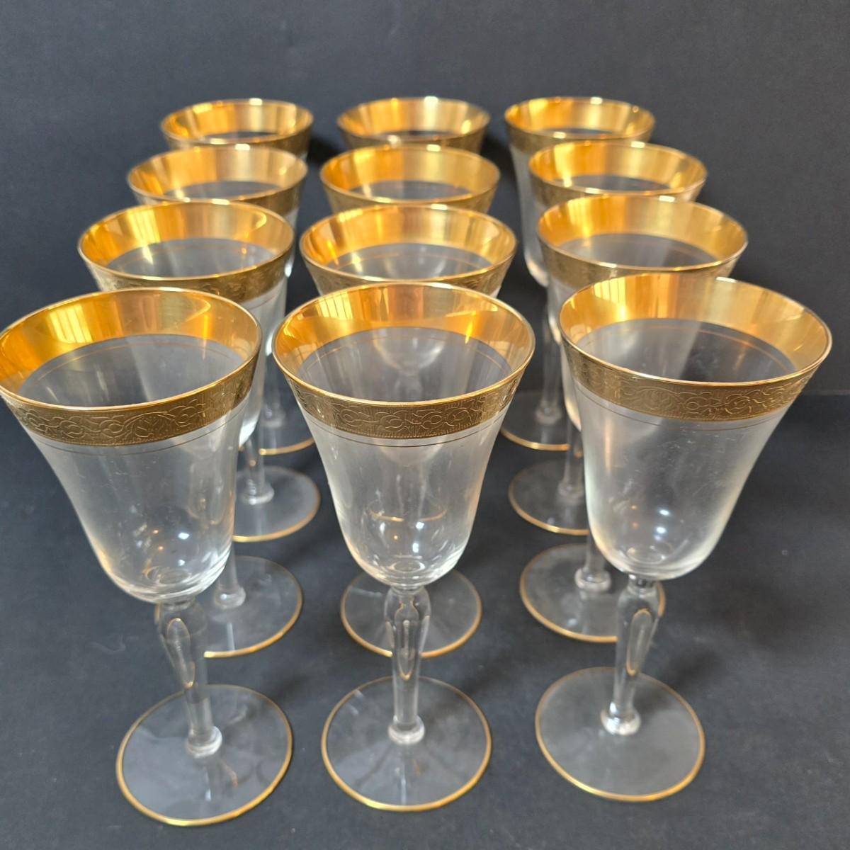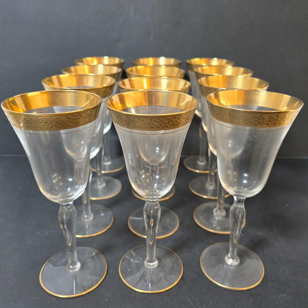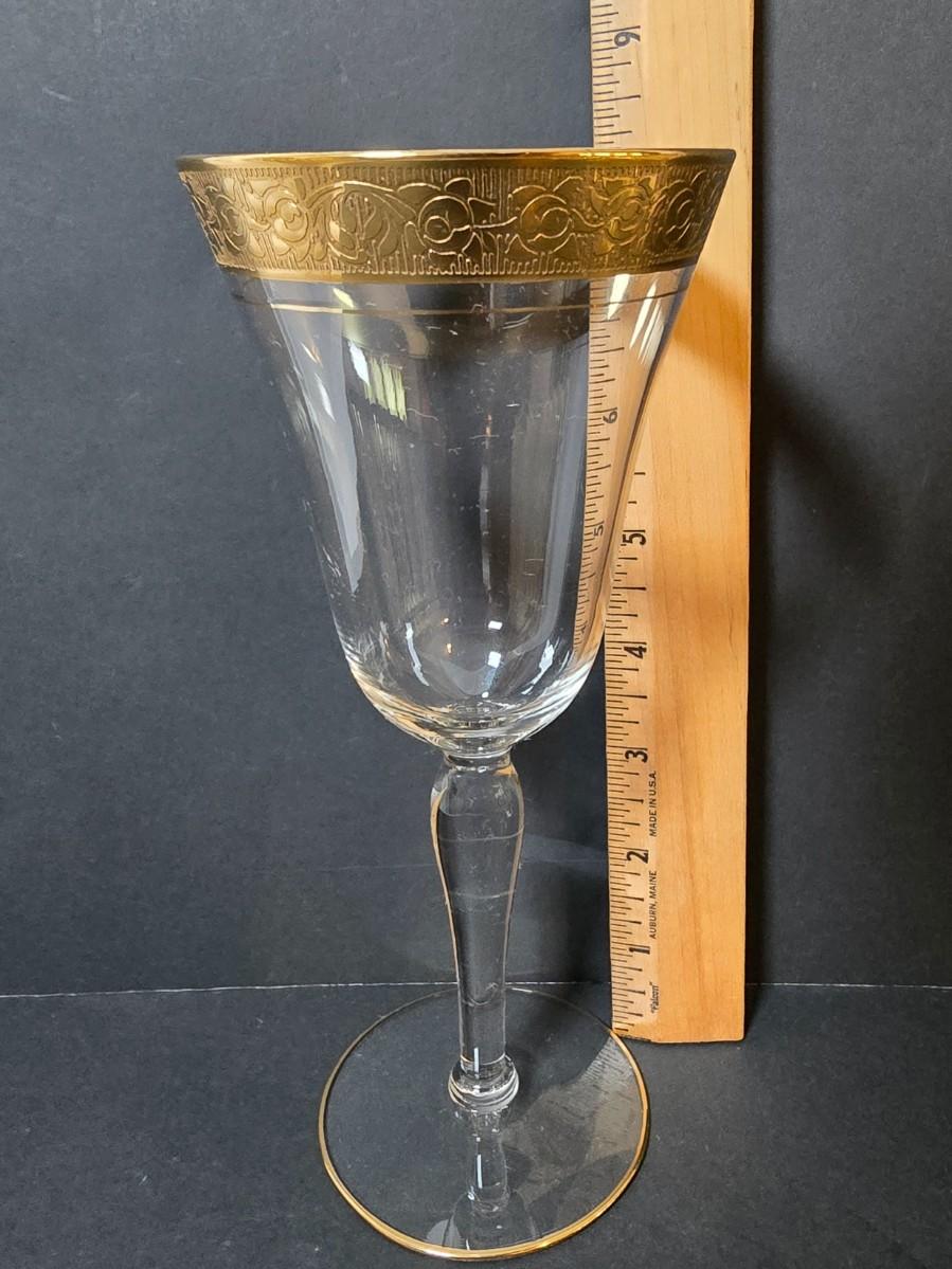 LOT 20: Gold Rimmed Crystal Stem Glasses, Set of 12, 8" tall