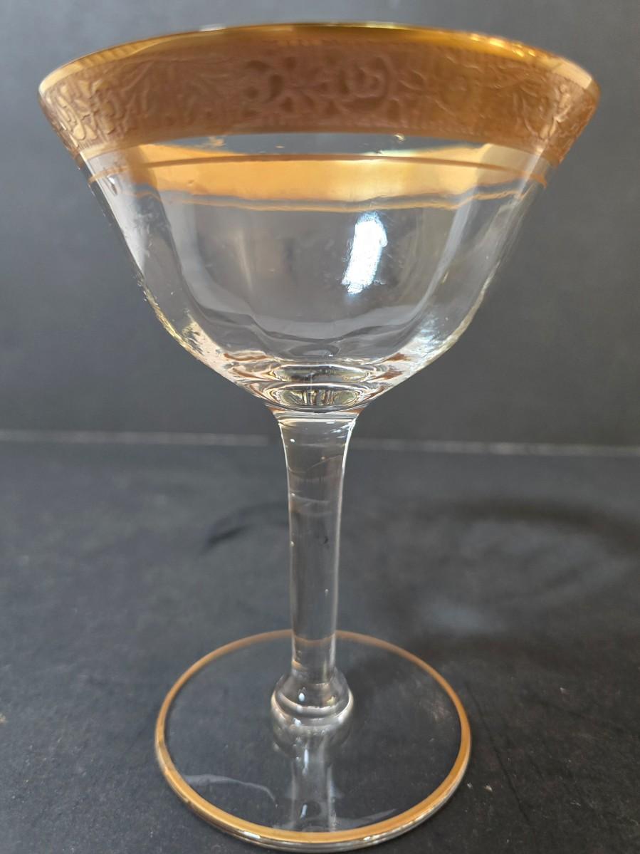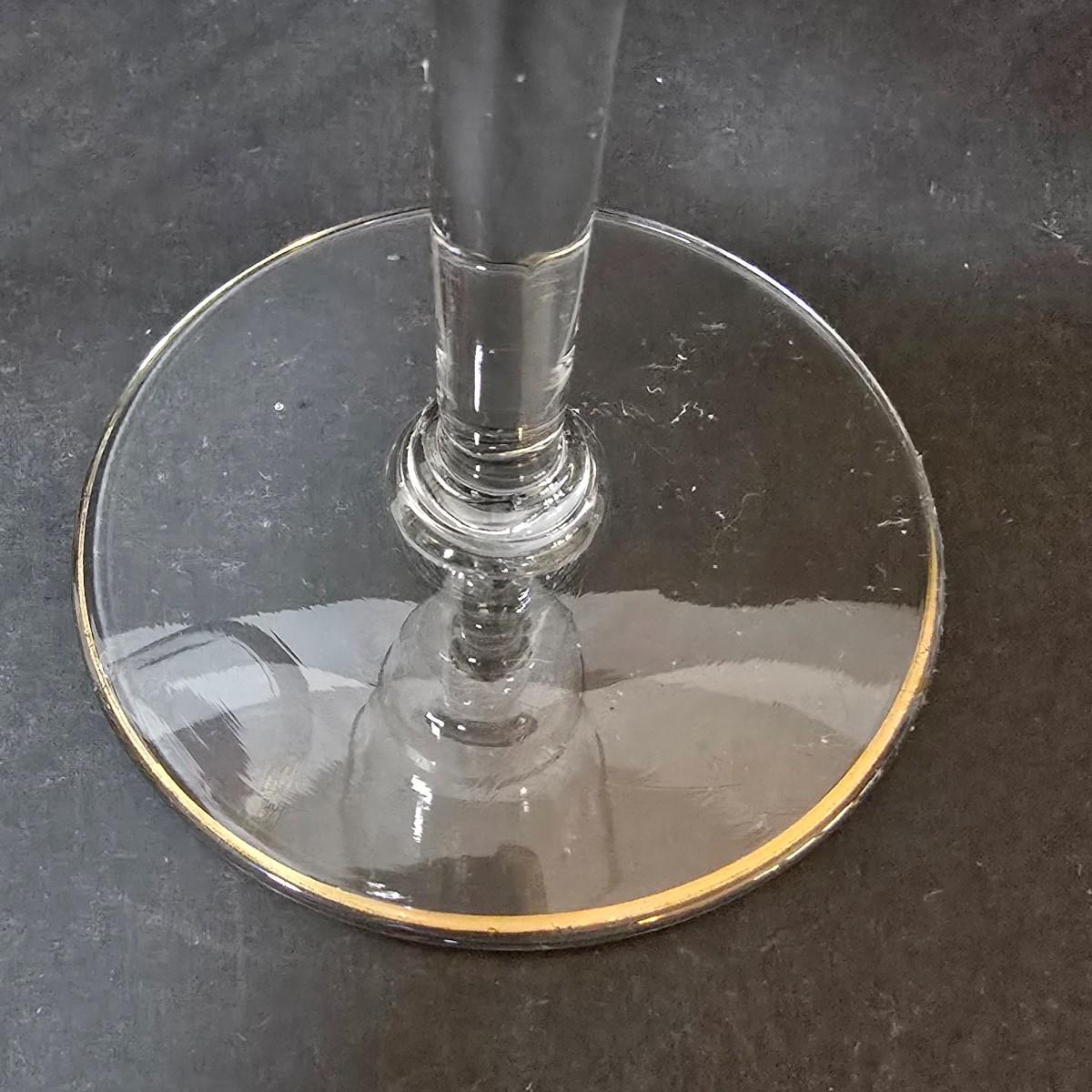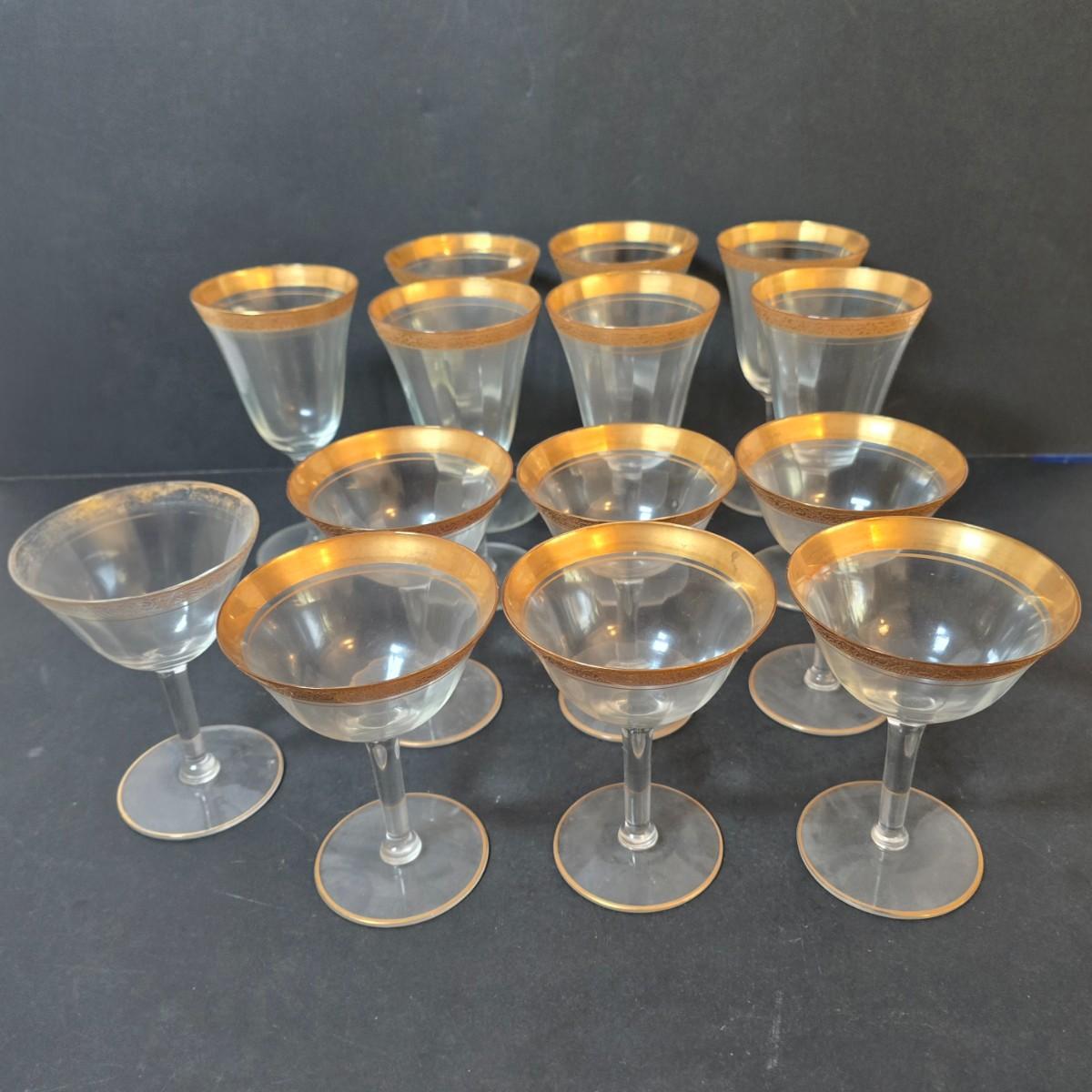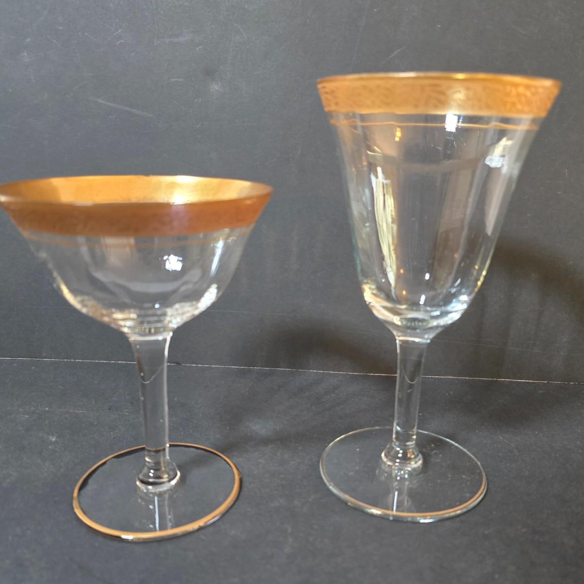 LOT 21: Gold Rimmed Crystal Stem Glasses, Two sets of 7