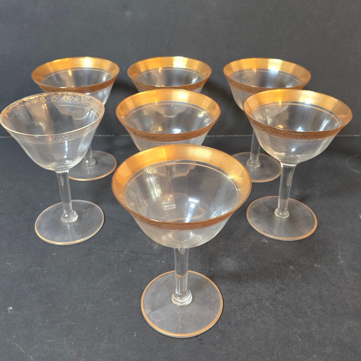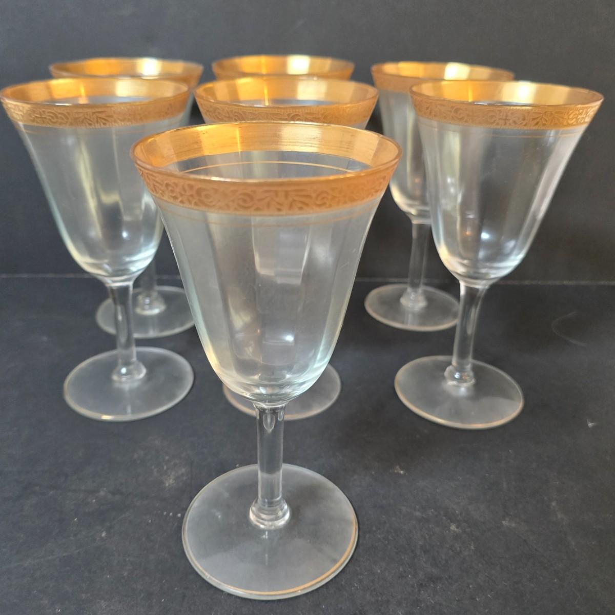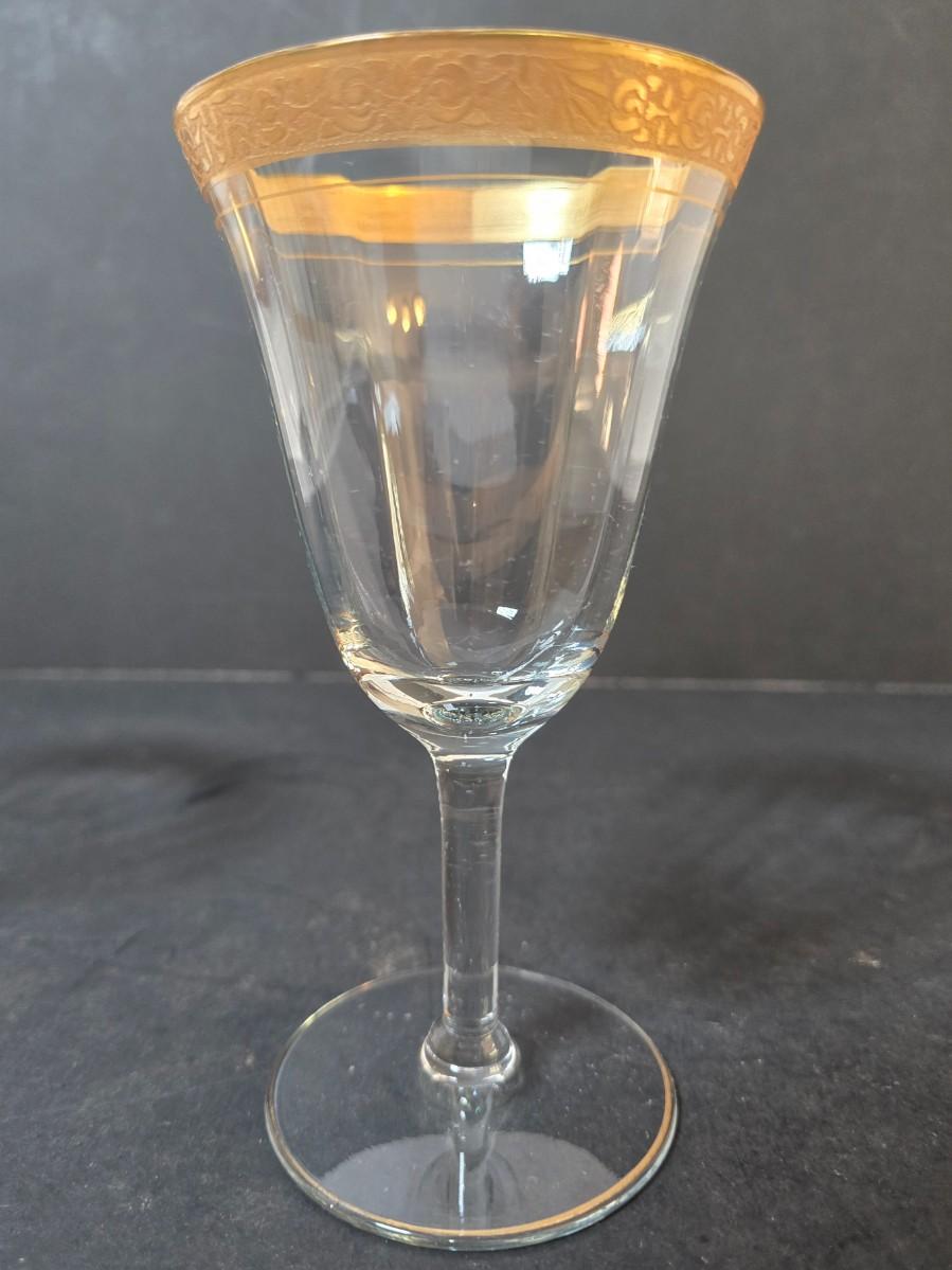 LOT 21: Gold Rimmed Crystal Stem Glasses, Two sets of 7